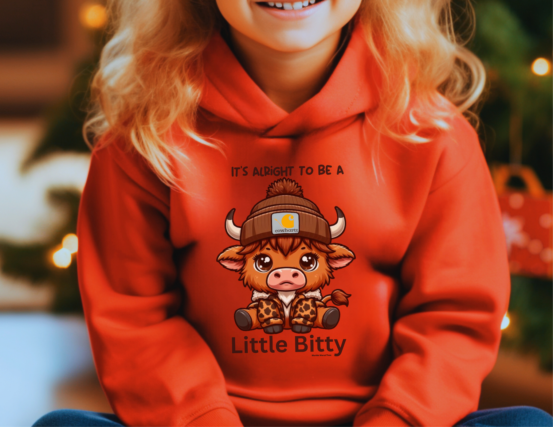 A Little Bitty Toddler Hoodie featuring a cartoon cow design, with durable jersey-lined hood and cover-stitched details for cozy comfort. Perfect for kids' playtime adventures.