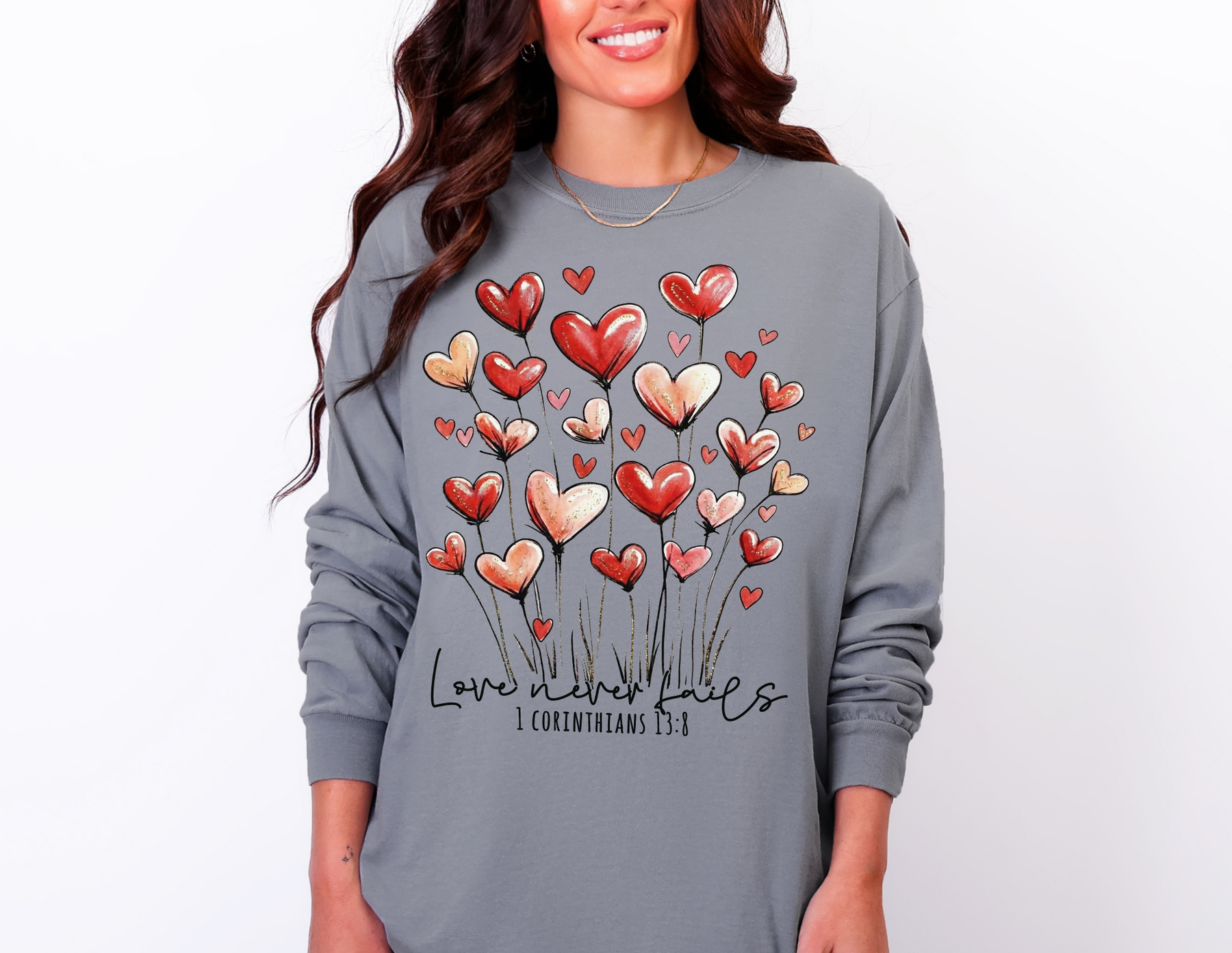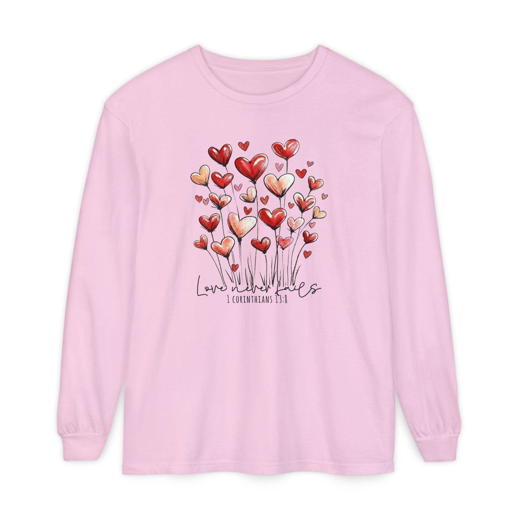 Love Never Fails Long Sleeve Tee featuring heart-shaped blooms and 1 Corinthians 13:8 text, made of soft, garment-dyed 100% ring-spun cotton.