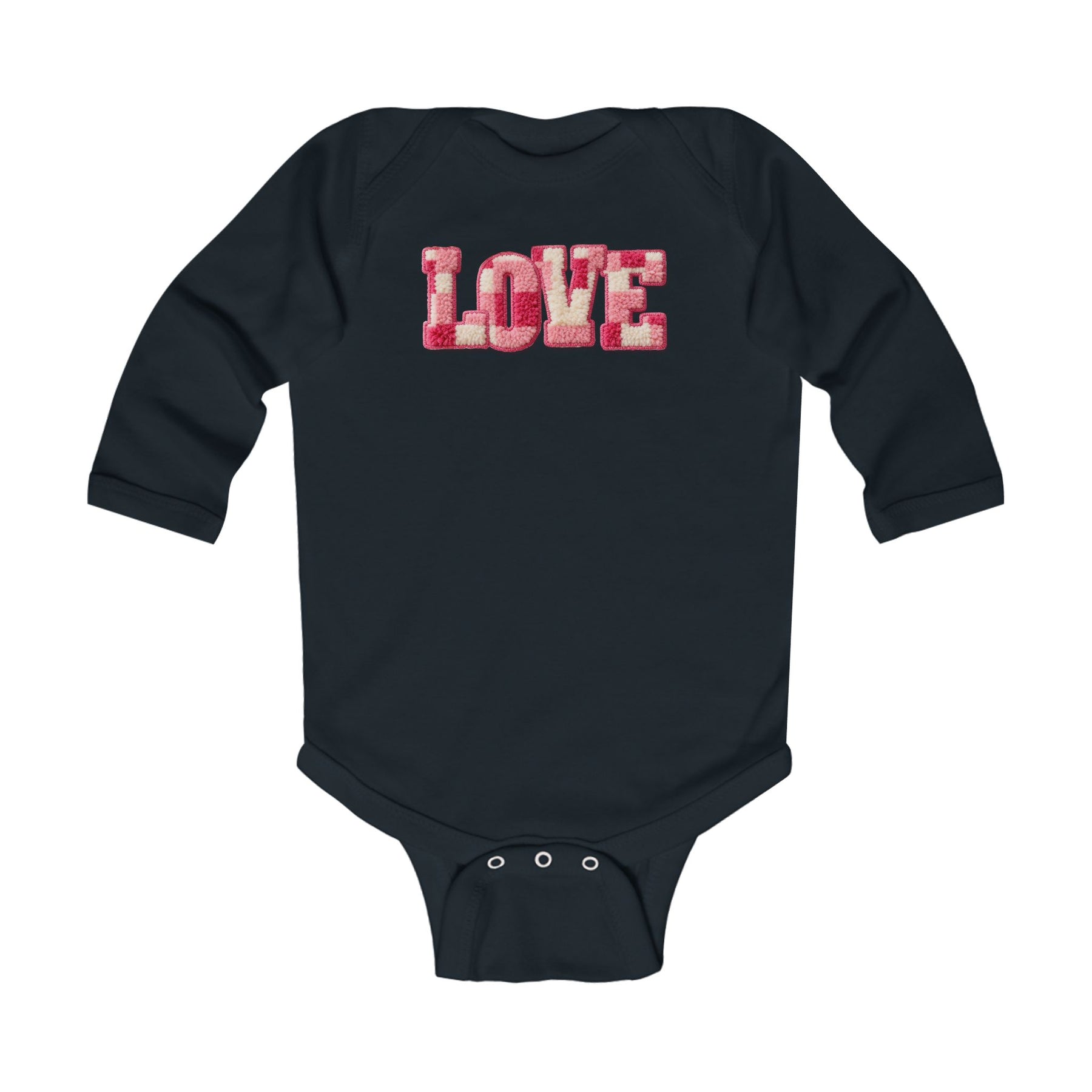 Love Onesie: Navy infant bodysuit with LOVE patch in pink and off-white, long sleeves, and snap closures for easy diaper changes. Soft, durable cotton fabric.