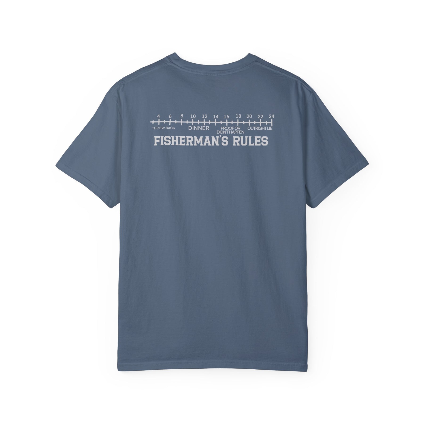 A Lucky Bones Fishing Club Tee, a back view of a blue t-shirt. 100% ring-spun cotton, garment-dyed for coziness. Relaxed fit, double-needle stitching for durability. No side-seams for a tubular shape.