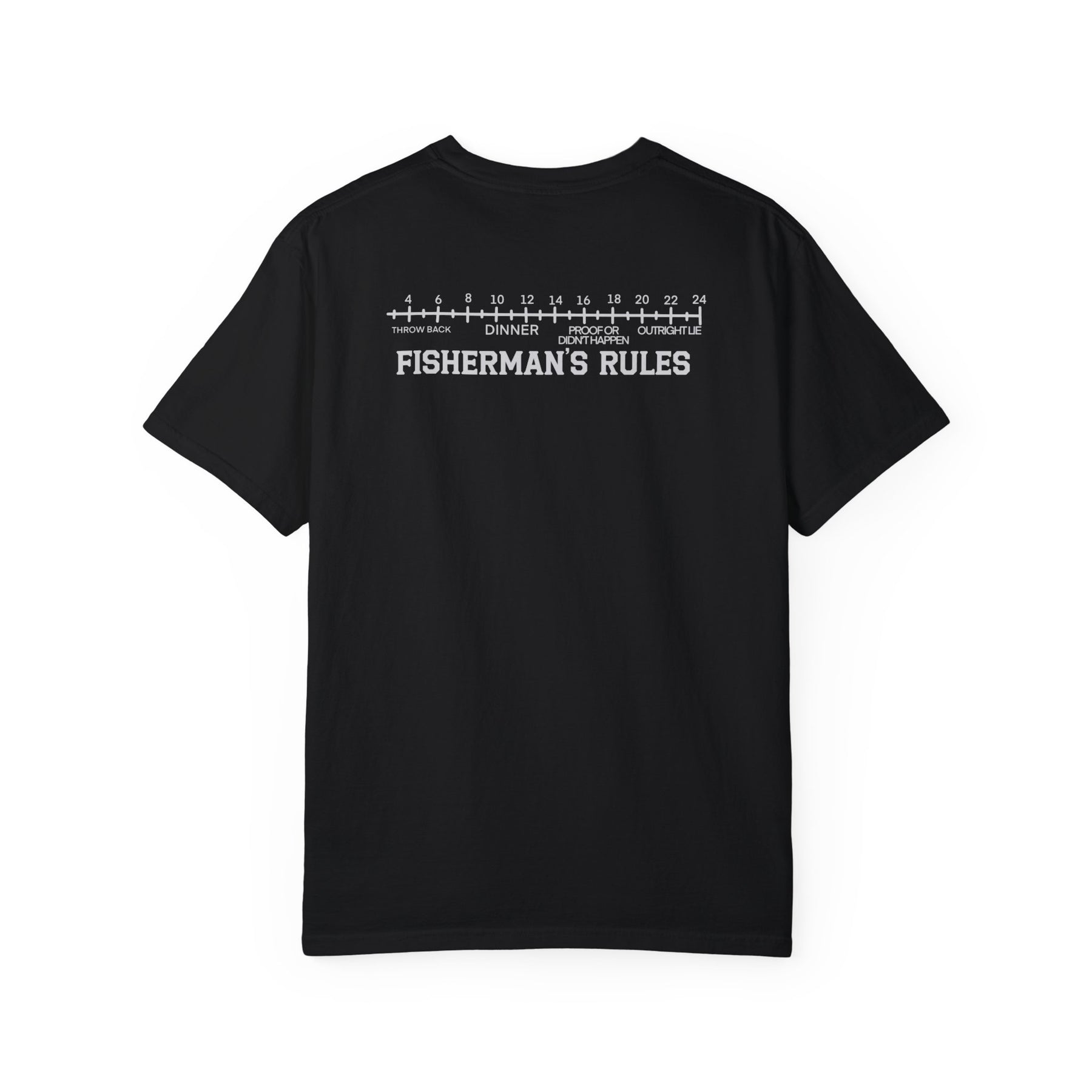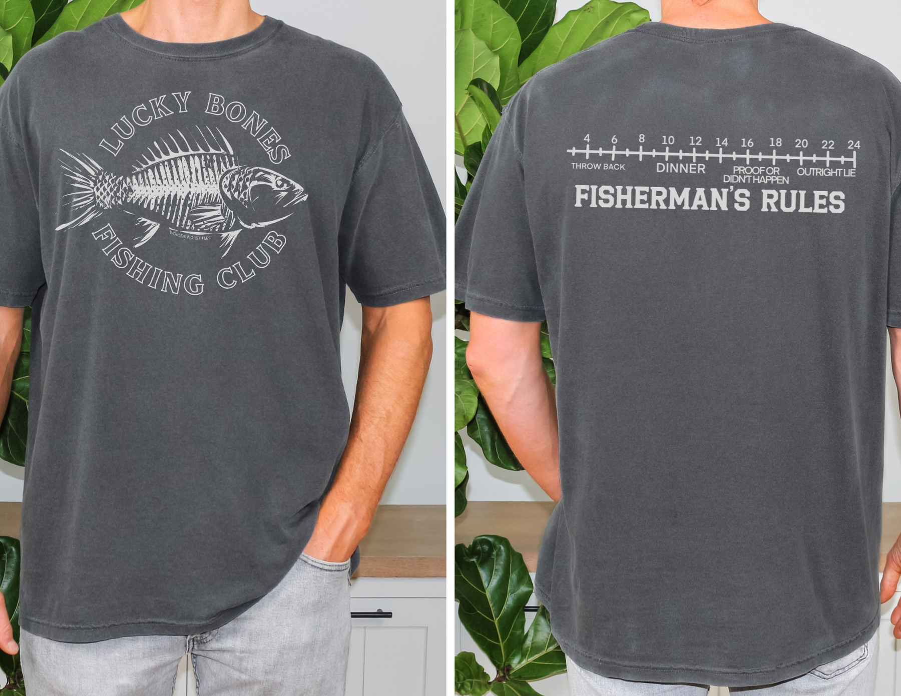 A Lucky Bones Fishing Club Tee: Garment-dyed, 100% ring-spun cotton shirt. Soft-washed for coziness, with a relaxed fit and durable double-needle stitching. No side-seams for a tubular shape.