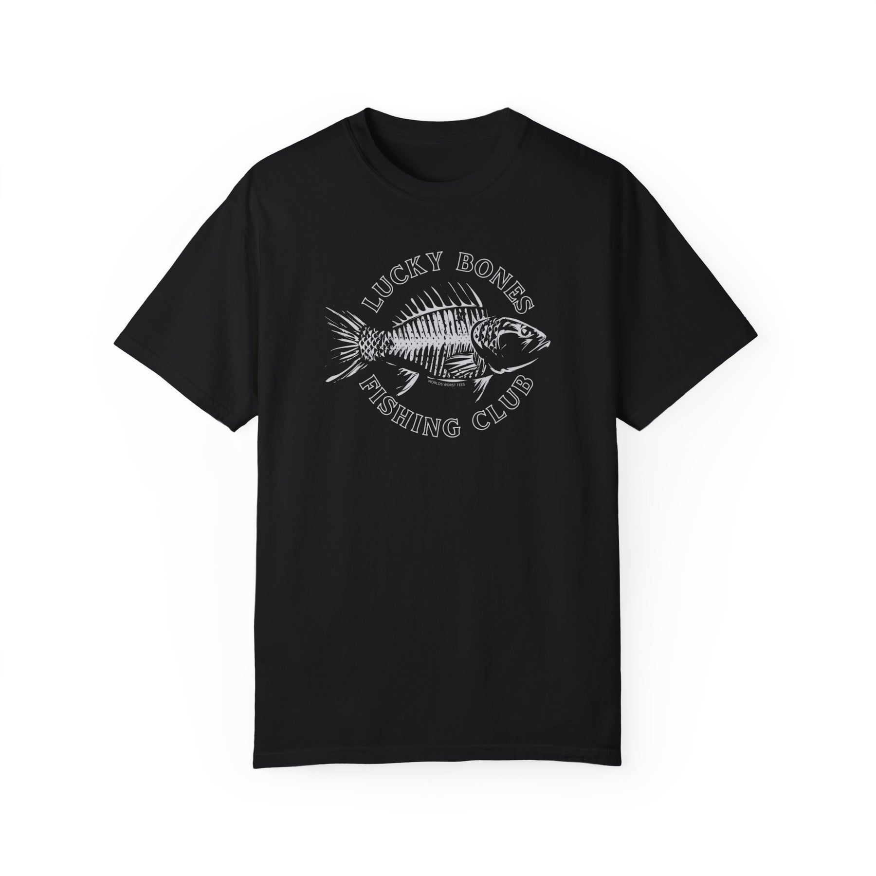 Alt text: Lucky Bones Fishing Club Tee: Black t-shirt with white text. 100% ring-spun cotton, garment-dyed for coziness. Relaxed fit, double-needle stitching for durability. No side-seams for a tubular shape.