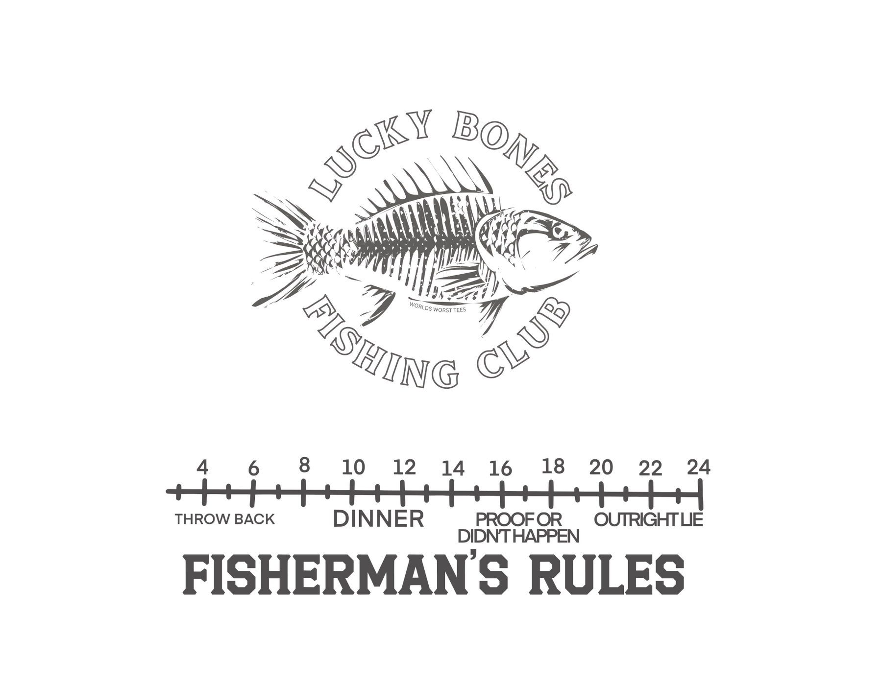A Lucky Bones Fishing Club Tee, a garment-dyed t-shirt made of 100% ring-spun cotton. Features a relaxed fit, double-needle stitching, and no side-seams for durability and comfort. From Worlds Worst Tees.
