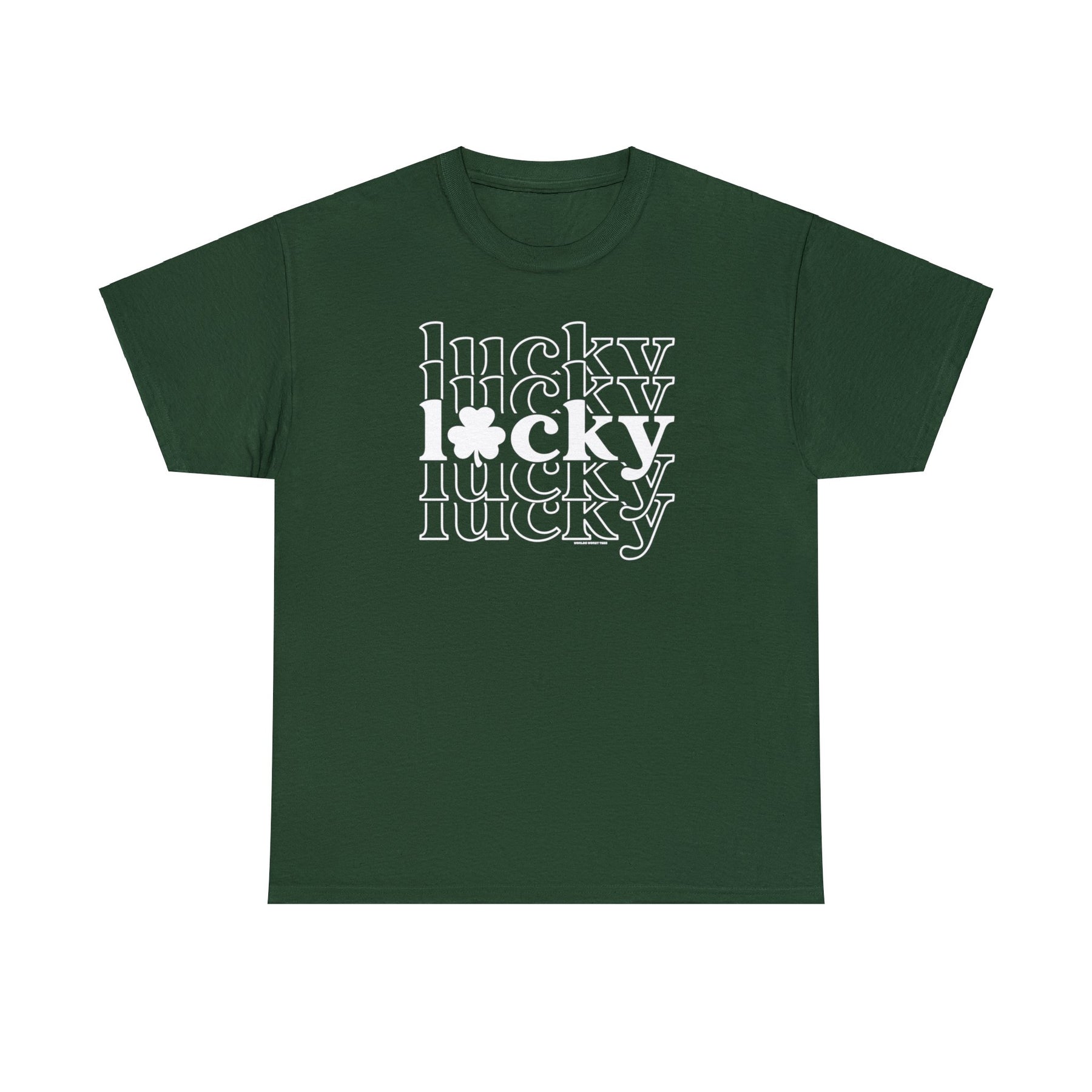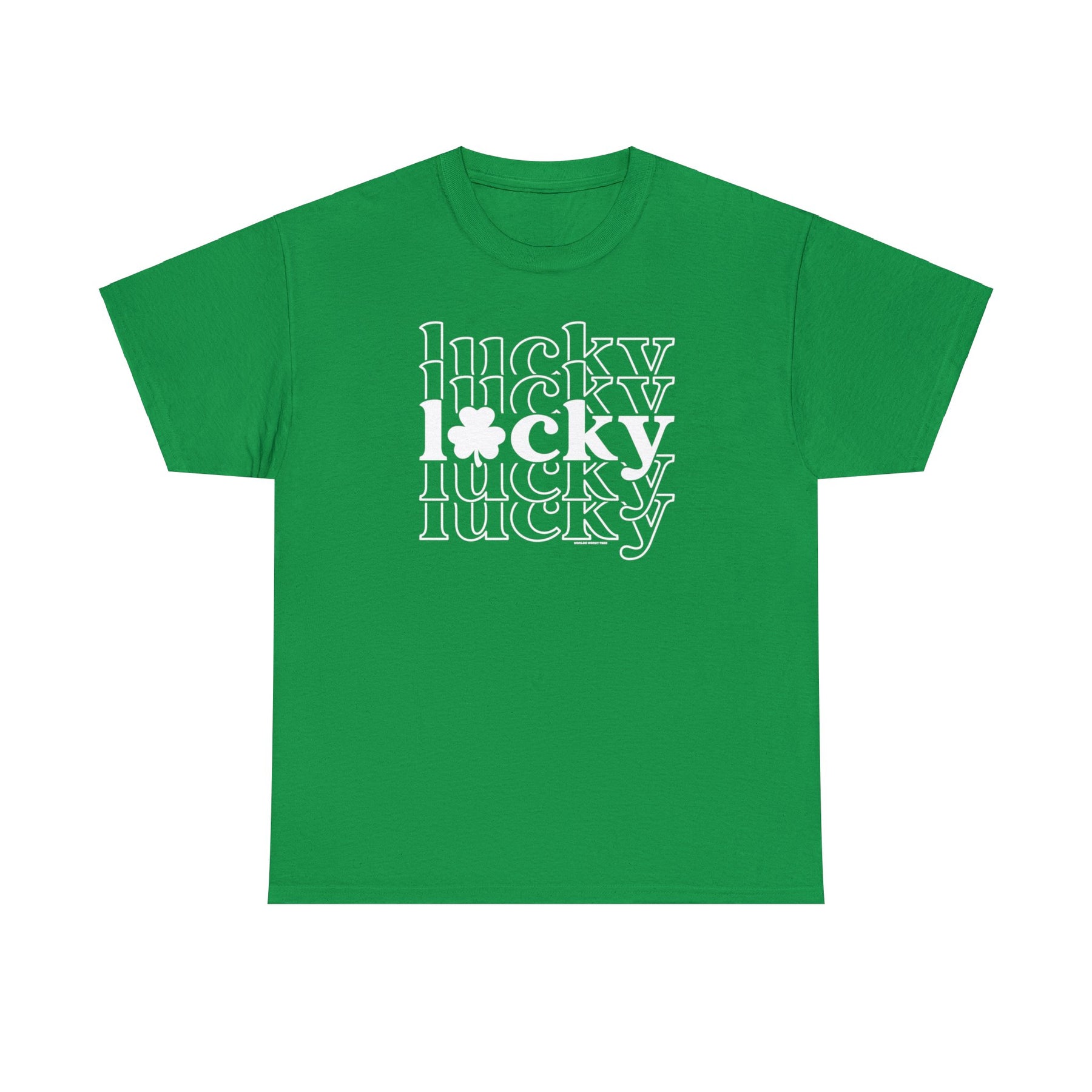 Unisex Lucky Lucky Lucky Tee: Green shirt with white text, ribbed knit collar, no side seams, and medium weight fabric. Classic fit, durable, and versatile staple from Worlds Worst Tees.