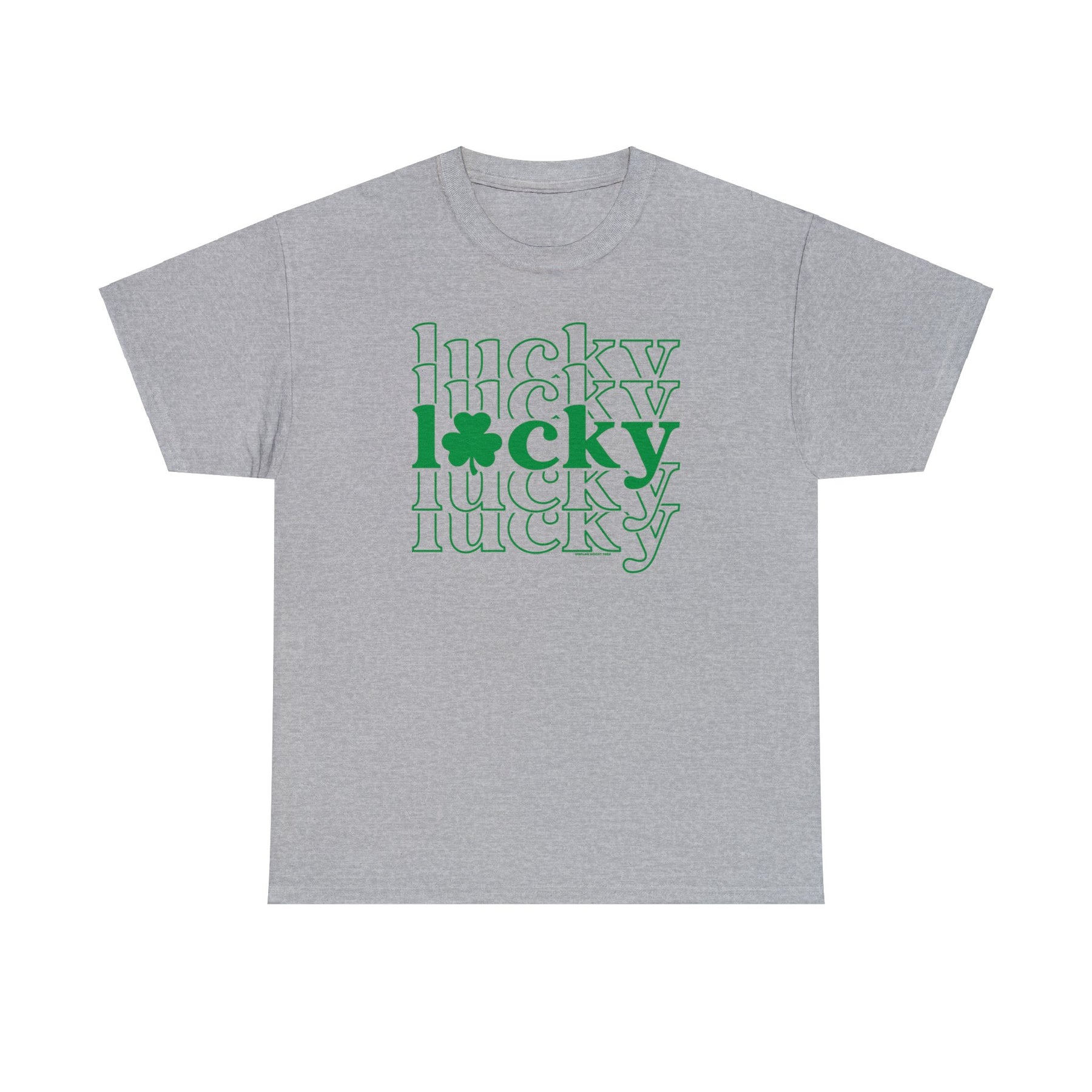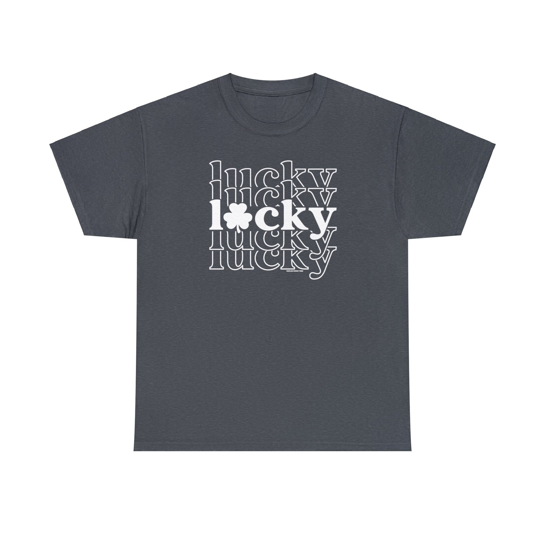 Unisex Lucky Lucky Lucky Tee, grey t-shirt with white text. Classic fit, 100% cotton, medium weight fabric. No side seams, ribbed knit collar, durable tape on shoulders. Sizes S-5XL.