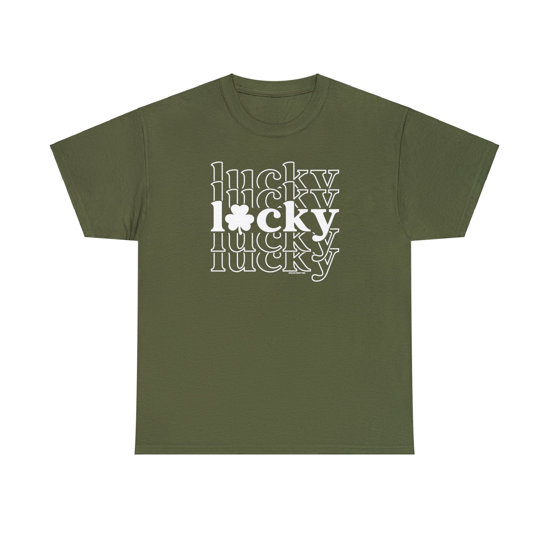 Unisex Lucky Lucky Lucky Tee, a green shirt with white text. Classic fit, 100% cotton, ribbed knit collar, no side seams for comfort. Ideal for casual fashion. From Worlds Worst Tees.