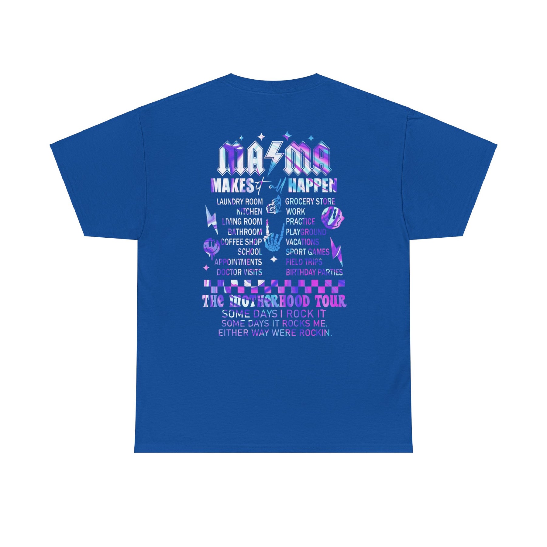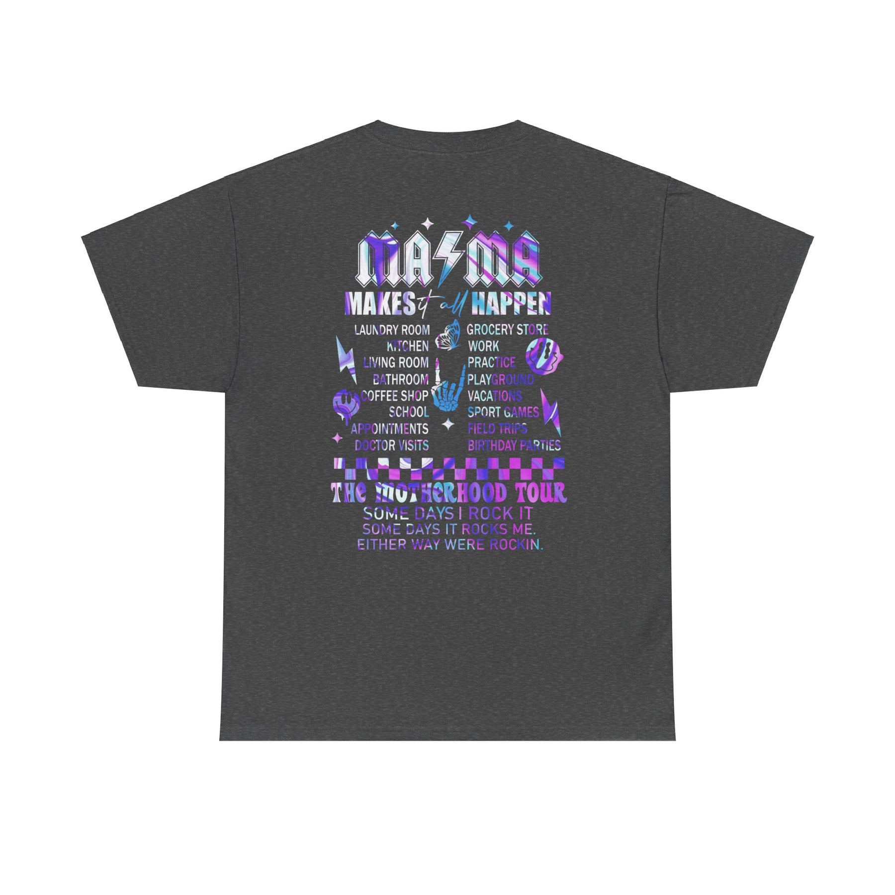 Unisex Ma/Ma Band Tee, back view, grey shirt with purple and blue text. Heavy cotton, seamless, durable, ribbed collar, classic fit. Sizes S-5XL. Ideal casual staple.