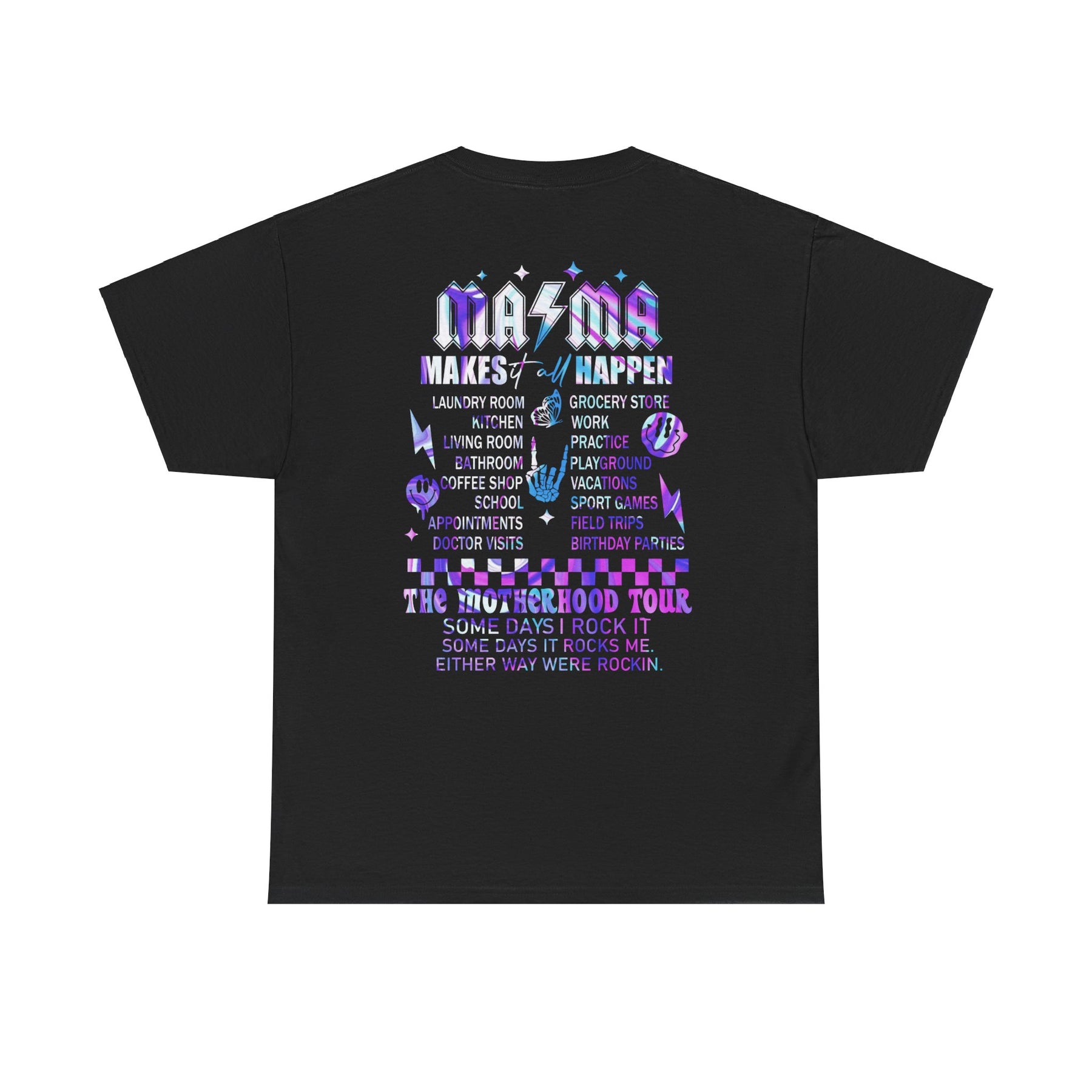 Unisex Ma/Ma Band Tee, a staple with no side seams for comfort. Ribbed knit collar, durable tape on shoulders, medium weight fabric, classic fit. Sizes S-5XL. Classic black tee with unique back design.