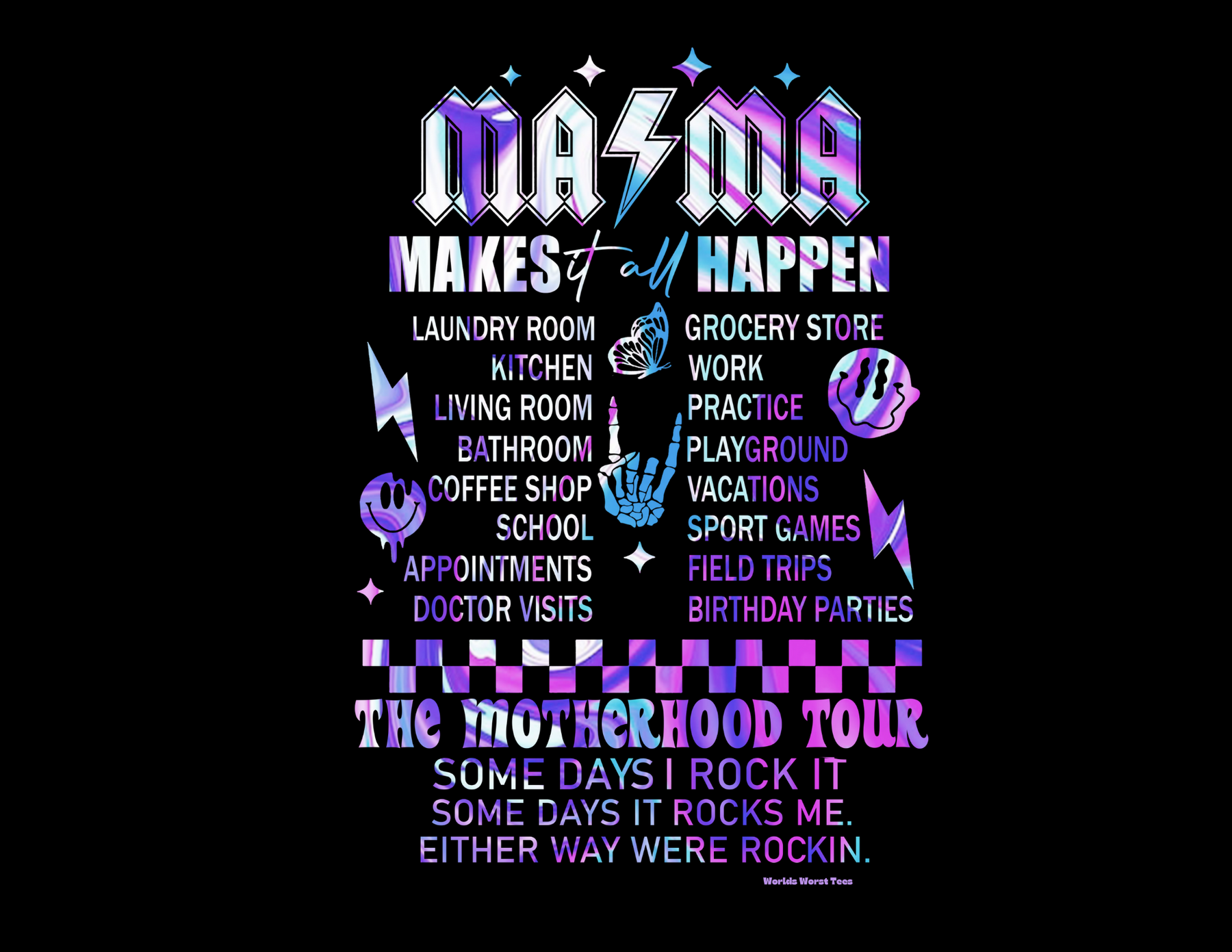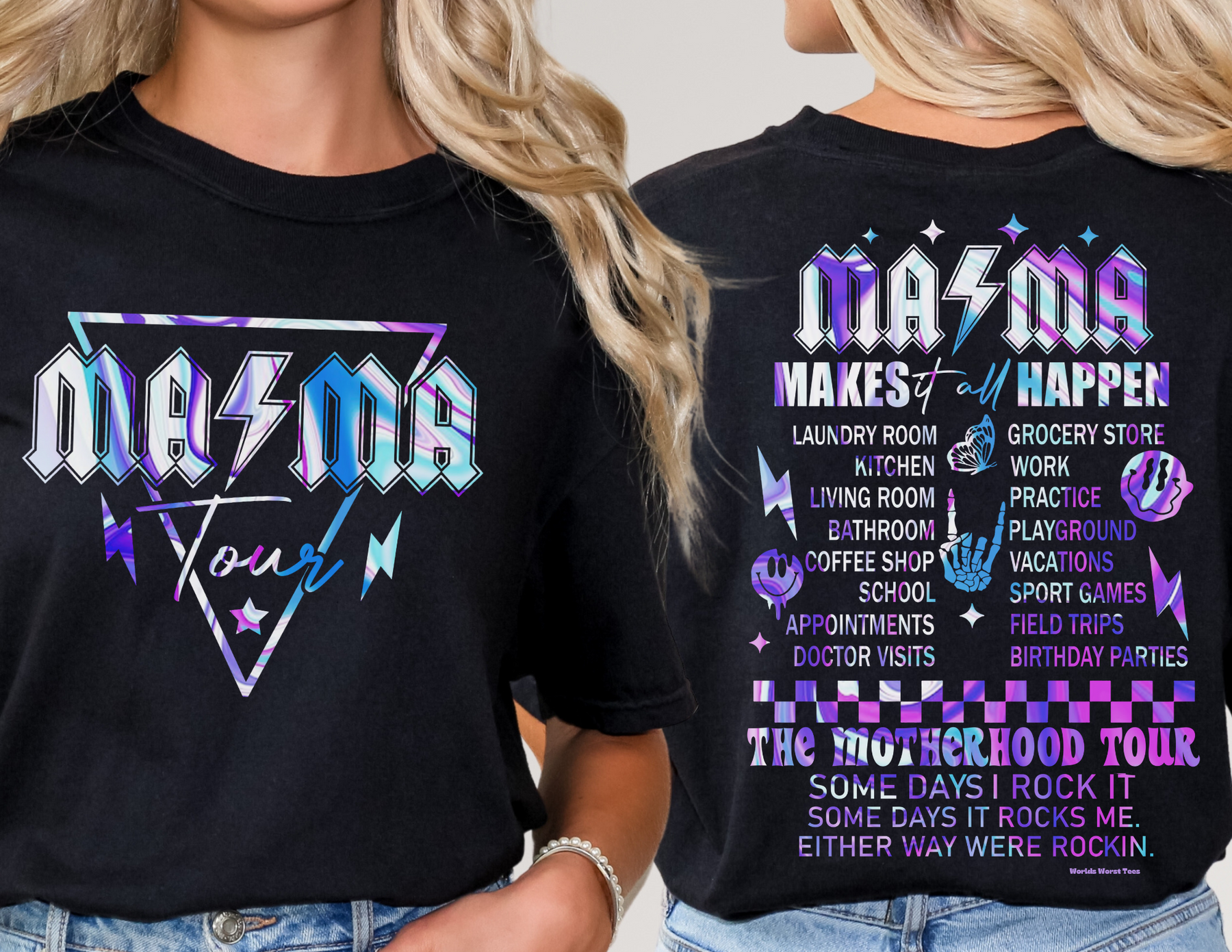 Unisex Ma/Ma Band Tee: A classic fit heavy cotton t-shirt with text, no side seams, ribbed knit collar, and tape on shoulders for durability. Available in various sizes. From 'Worlds Worst Tees'.