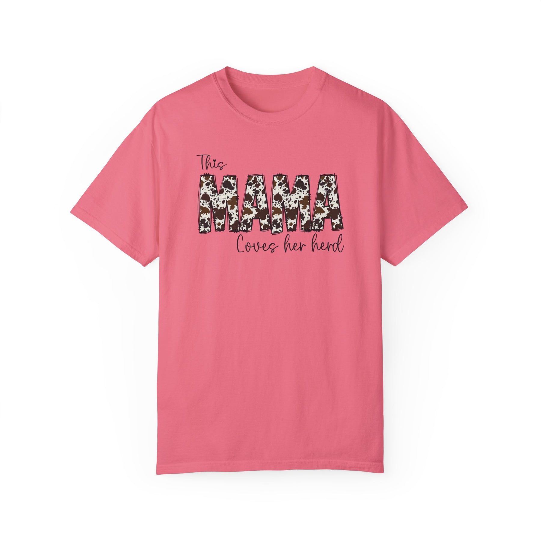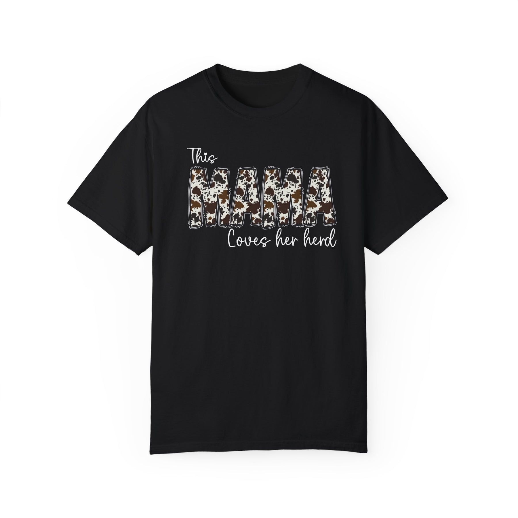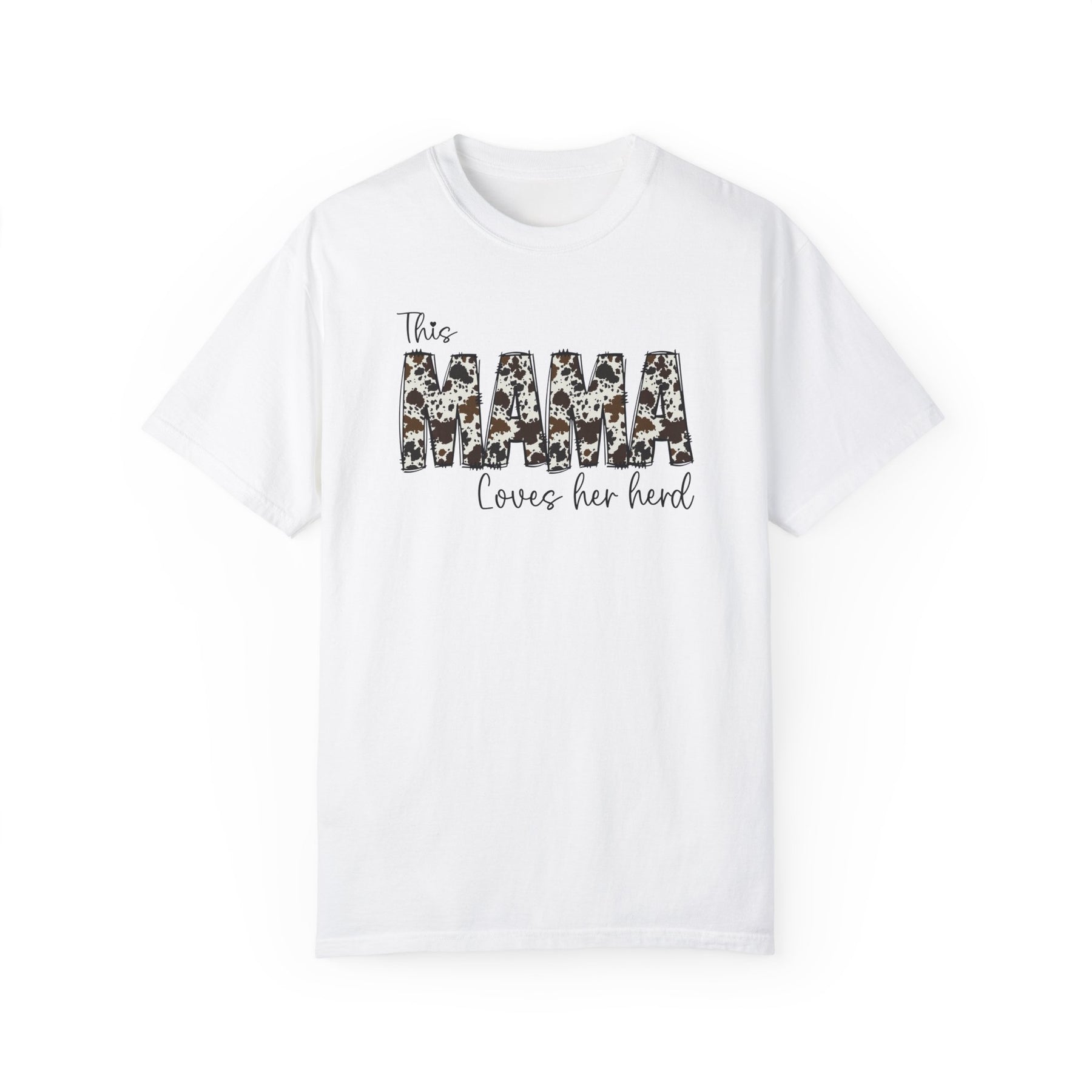 A relaxed fit Mama Herd Tee, 100% ring-spun cotton, garment-dyed for coziness. Double-needle stitching ensures durability, no side-seams for a tubular shape. Ideal for daily wear.