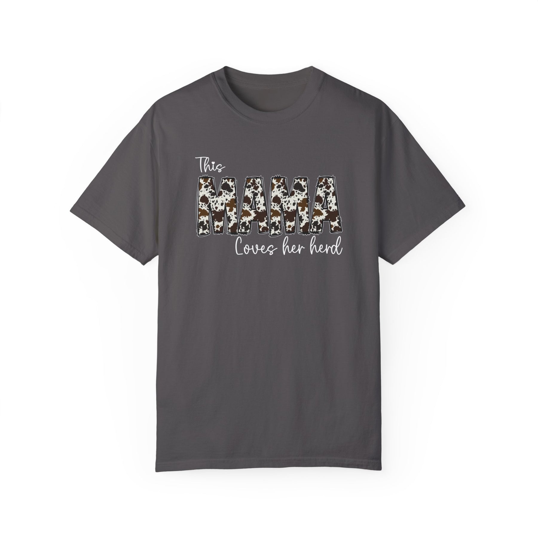 A relaxed fit Mama Herd Tee in grey with cow print and white text. 100% ring-spun cotton, garment-dyed for coziness, double-needle stitching for durability, no side-seams for a tubular shape.