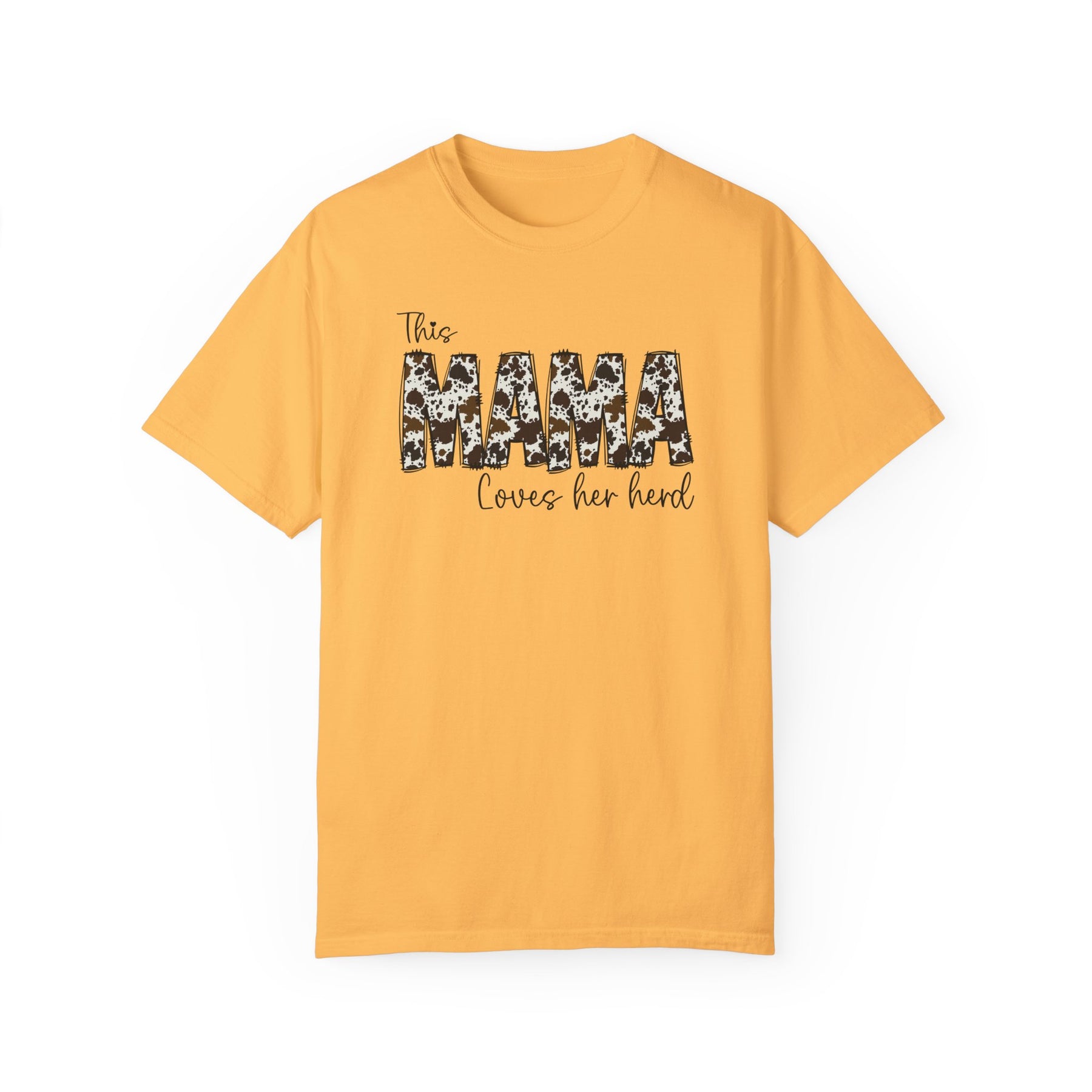 A tan t-shirt featuring a cow print and black text, the Mama Herd Tee. Made of 100% ring-spun cotton, garment-dyed for coziness, with double-needle stitching for durability and a relaxed fit.