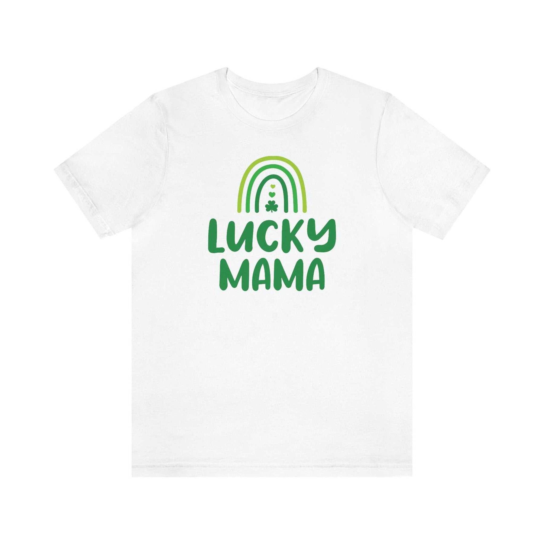 A woman in a white shirt holding a mug, showcasing the Mama Lucky Tee. Unisex jersey tee with ribbed knit collars, taping on shoulders, and Airlume combed cotton fabric. Retail fit, sizes XS to 3XL.