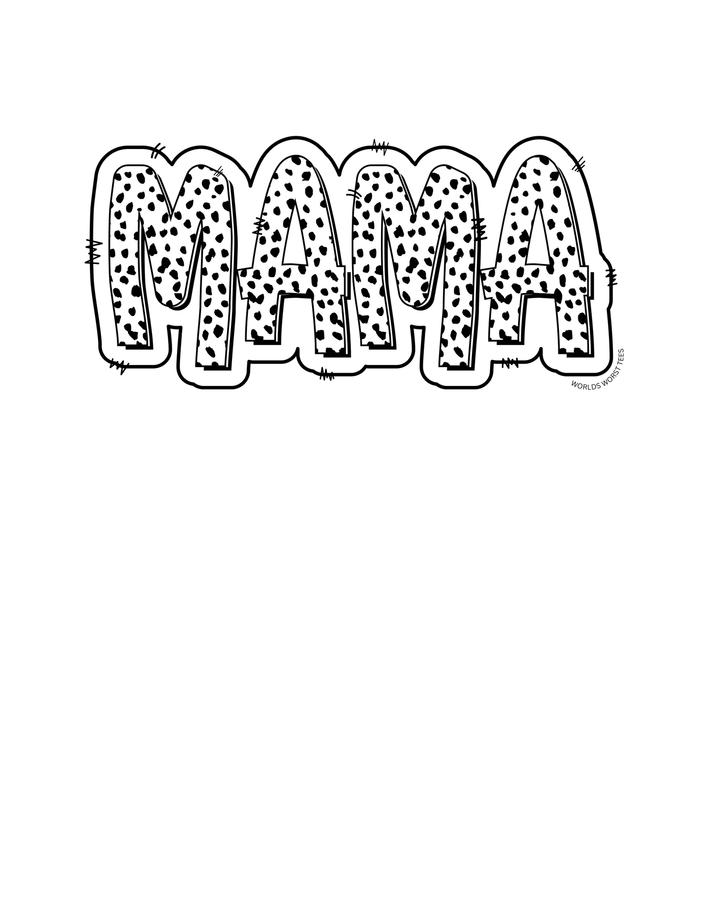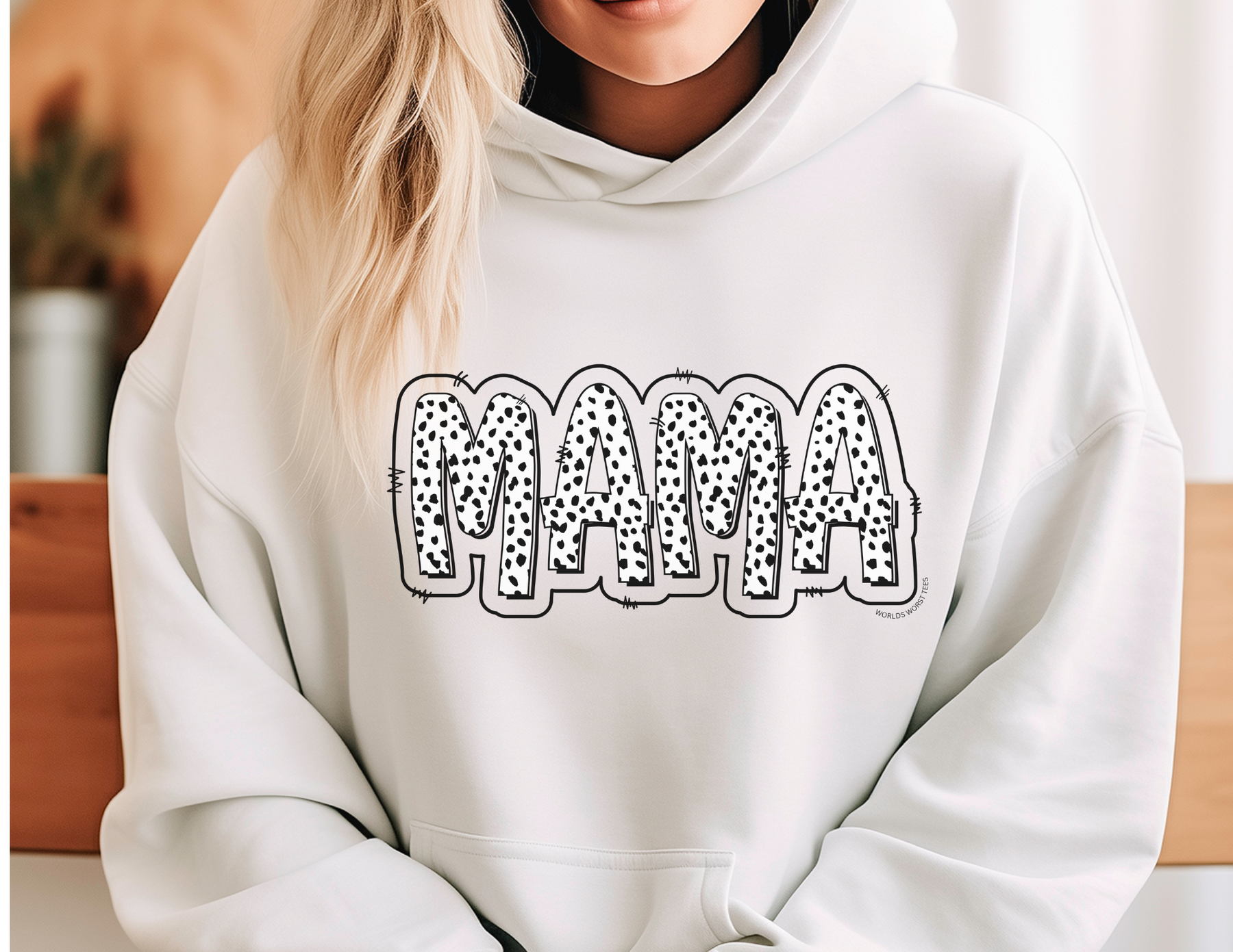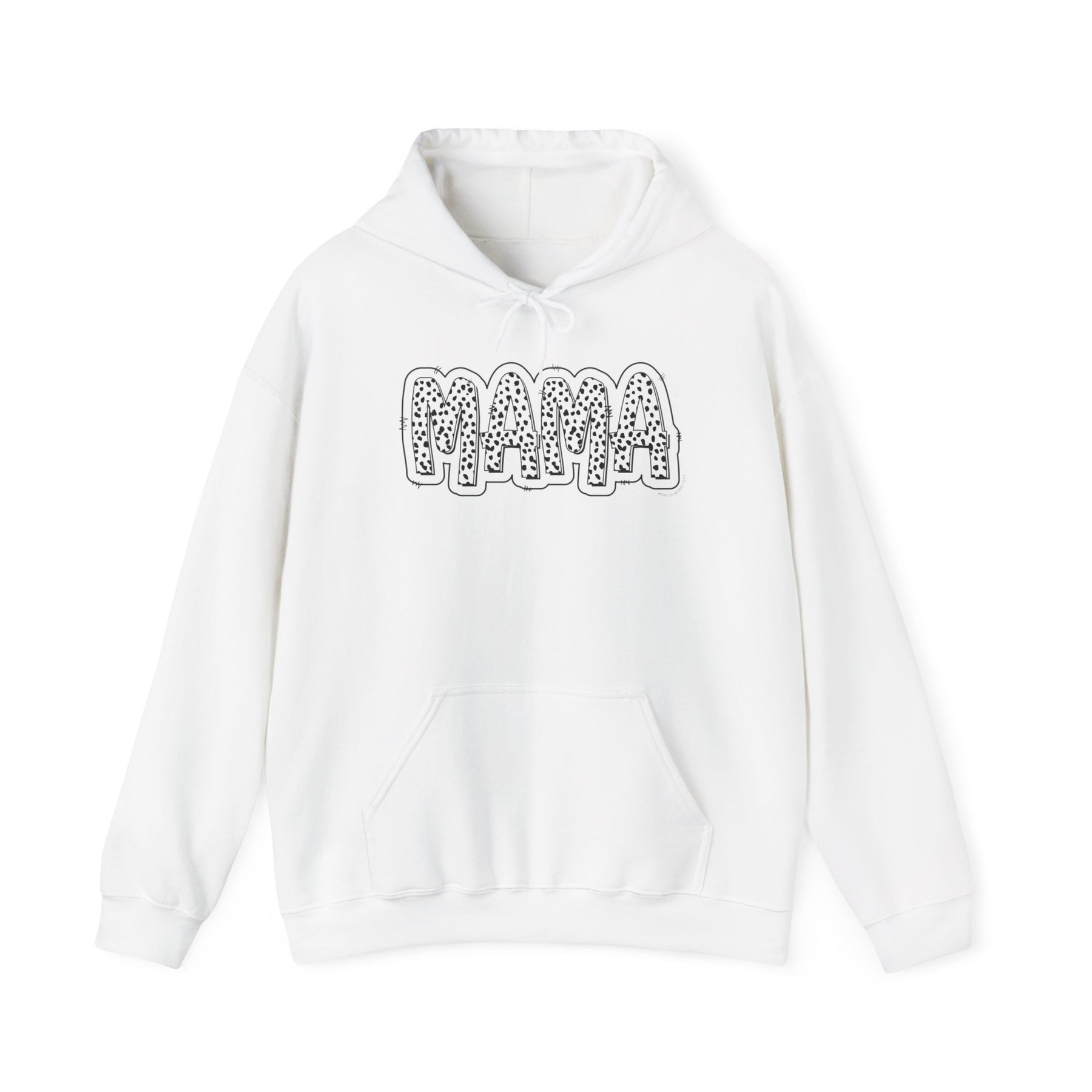 A Mama Print Hoodie, a white sweatshirt with black dots and text, a cozy blend of cotton and polyester, featuring a kangaroo pocket and drawstring hood. Unisex, medium-heavy fabric, tear-away label, true to size.