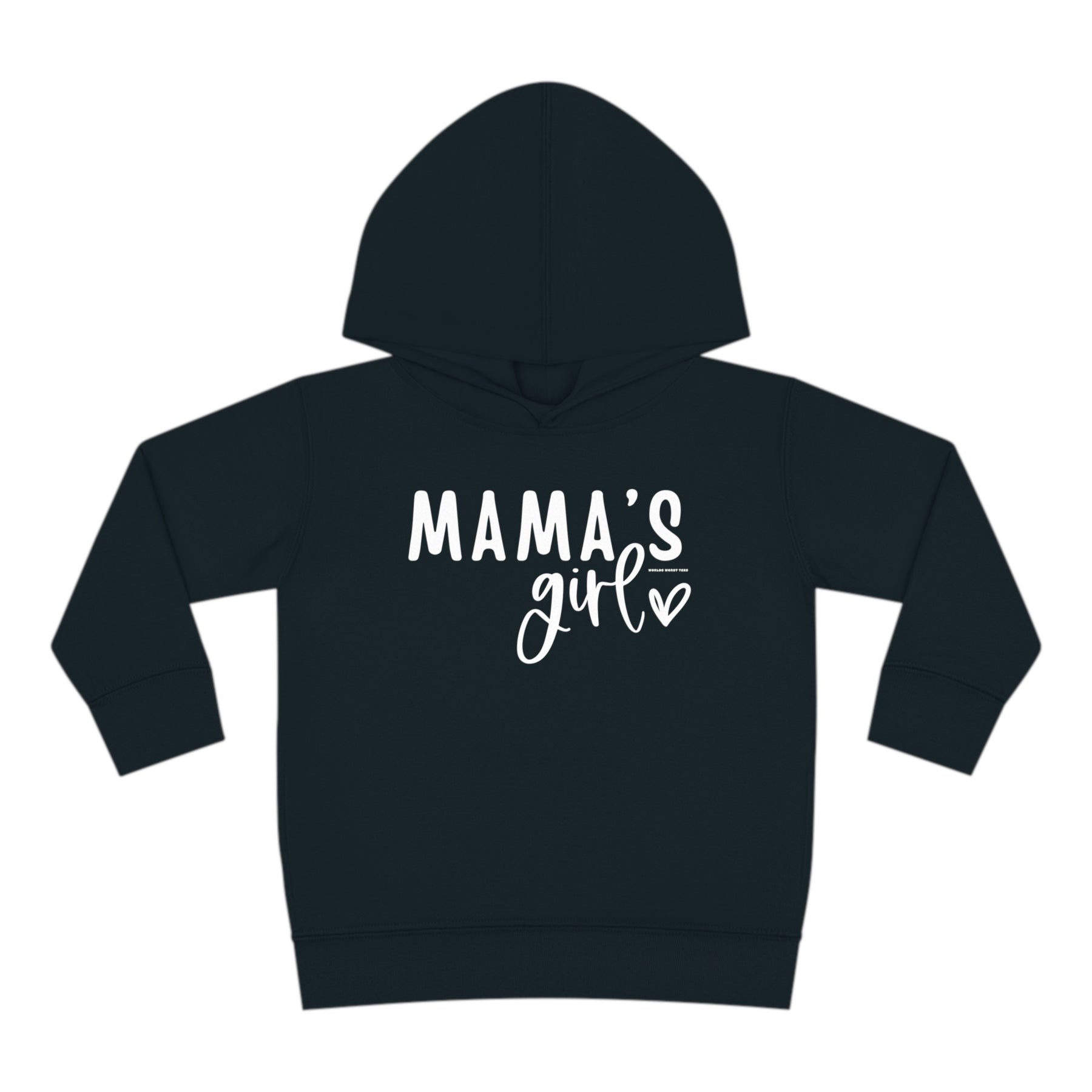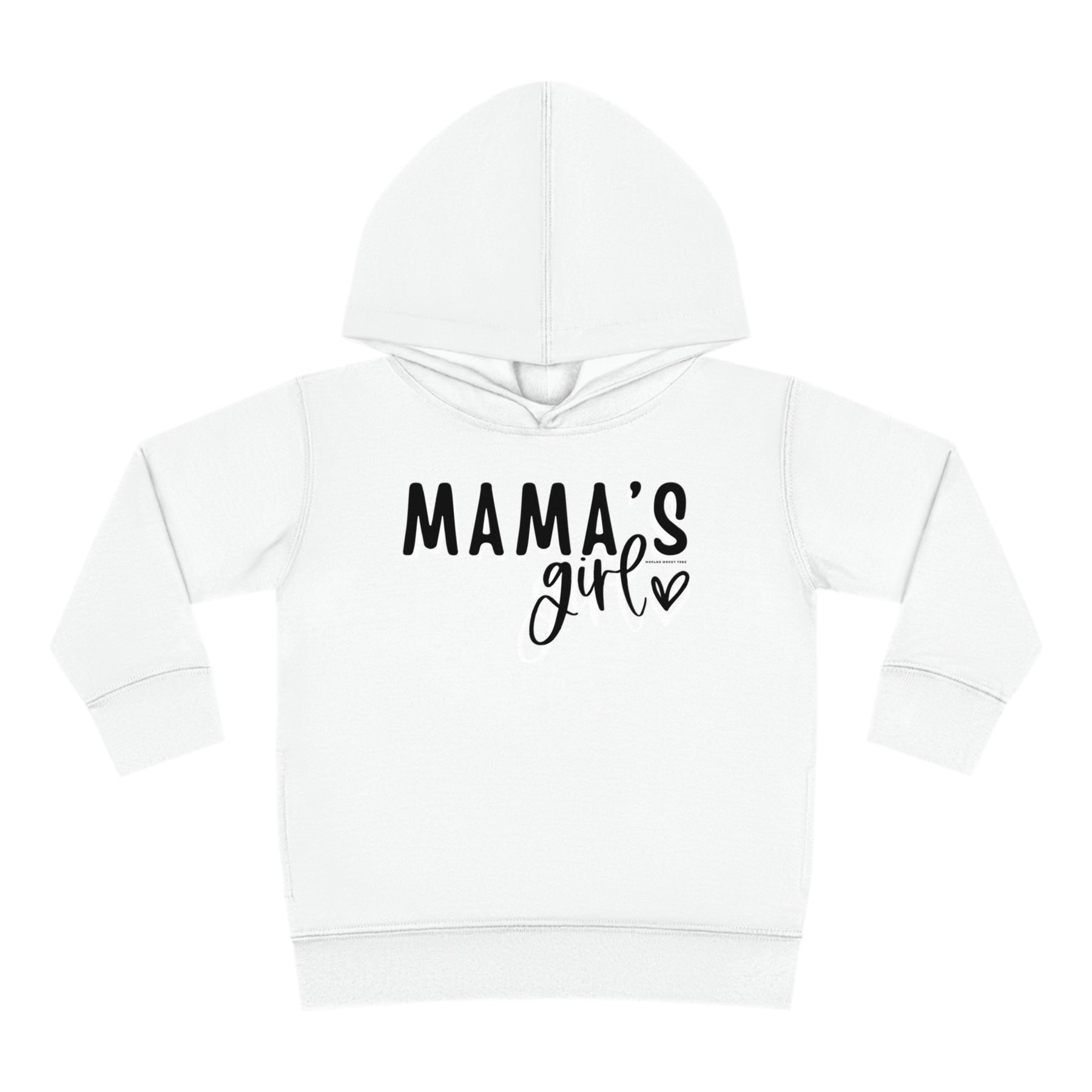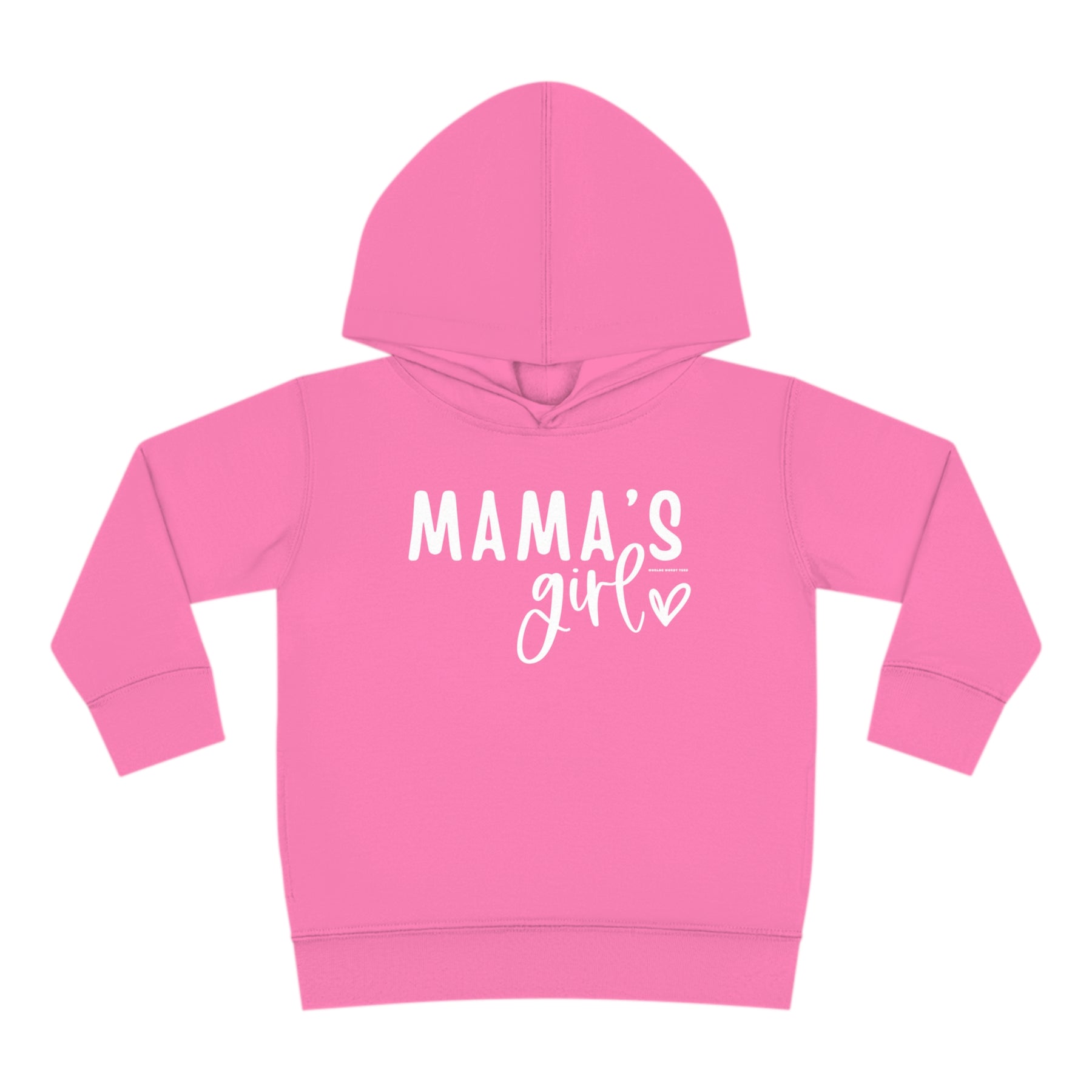 Toddler hoodie with Mama's Girl design, featuring durable construction with cover-stitched details. Side seam pockets for added convenience. Made of 60% cotton, 40% polyester blend. Sizes: 2T, 4T, 5-6T.
