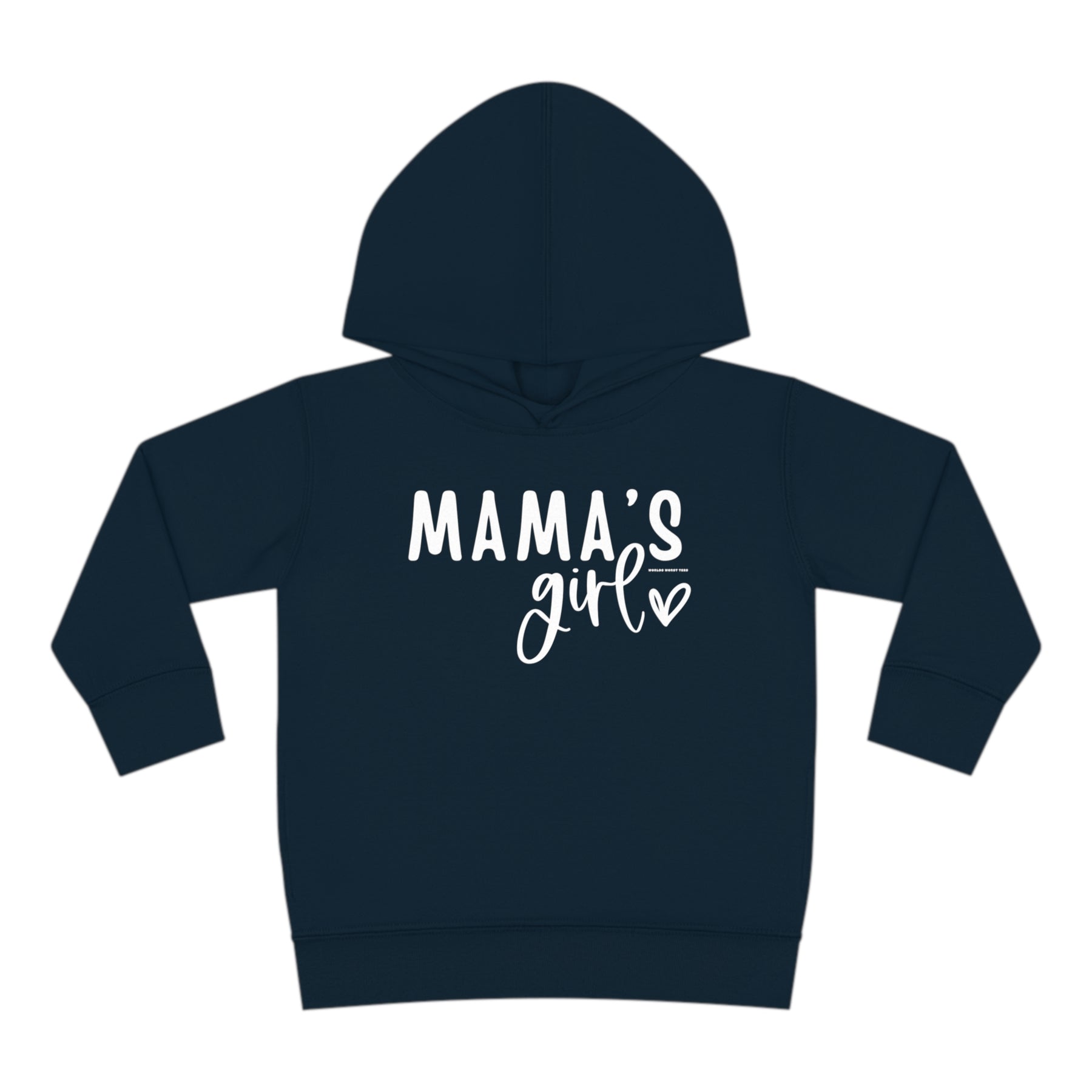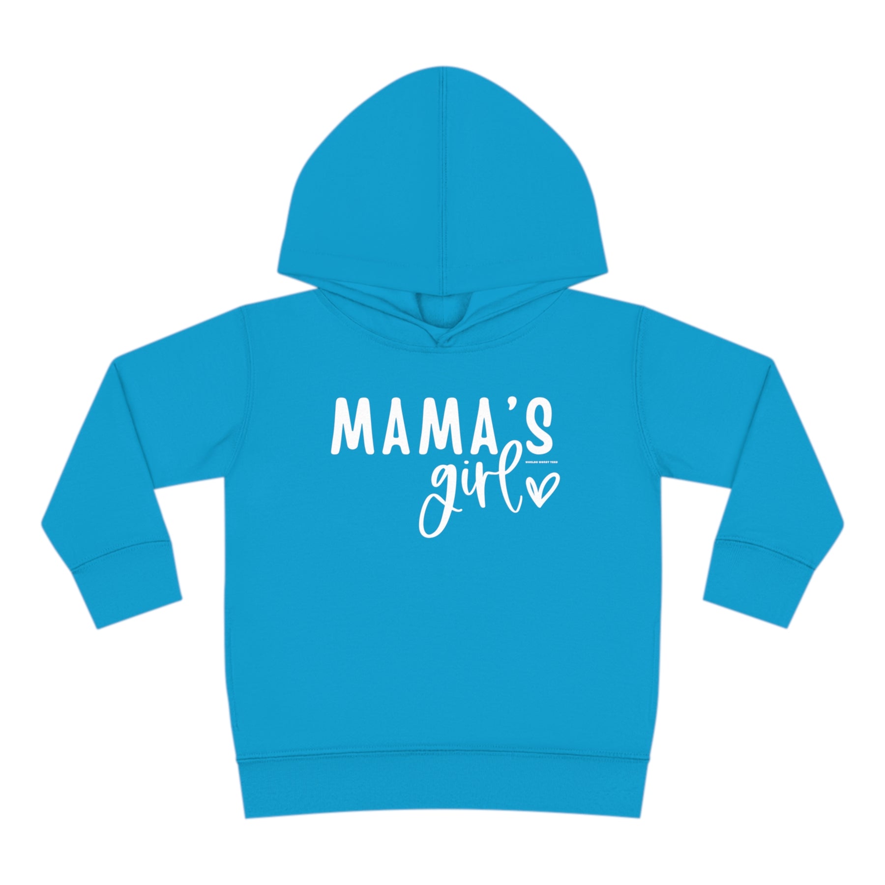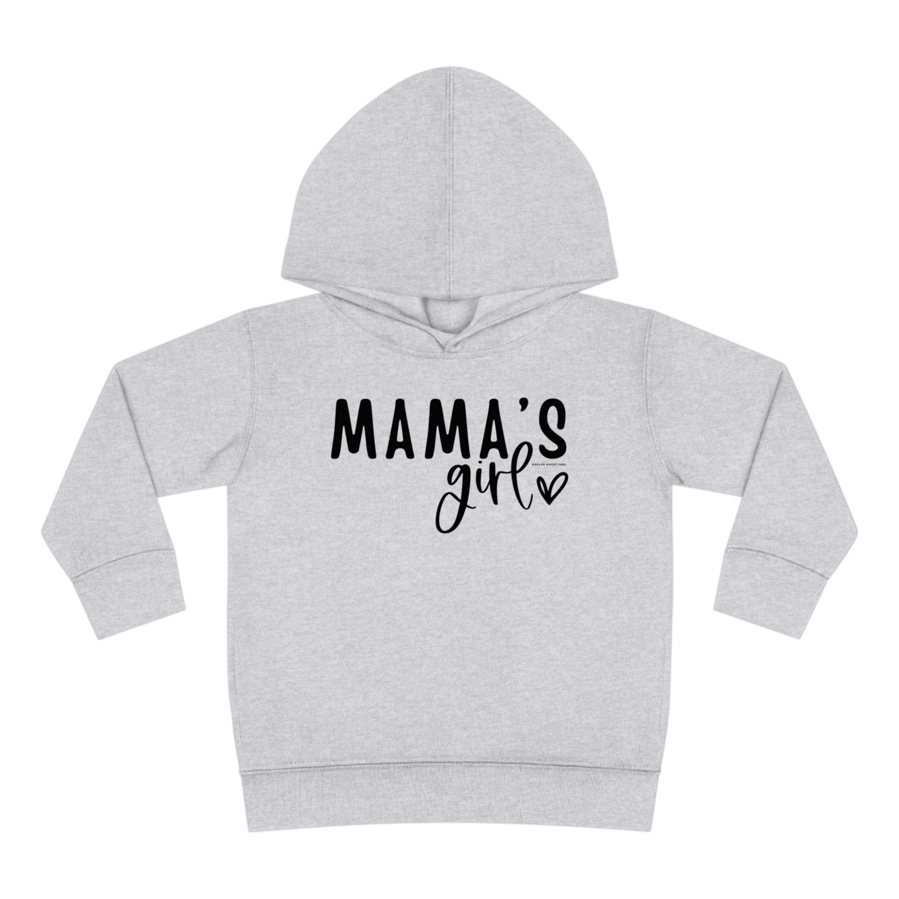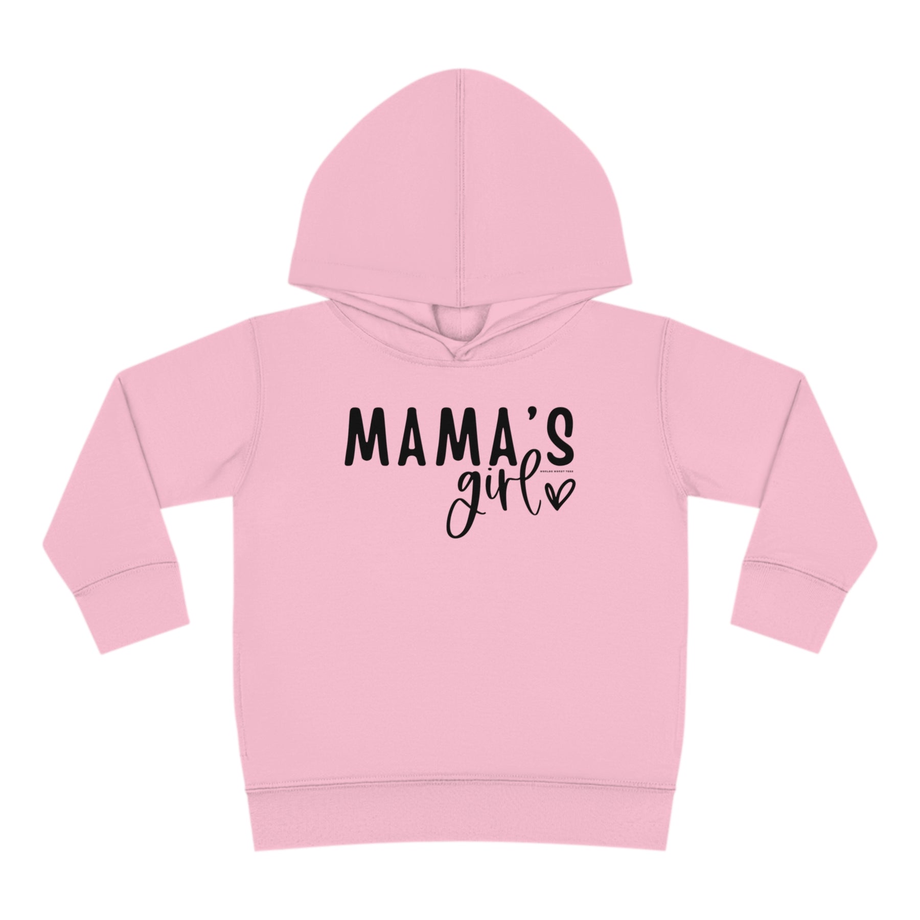Toddler hoodie with Mama's Girl design, jersey-lined hood, cover-stitched details, and side seam pockets for durability and coziness. 60% cotton, 40% polyester blend. Sizes: 2T, 4T, 5-6T.
