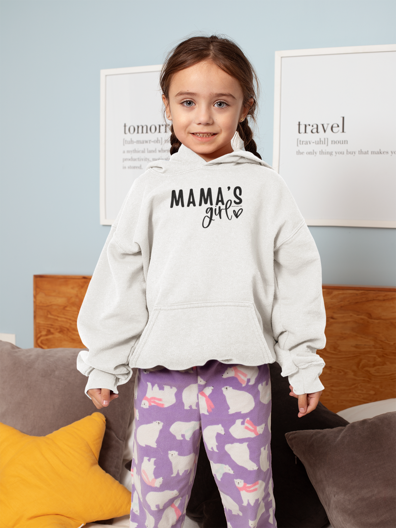 A cozy Mama's Girl Toddler Hoodie with durable features like cover-stitched details and side seam pockets. Made of 60% cotton and 40% polyester for lasting comfort. Toddler sizes: 2T, 4T, 5-6T.