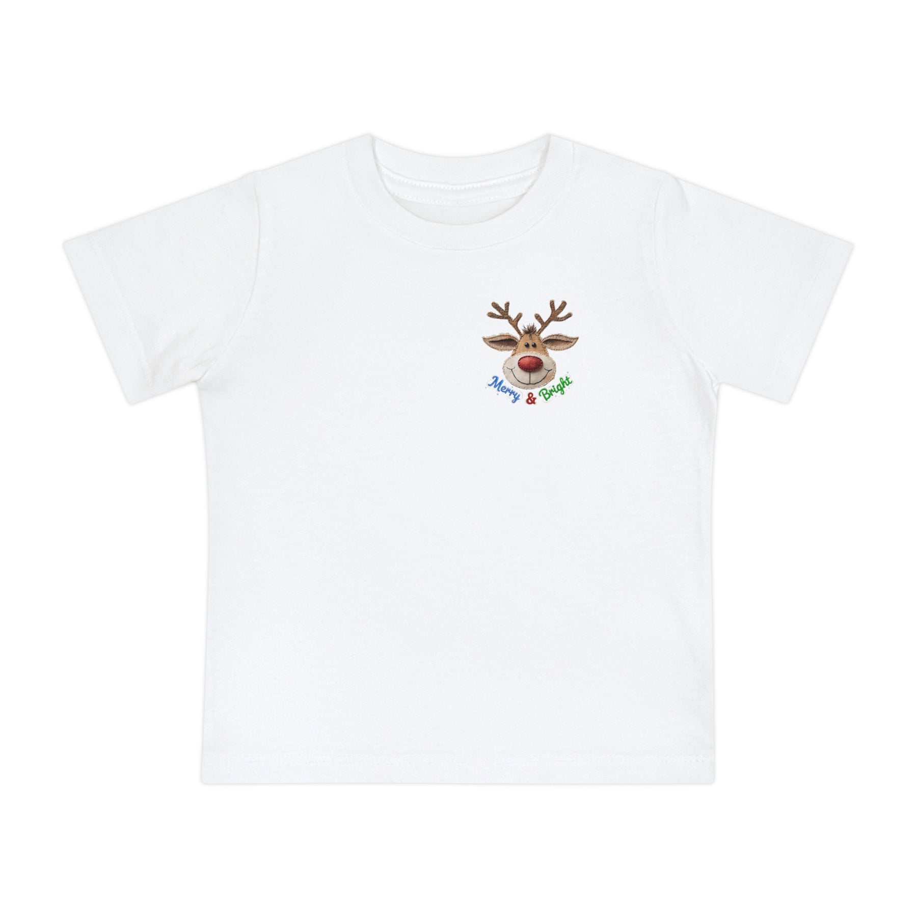 Merry and Bright Tee: A soft, white baby t-shirt with a smiling reindeer graphic and “Merry & Bright” text, ideal for stylish first steps.
