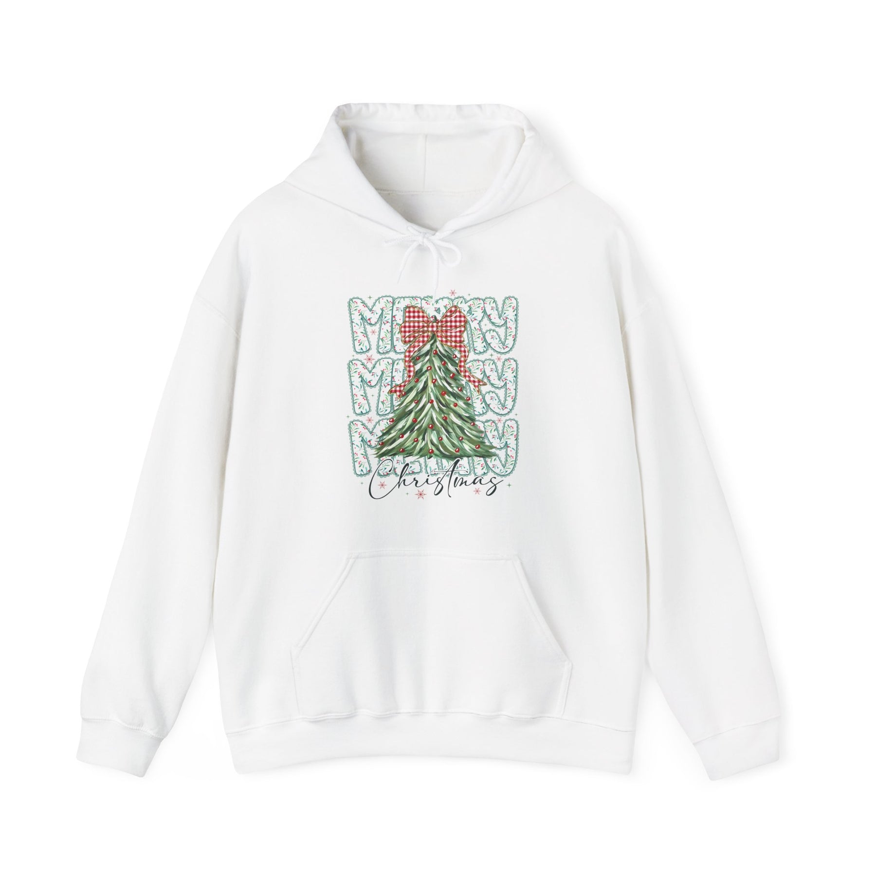 Merry Christmas Hoodie features a festive pine tree with red ornaments, gingham bow, surrounded by MERRY text and snowflakes, perfect for cozy holiday warmth.