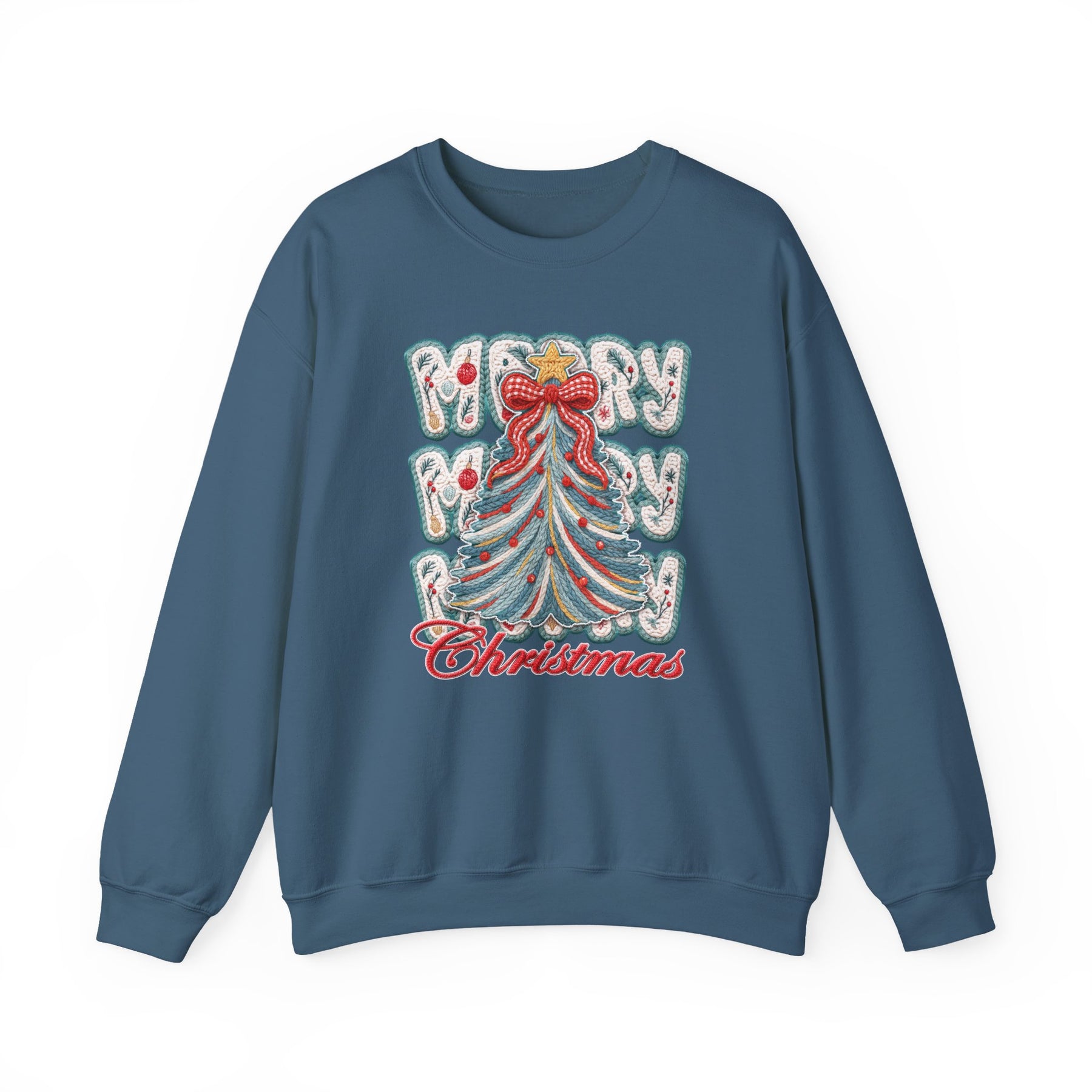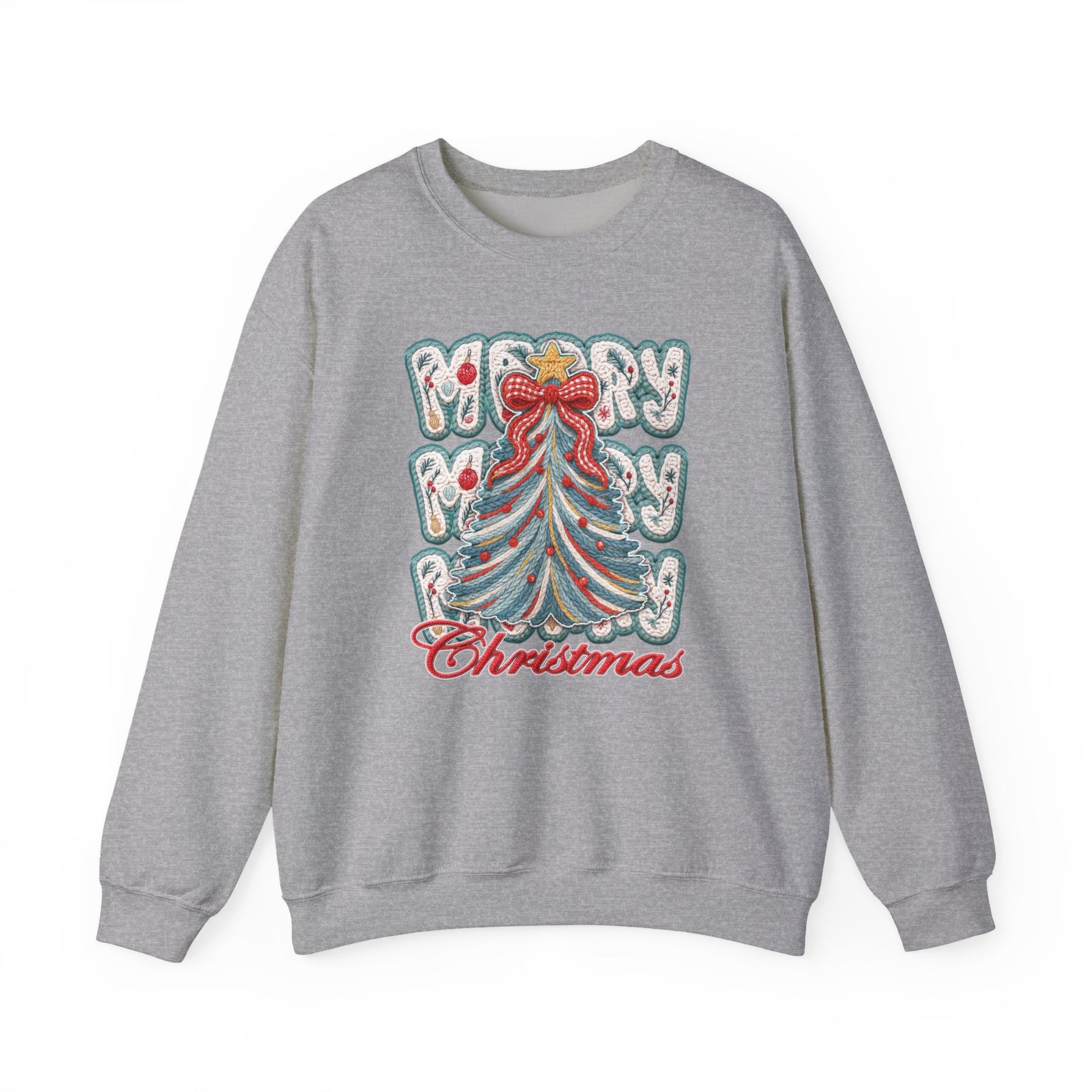 Holiday-themed embroidery graphic featuring a knitted yarn Christmas tree with red baubles, golden star, red bow, and MERRY MERRY Christmas text on a cozy crewneck sweatshirt.