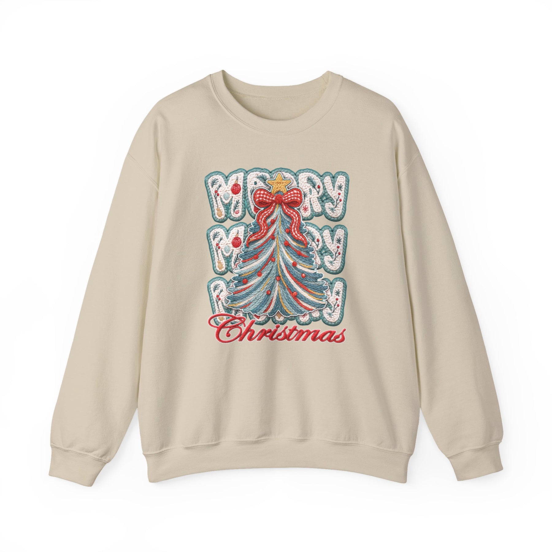 Merry Christmas Tree Crew sweatshirt features a festive embroidered Christmas tree with a gold star and red bow, surrounded by MERRY text in snowy font.