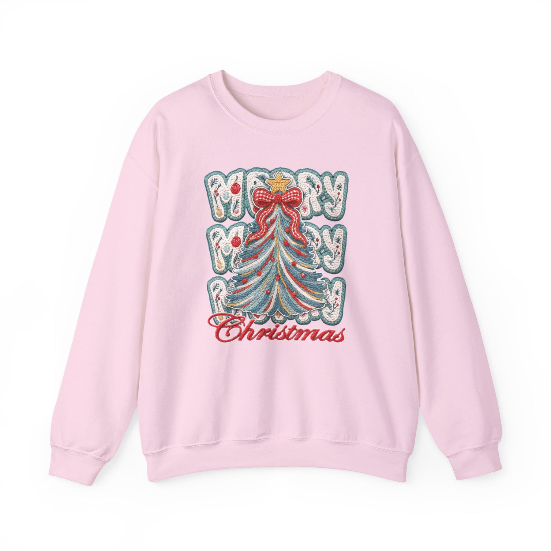 Light-pink crewneck sweatshirt featuring a stylized Christmas tree with a red bow and ornaments, and Merry Christmas text. Cozy, unisex design for colder months.