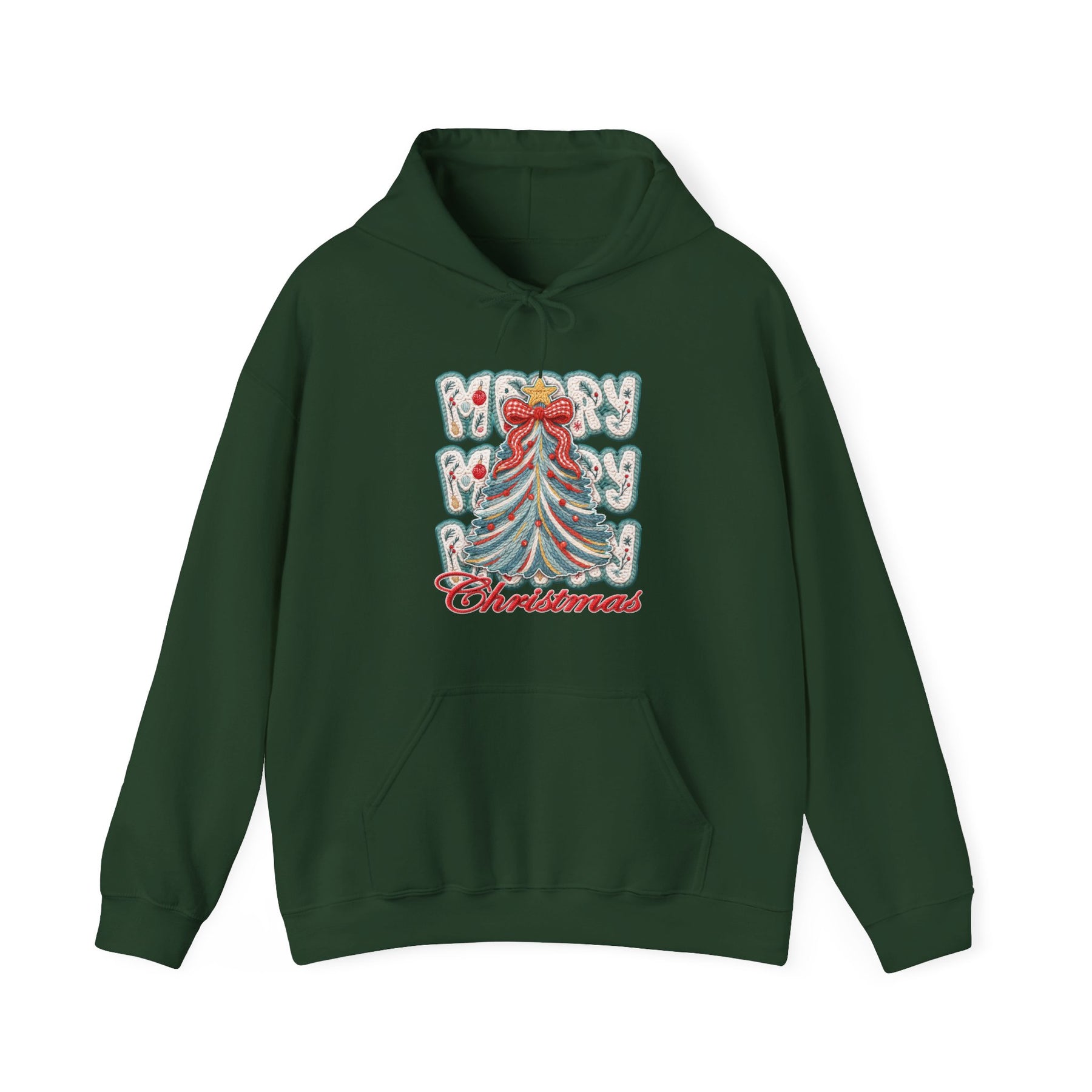 Merry Christmas Tree Hoodie featuring a festive tree design with Merry Merry Christmas text, kangaroo pocket, and color-matched drawstring. Cozy cotton-poly blend for warmth.