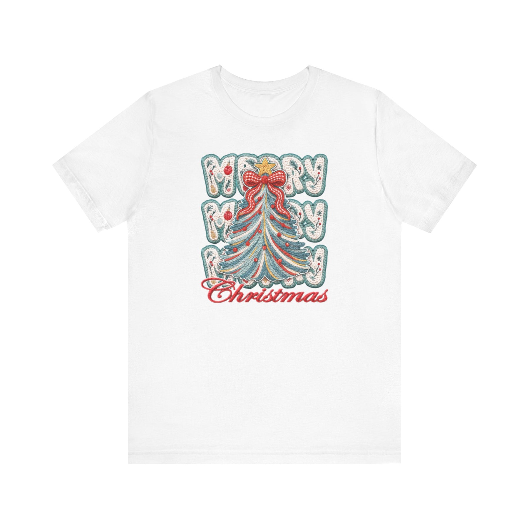 Merry Christmas Tree Tee featuring a stylized yarn-stitched tree with MERRY text and Christmas script, perfect for a festive, comfortable wear.