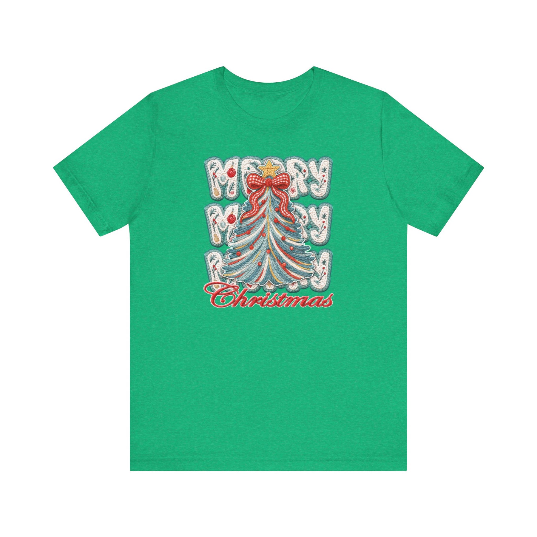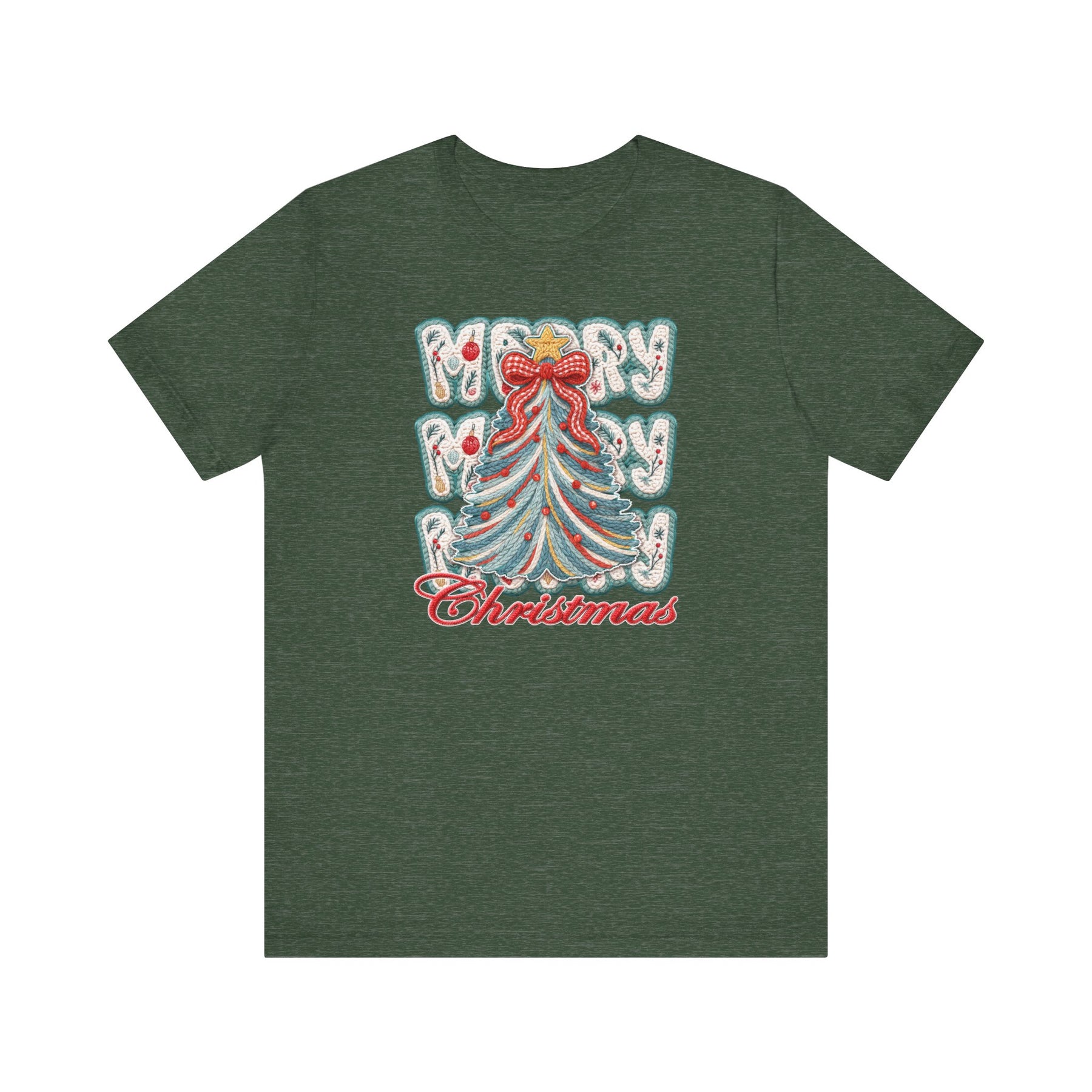 Merry Christmas Tree Tee: Heather-green T-shirt with a festive embroidered-style Christmas tree, snowflake motifs, and Merry Merry Christmas text in snowy and red script.