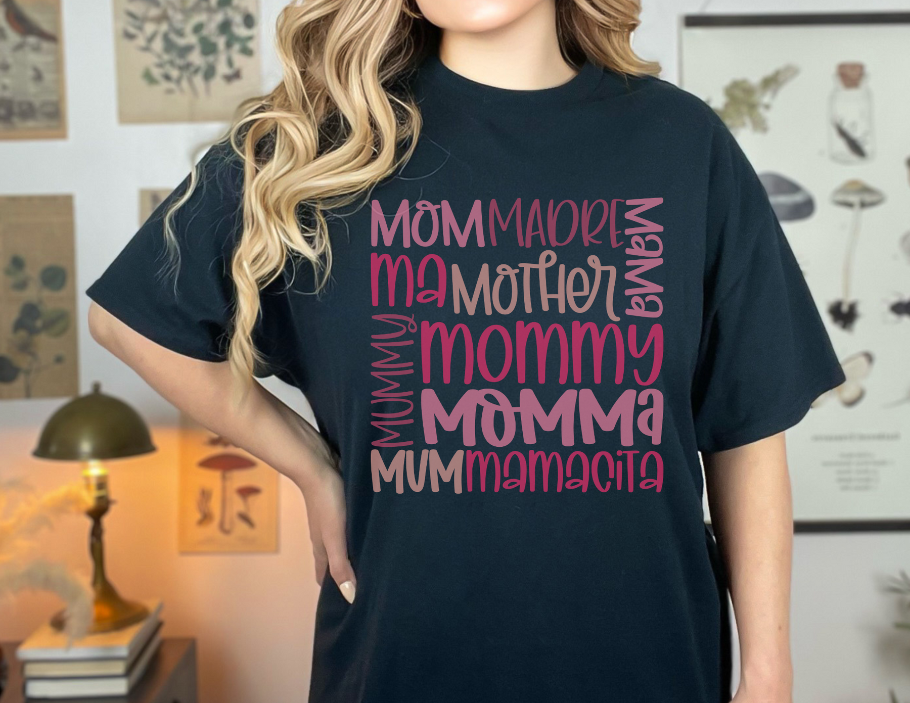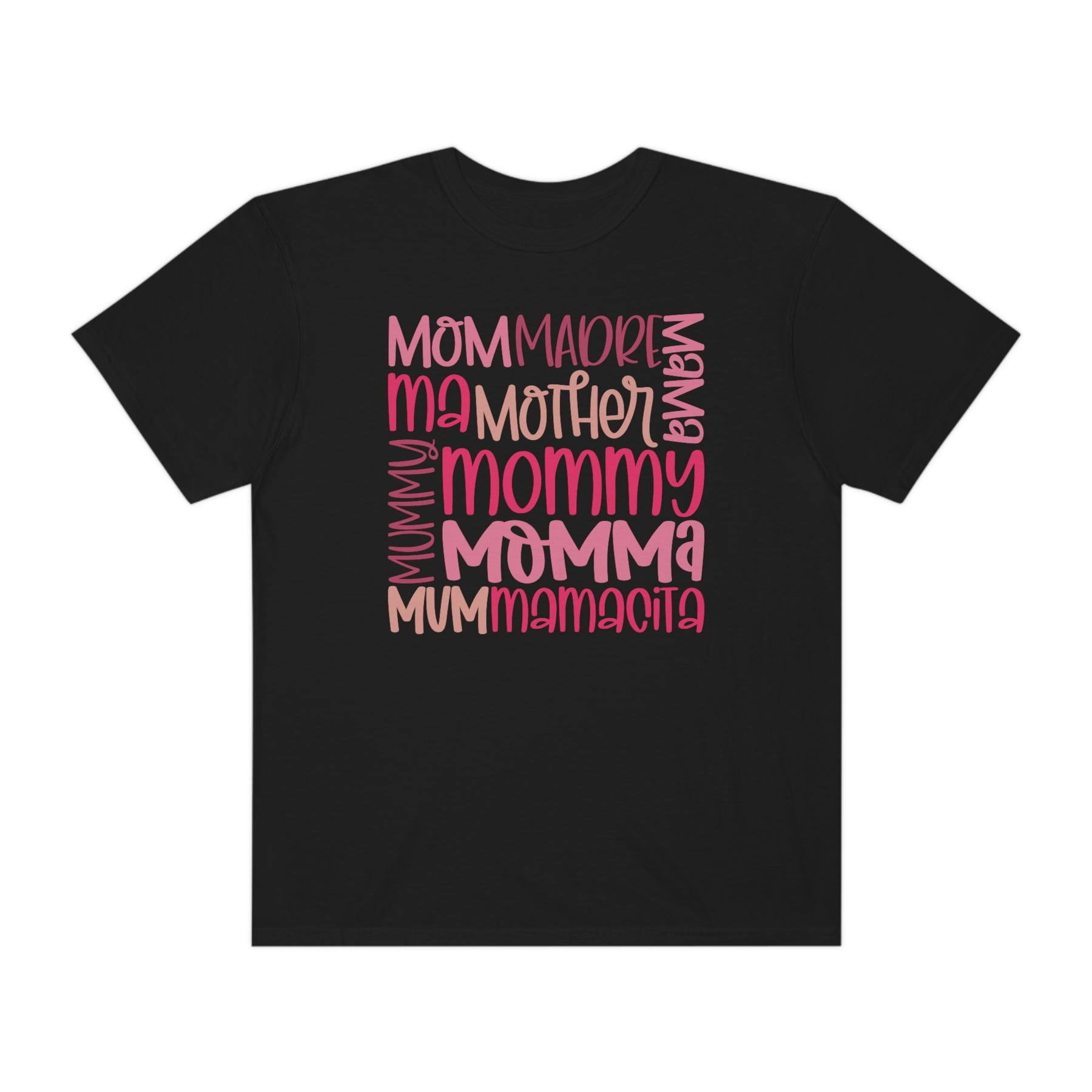 A Mama Tee in black with pink text, made of 100% ring-spun cotton. Garment-dyed for softness, featuring a relaxed fit, double-needle stitching, and no side-seams for durability and comfort.