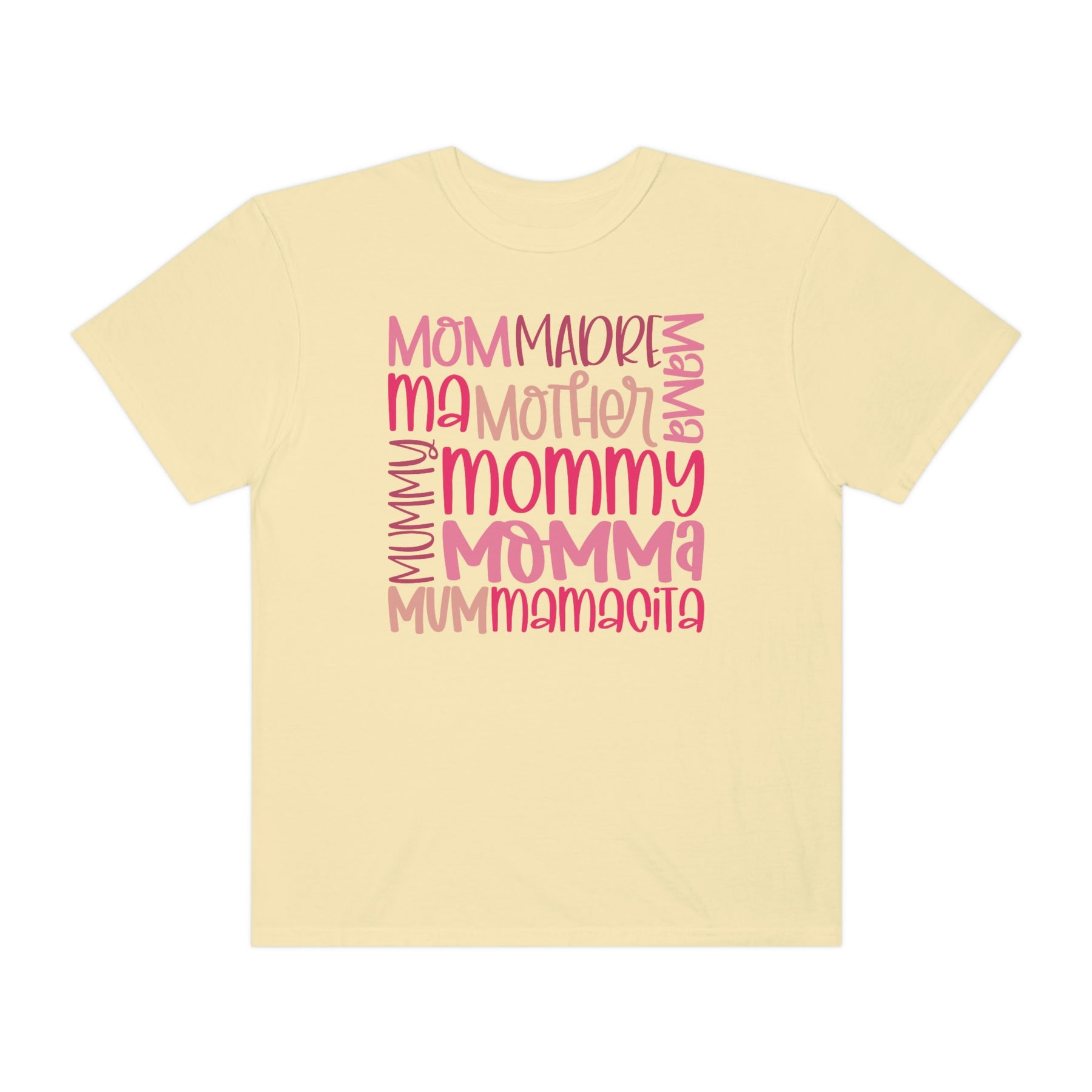 Alt text: Mama Tee, a soft-washed, garment-dyed t-shirt made of 100% ring-spun cotton. Features a relaxed fit, double-needle stitching, and no side-seams for durability and comfort.