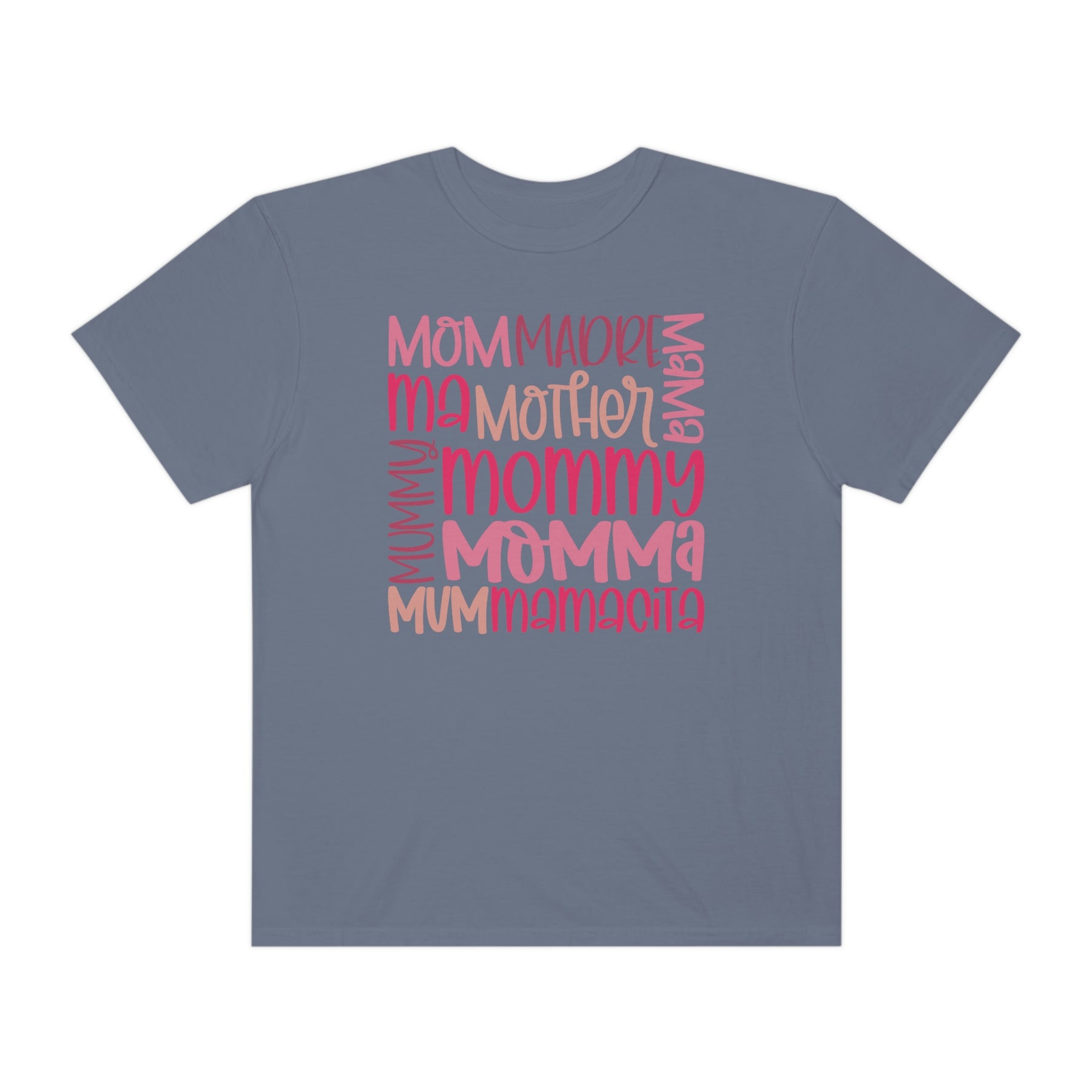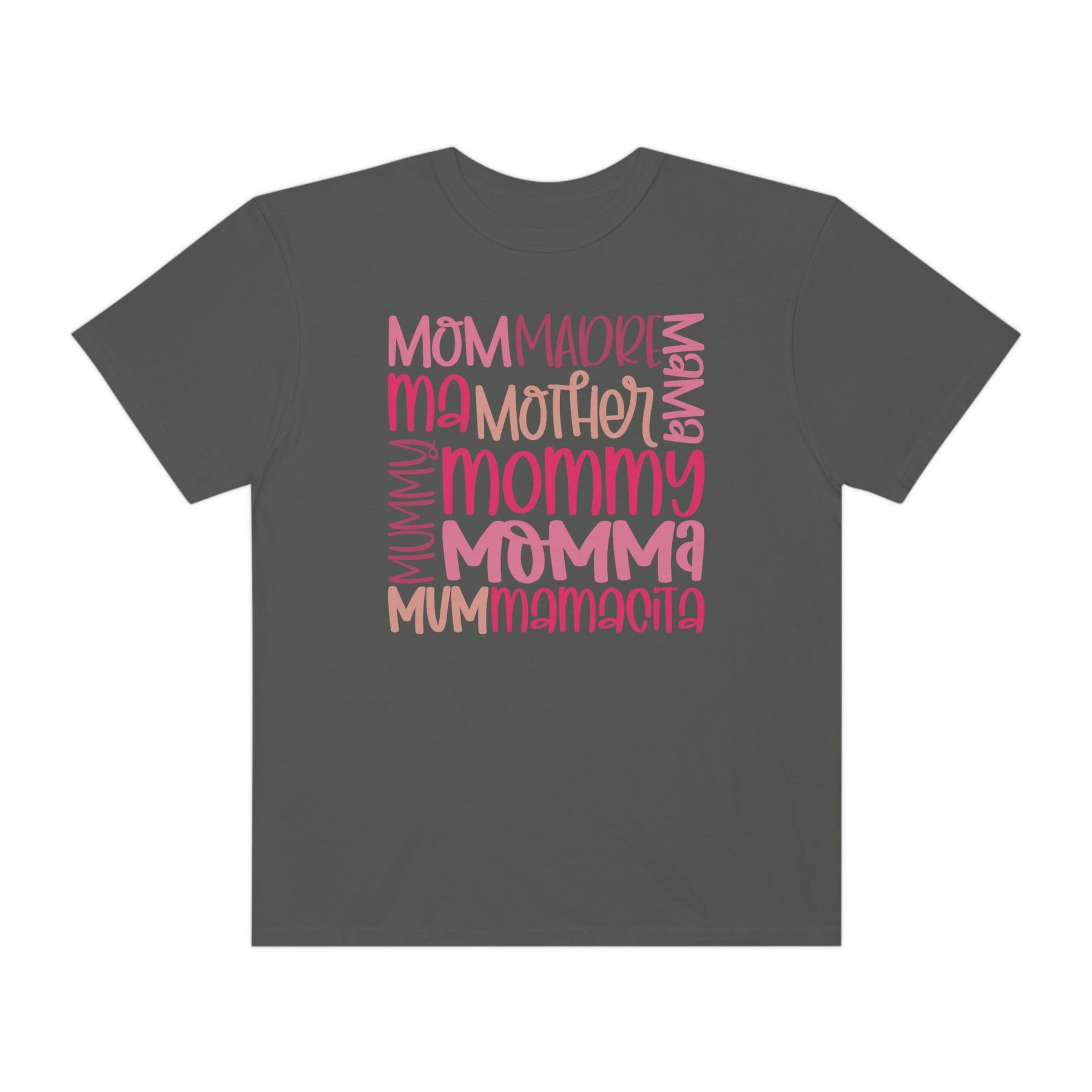 A Mama Tee in grey with pink text, made of 100% ring-spun cotton. Garment-dyed for extra coziness, featuring a relaxed fit and durable double-needle stitching. Ideal for daily wear.