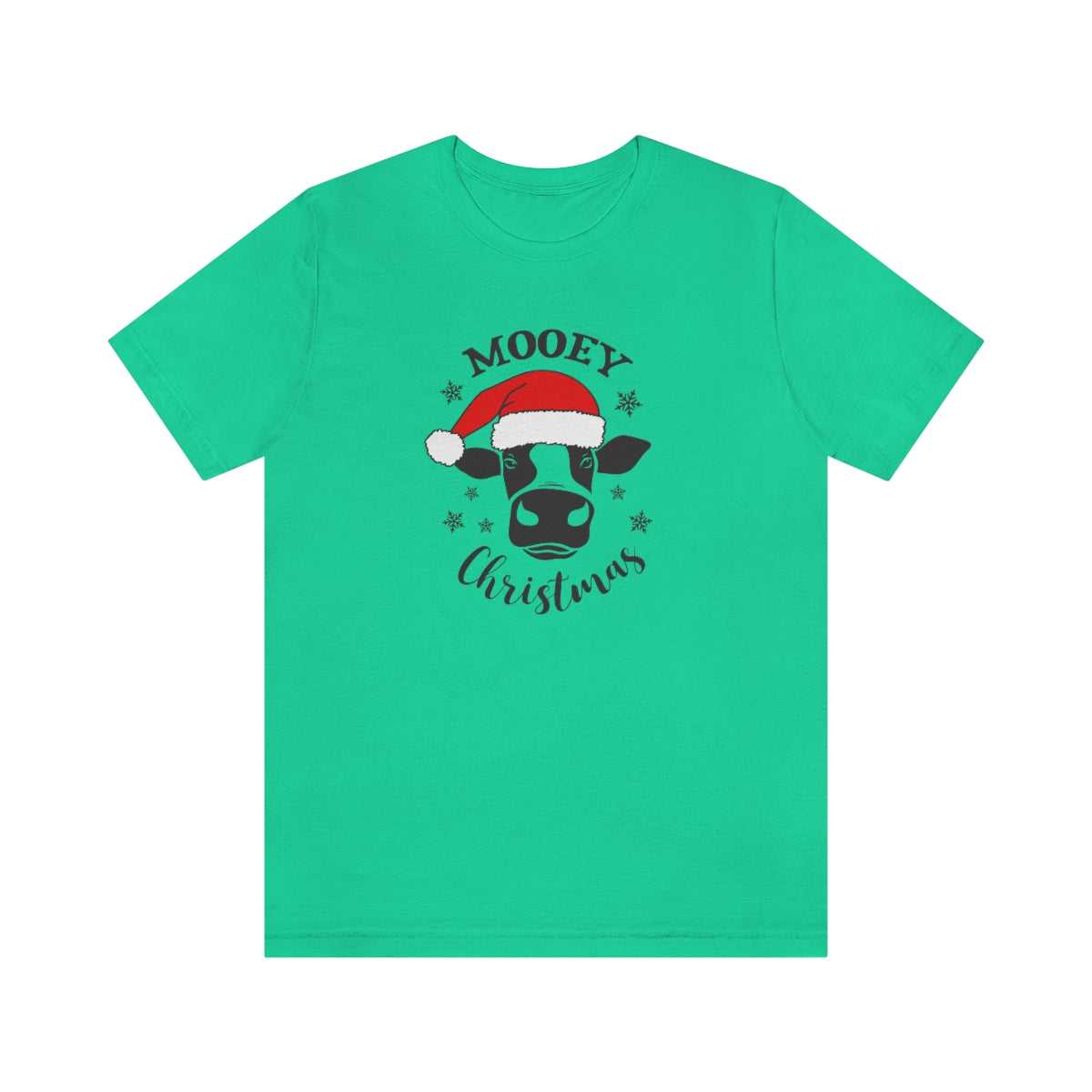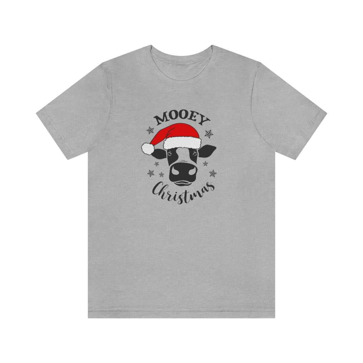 A unisex jersey tee featuring a cow wearing a Santa hat, part of the Mooey Christmas Tee collection. Soft cotton, ribbed knit collars, and Airlume combed cotton ensure a comfortable fit.