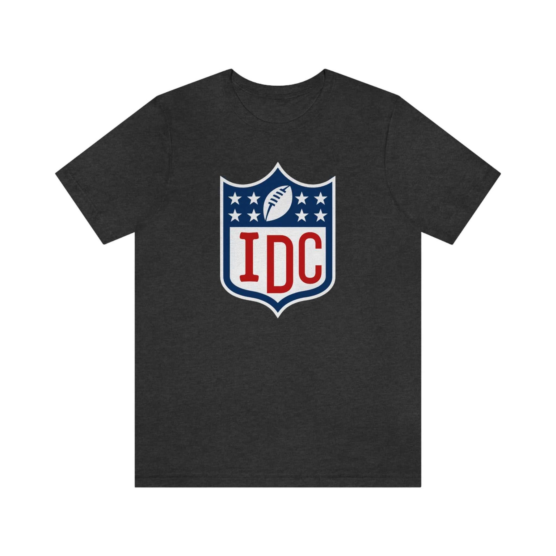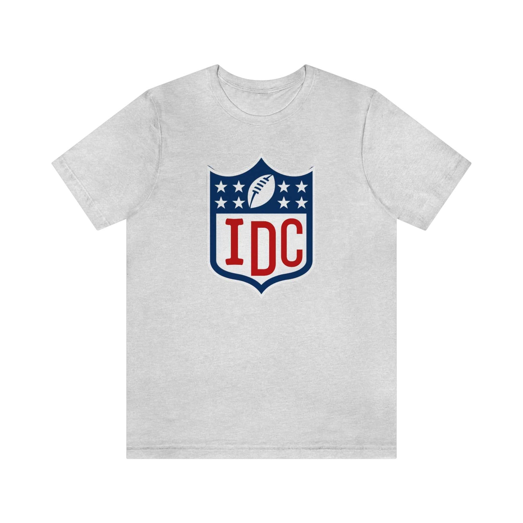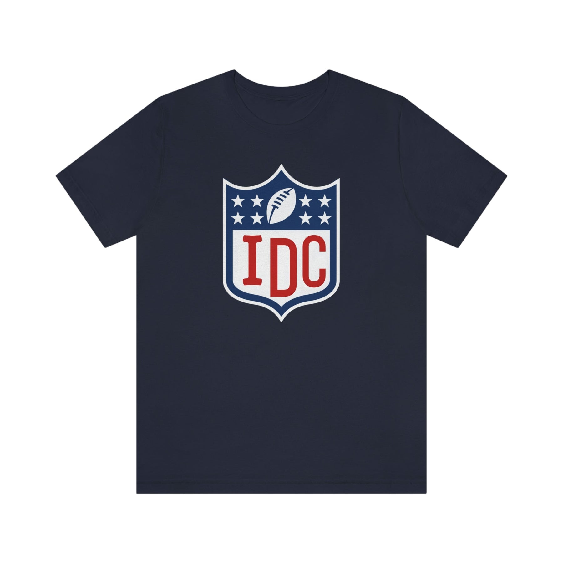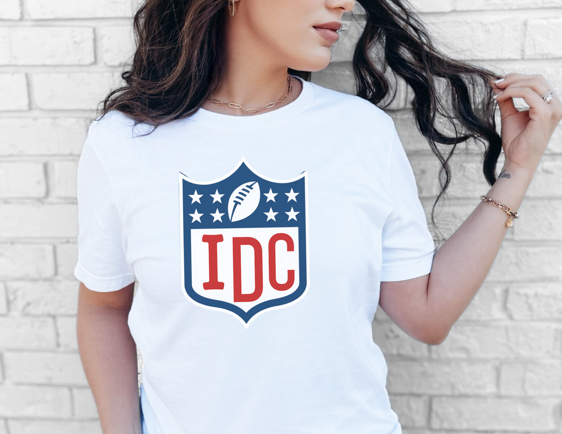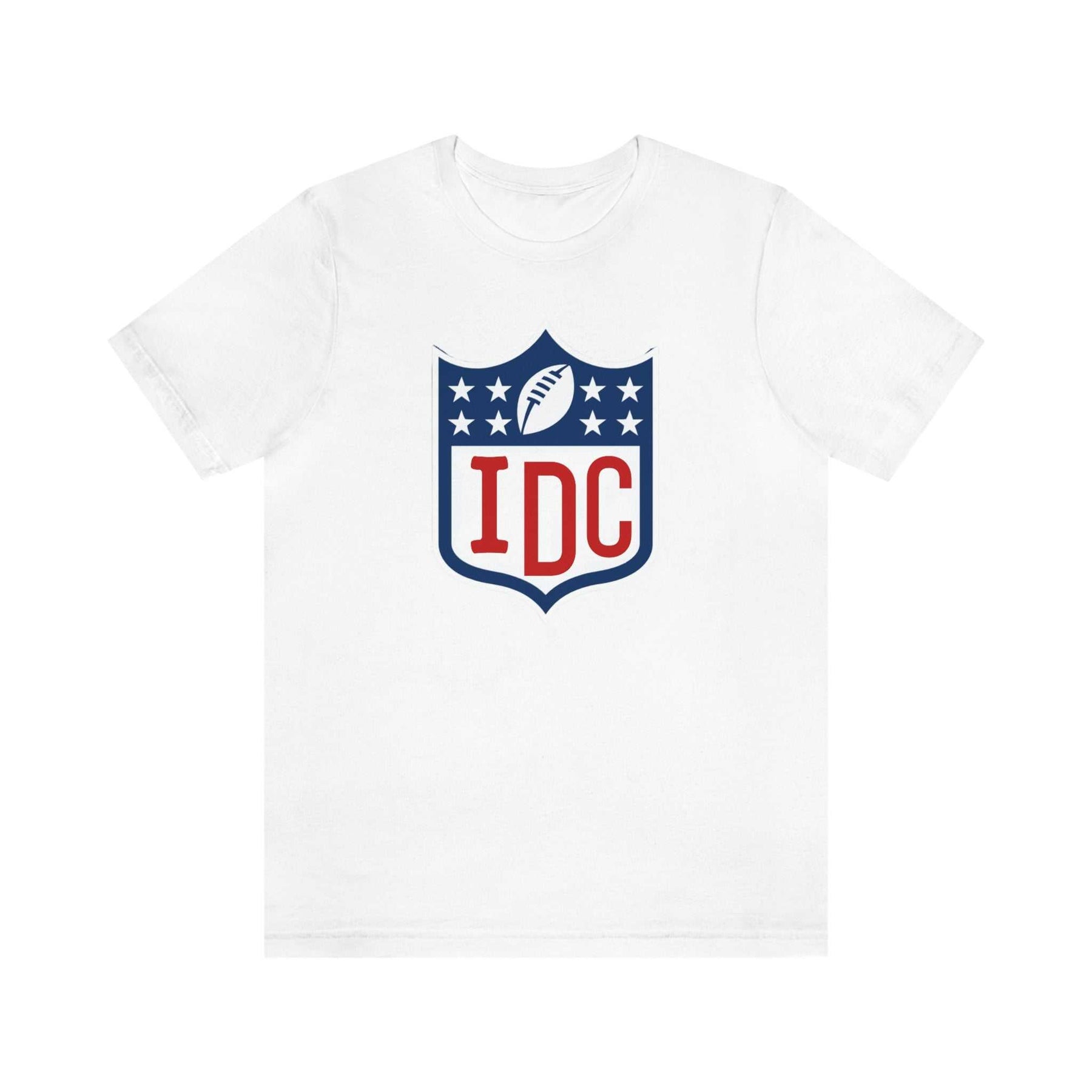 A classic NFL I Don't Care Tee in white, showcasing a woman in a white shirt. Unisex fit with ribbed knit collars, taping on shoulders, and 100% cotton fabric. Sizes XS to 3XL.