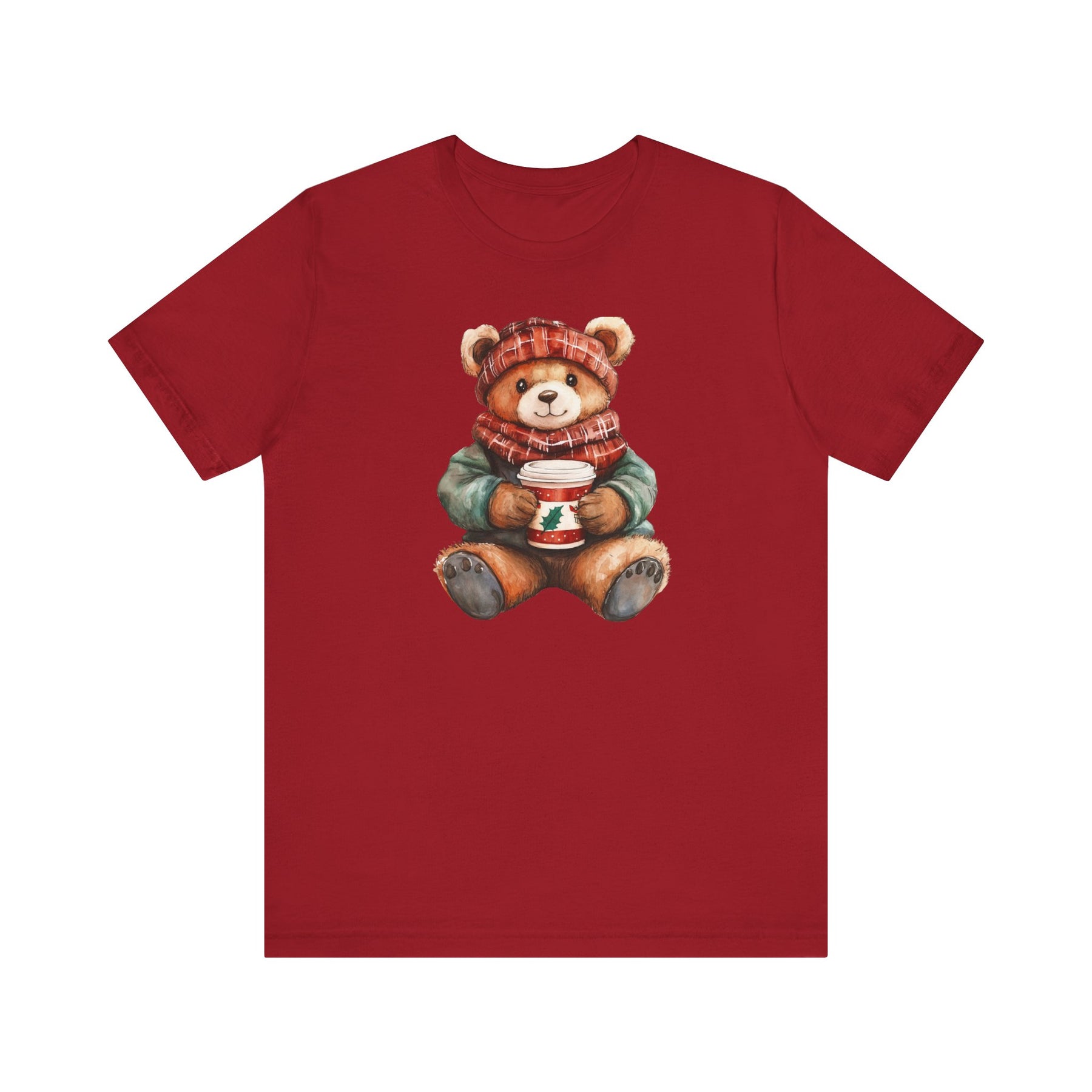 Old Money Christmas Bear Tee featuring a teddy bear in winter attire holding a festive coffee cup, printed on a classic red unisex jersey T-shirt.