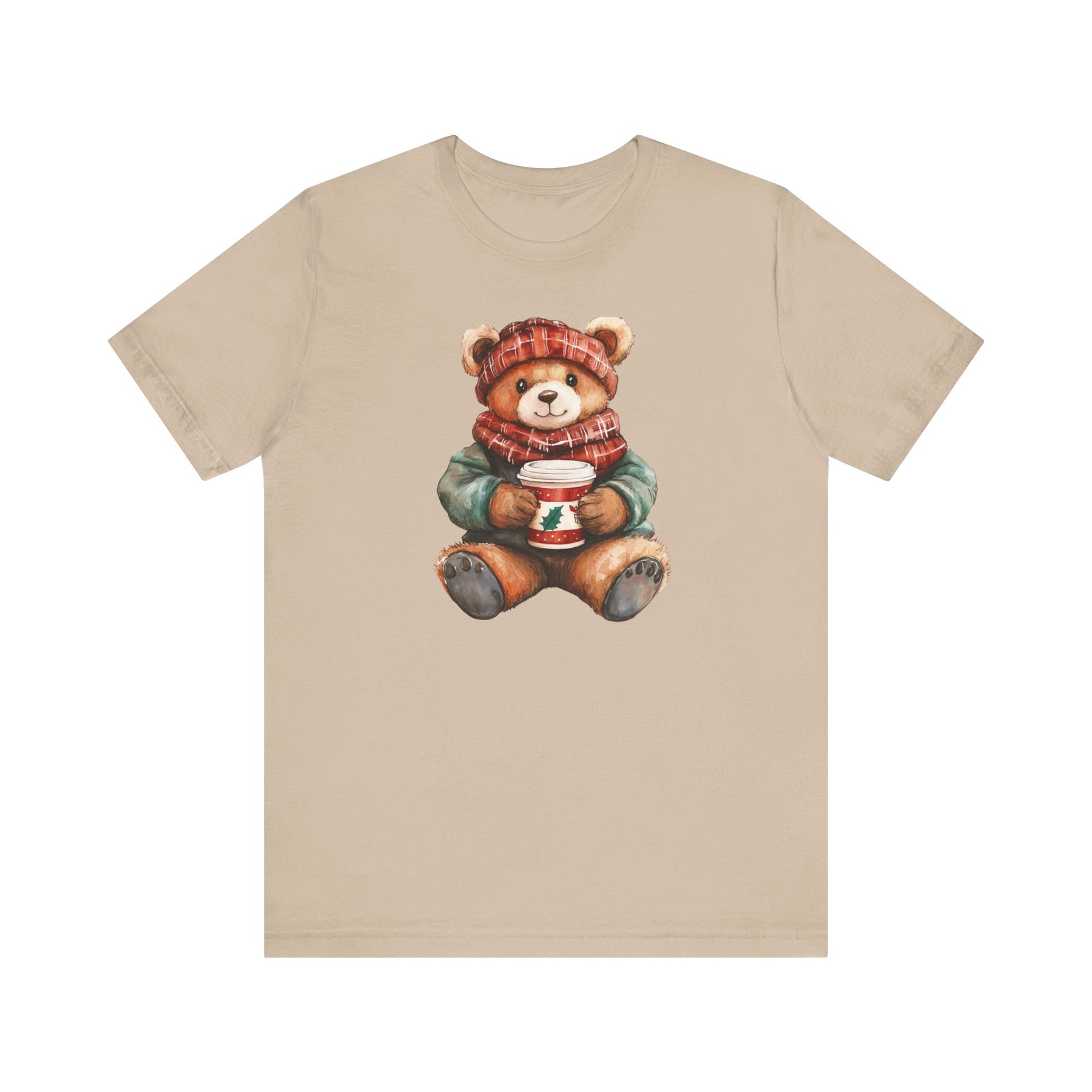 Old Money Christmas Bear Tee featuring a teddy bear in a red hat and scarf, holding a holiday cup, printed on a soft beige short-sleeve T-shirt.