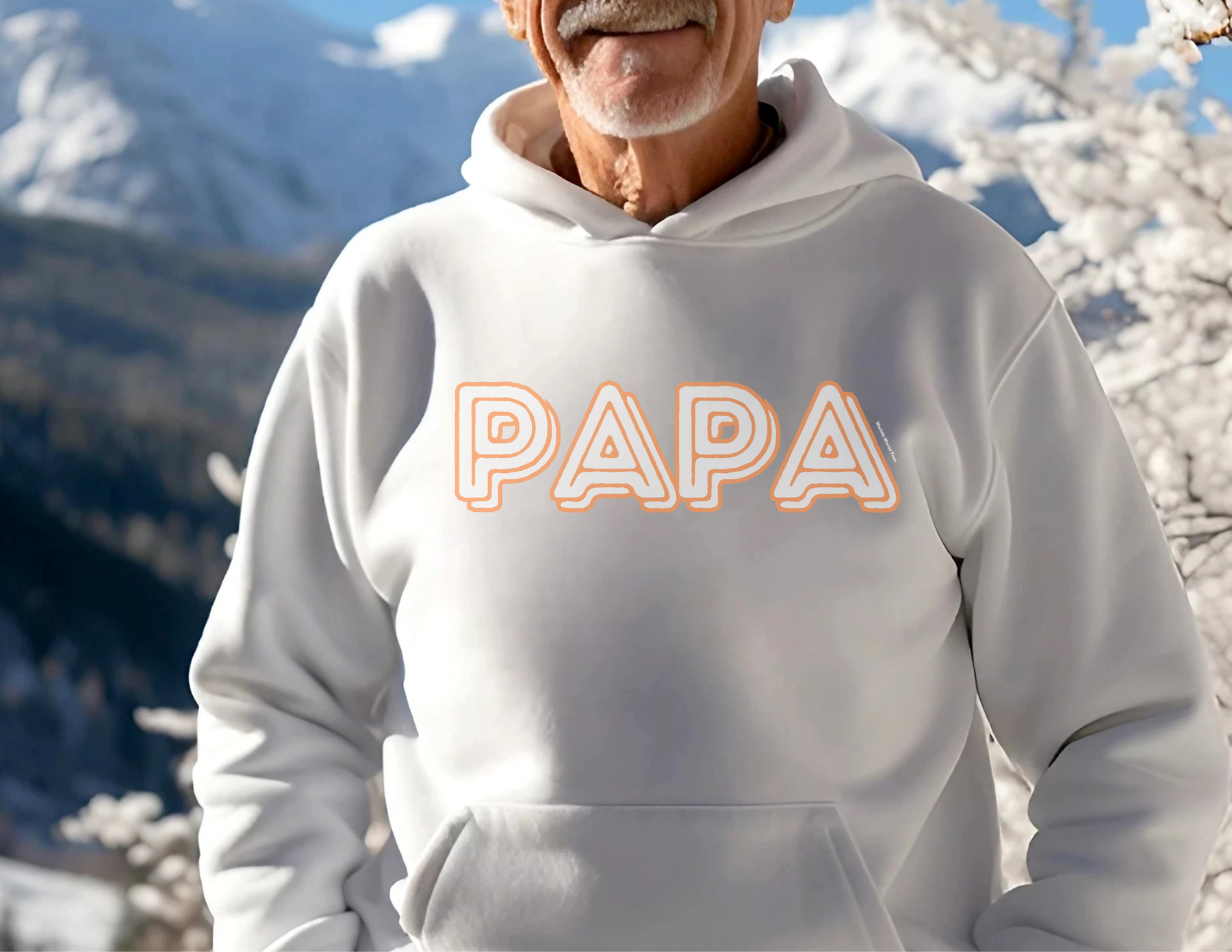 A white Papa Hoodie with orange letters, featuring a logo and kangaroo pocket. Unisex, cotton-polyester blend for warmth and comfort on cold days. Medium-heavy fabric, classic fit, tear-away label.