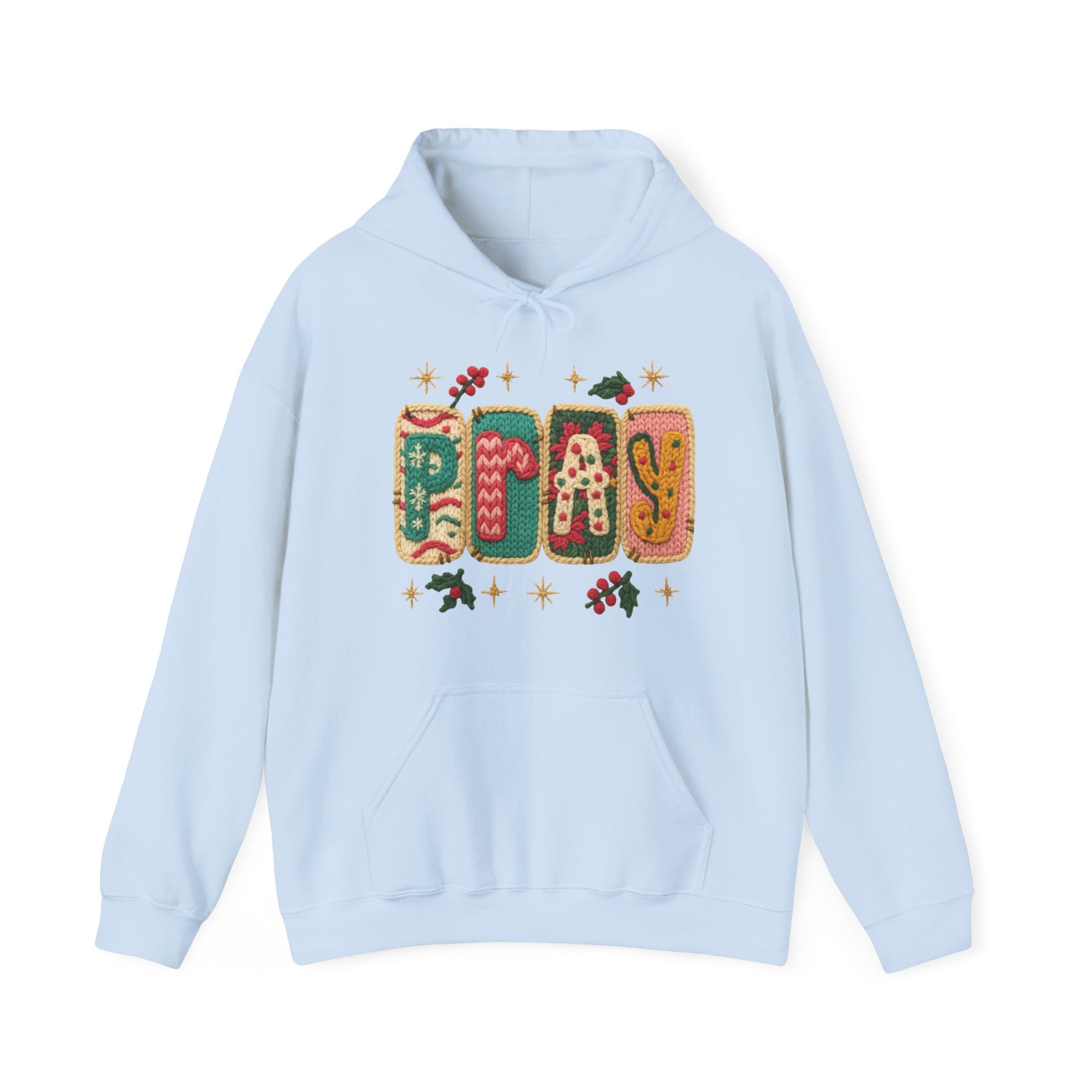 Light-blue Pray Hoodie with festive knitted-style graphic, featuring Pray blocks, holly sprigs, gold stars. Cozy unisex design with kangaroo pocket, drawstring hood.