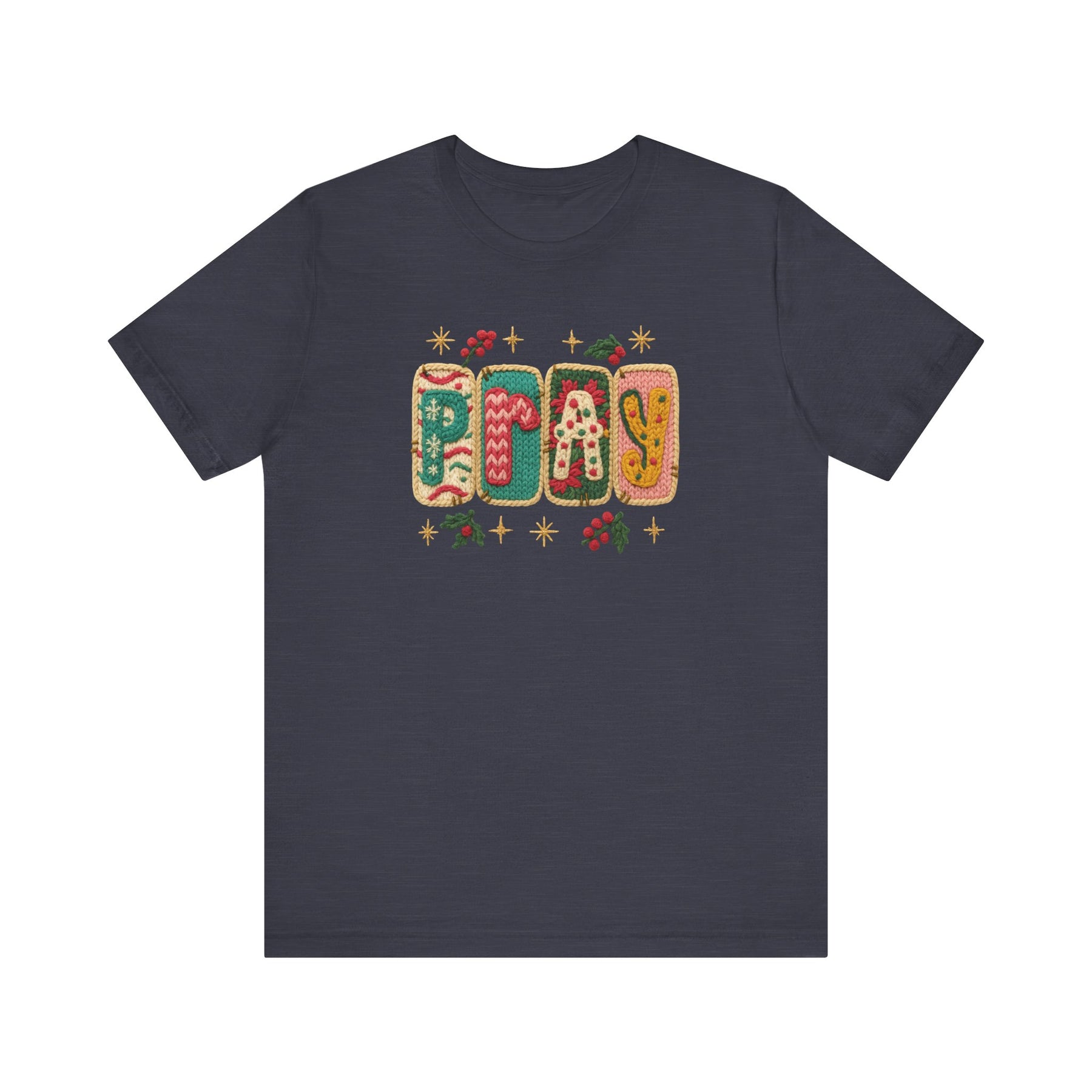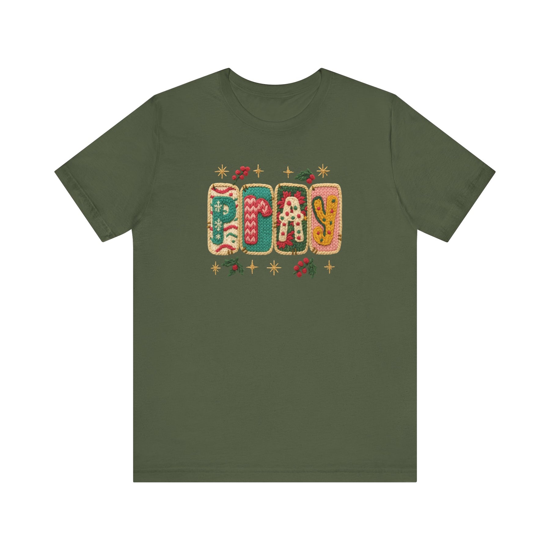 Pray Tee: Olive-green crew-neck displaying PRAY in festive knit-style graphics with holiday motifs. Cozy, unisex fit, crafted from soft cotton.
