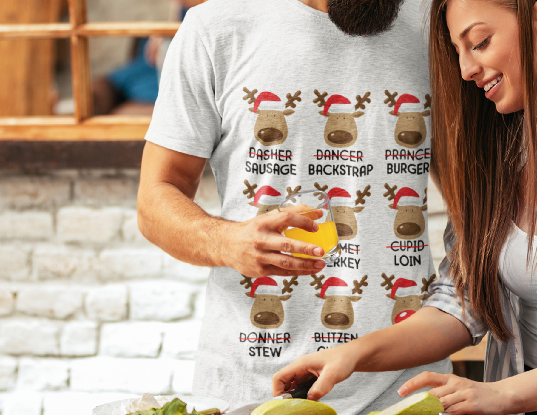 A premium Reindeer Names Tee for men, featuring a man and woman outdoors, holding orange juice glasses. Comfy, light, ribbed knit collar, roomy fit, 100% cotton. Sizes XS-4XL.