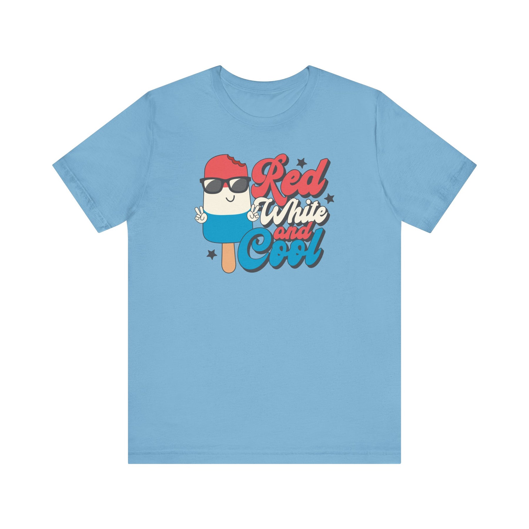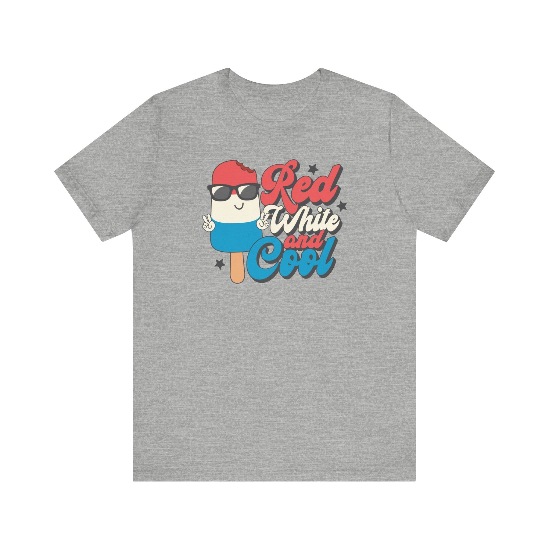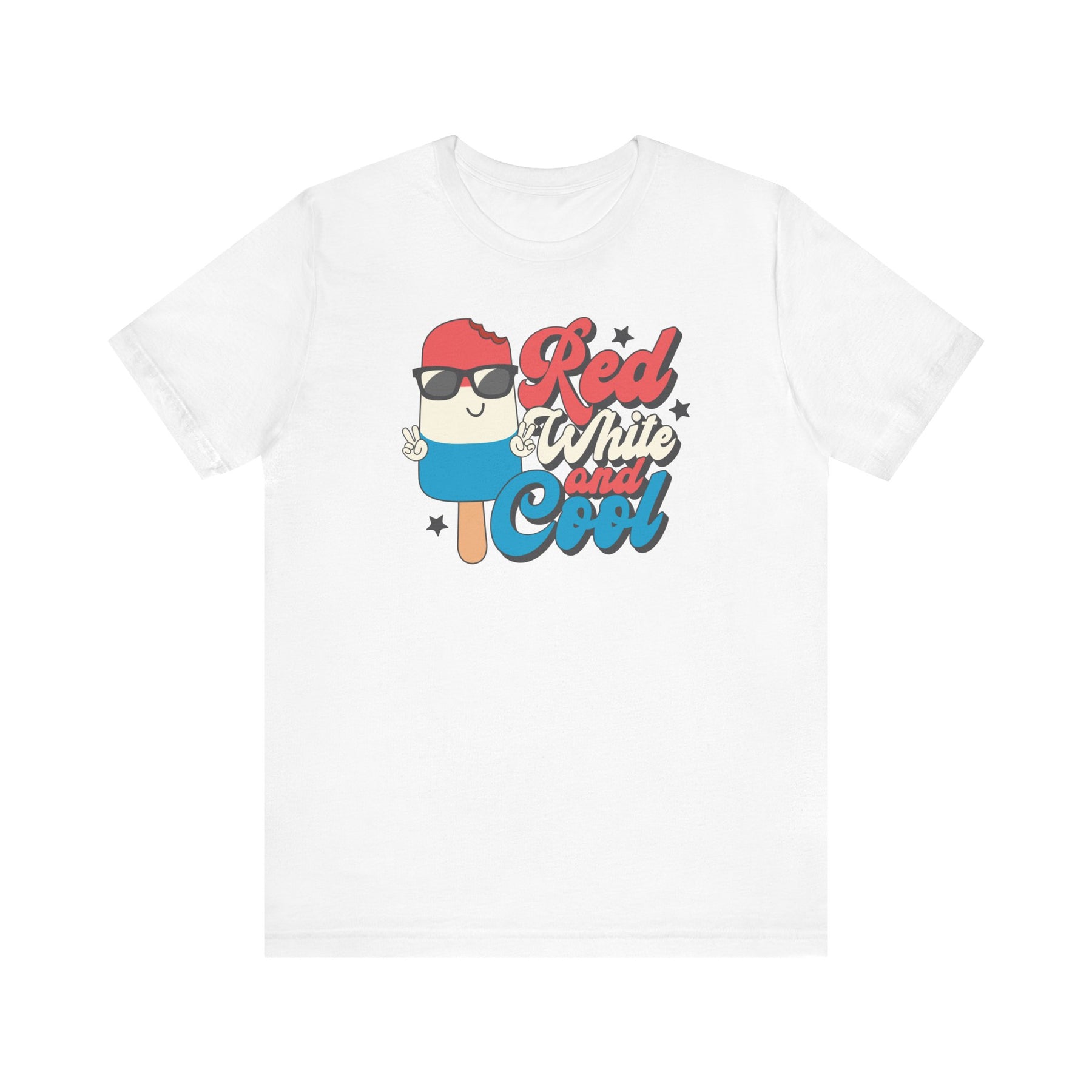 Red White and Cool Tee, a classic unisex jersey short sleeve, featuring ribbed knit collars and tapered shoulders for a perfect fit, ideal for casual wear.