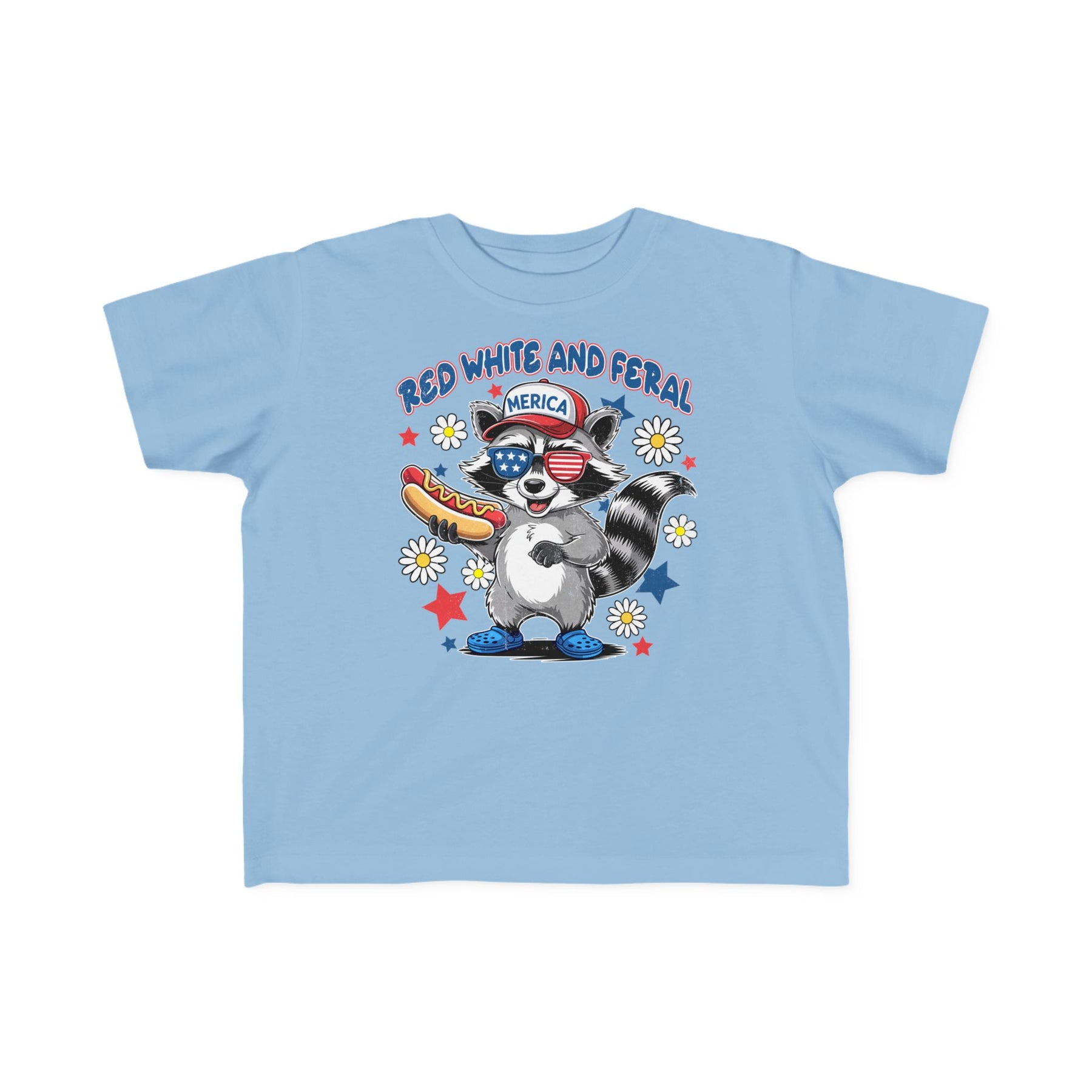 Toddler tee with soft fabric, classic fit, and durable print; titled Red, White and Feral 4th Toddler Tee, ideal for sensitive skin and early adventures.