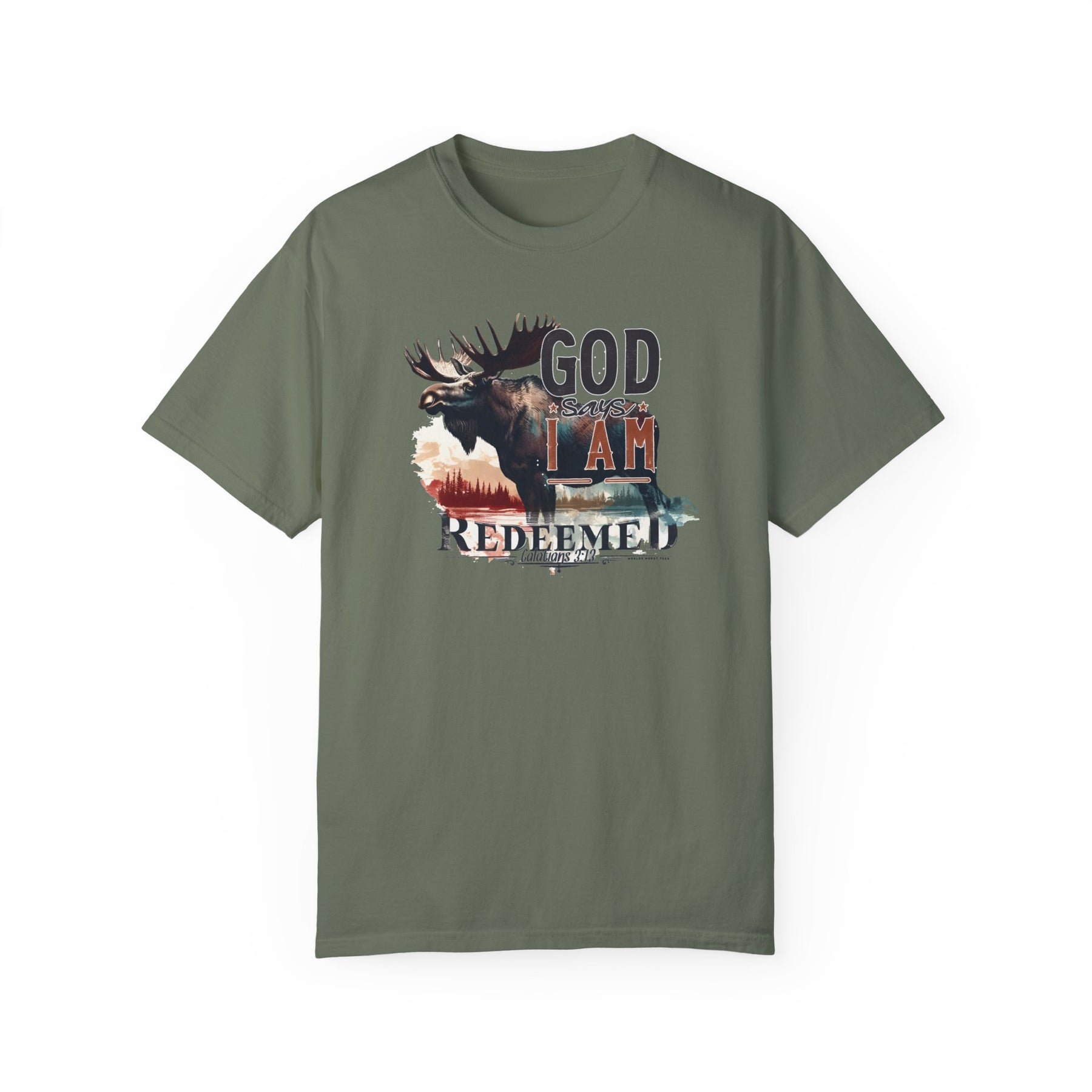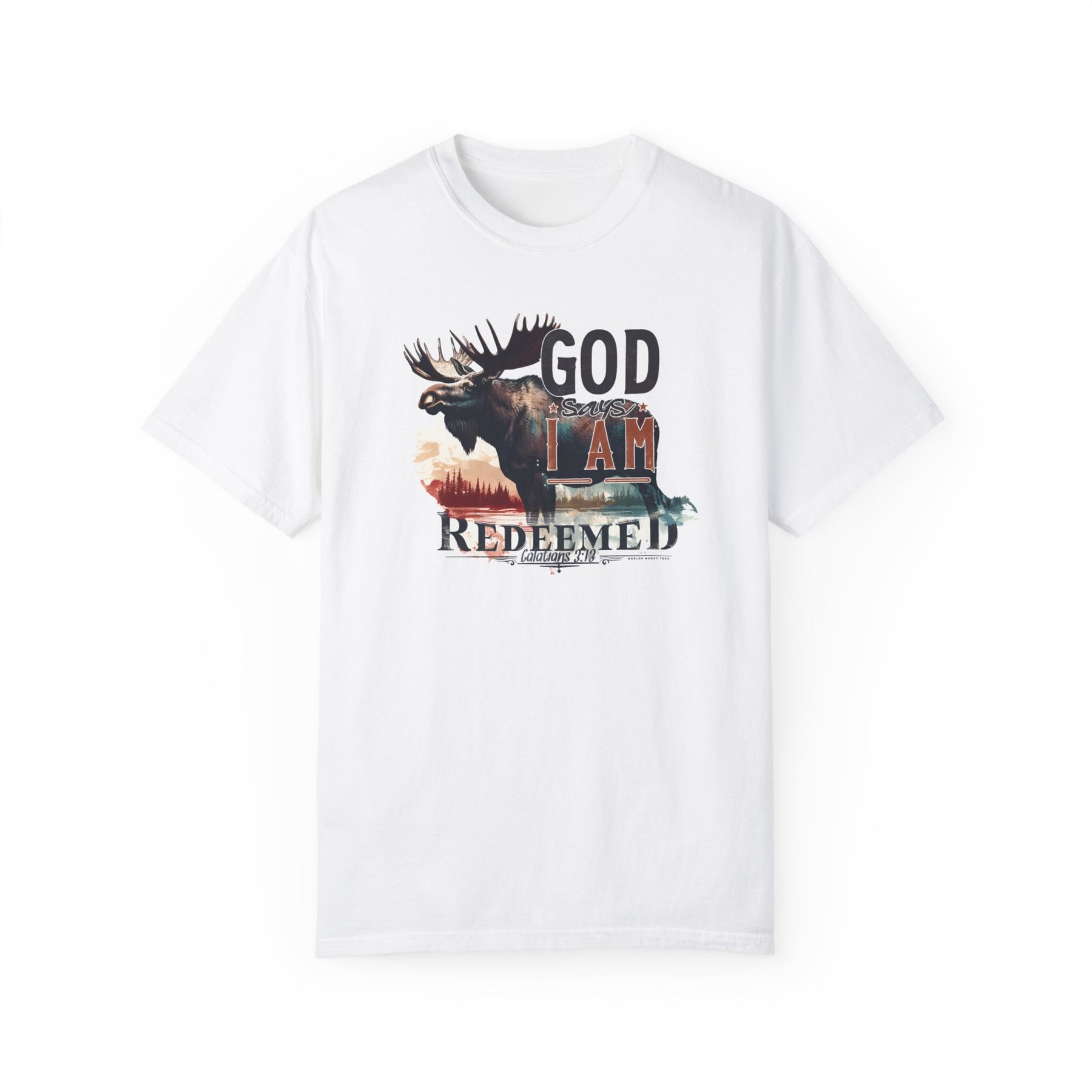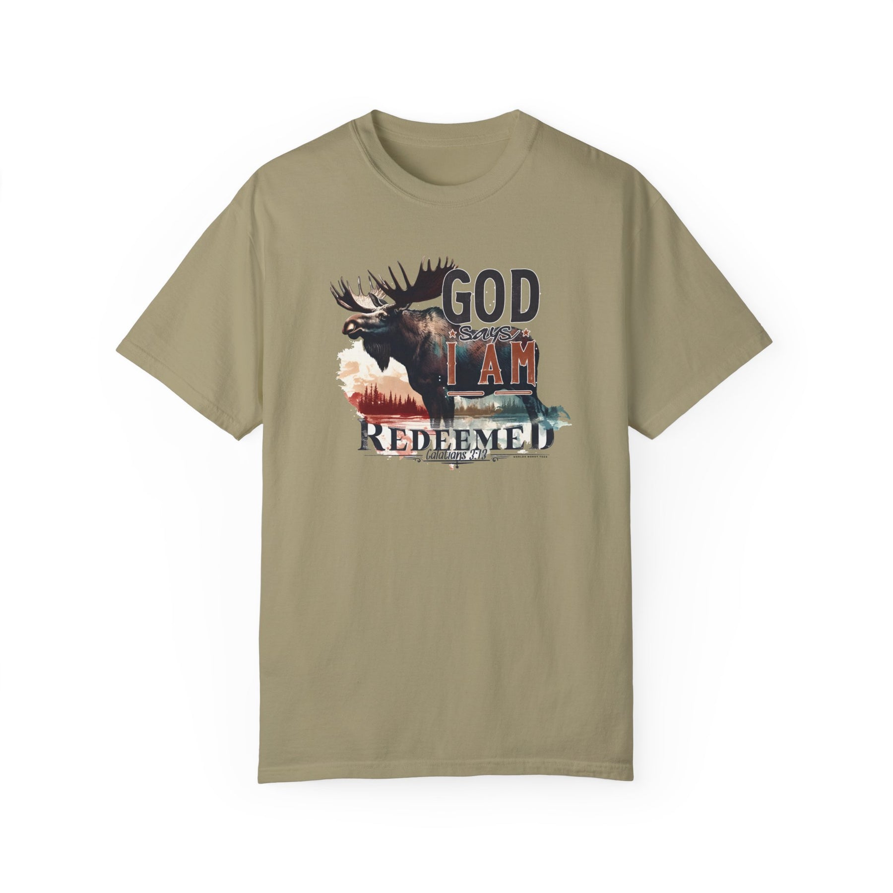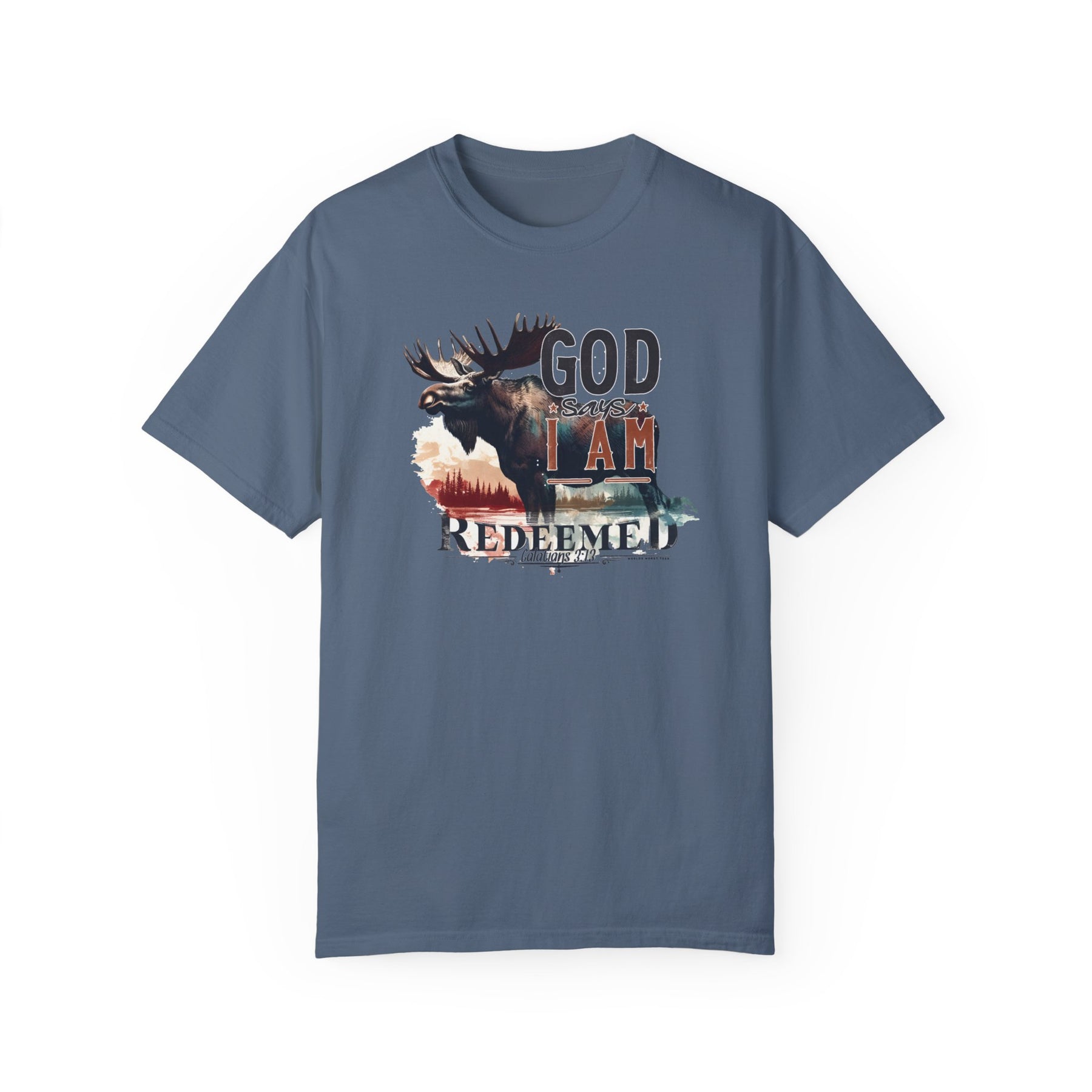 A moose-themed Redeemed Tee, 100% ring-spun cotton, garment-dyed for coziness. Relaxed fit, durable double-needle stitching, tubular shape. Sizes: S-3XL.