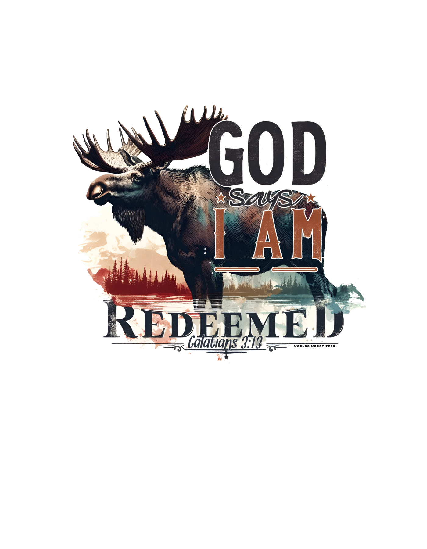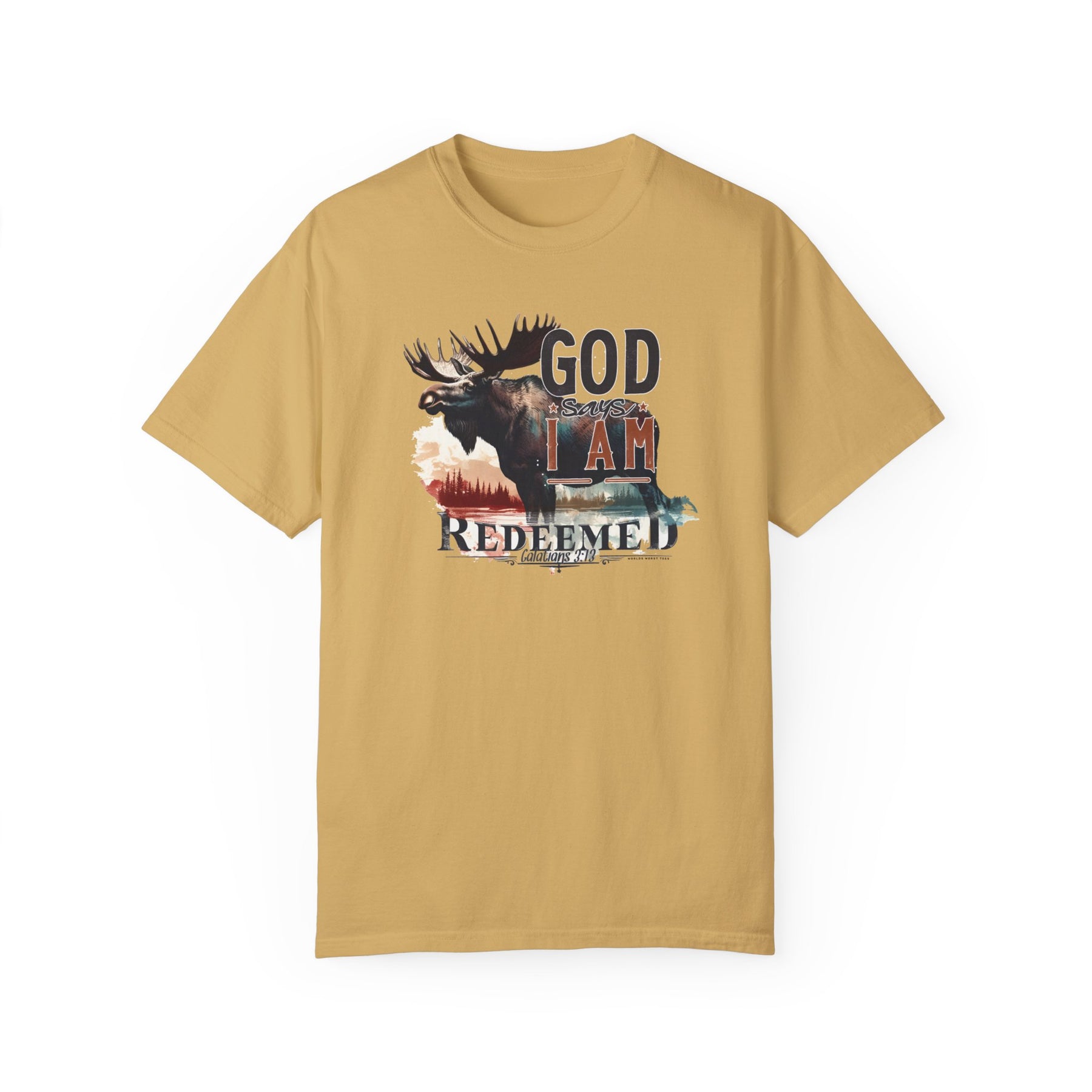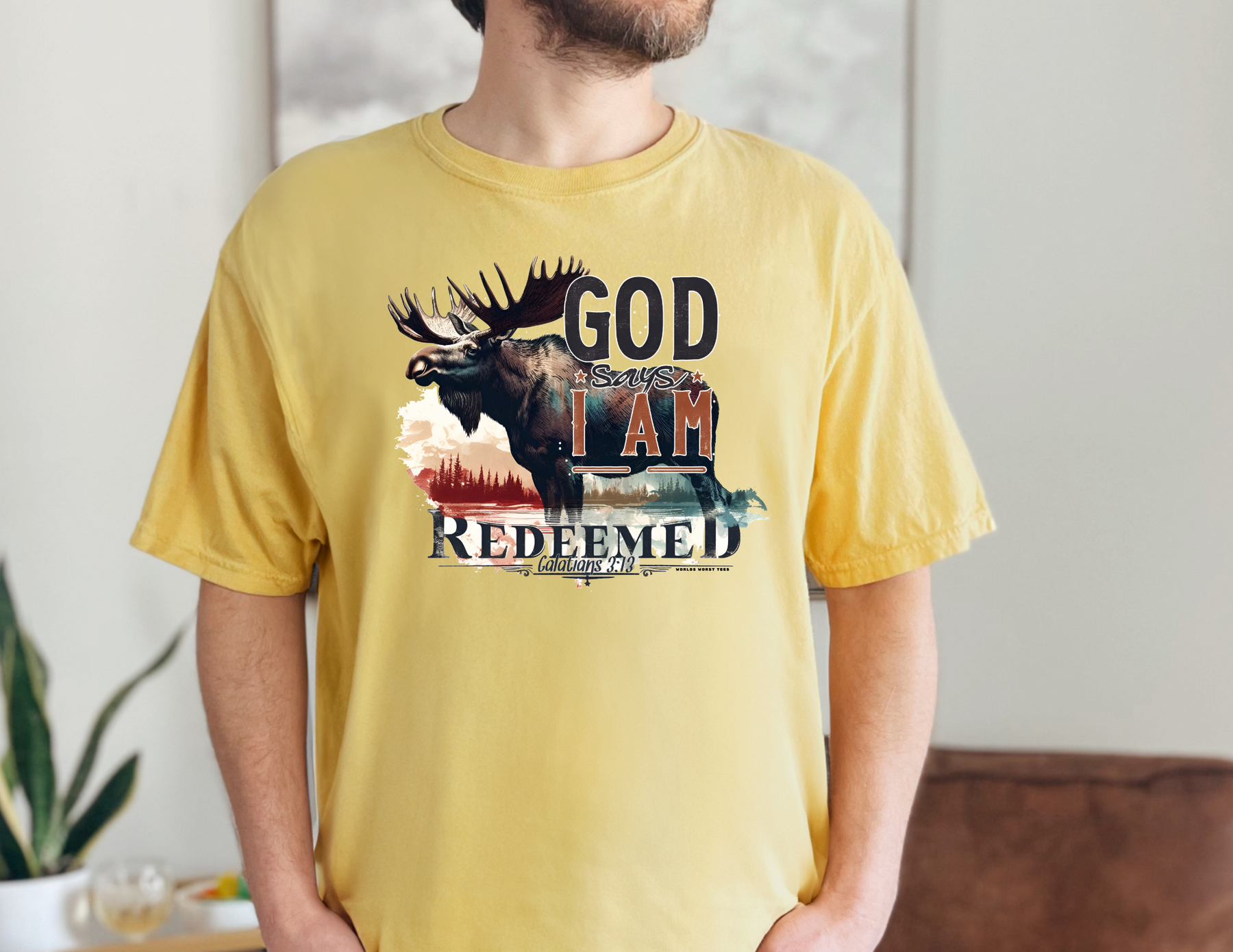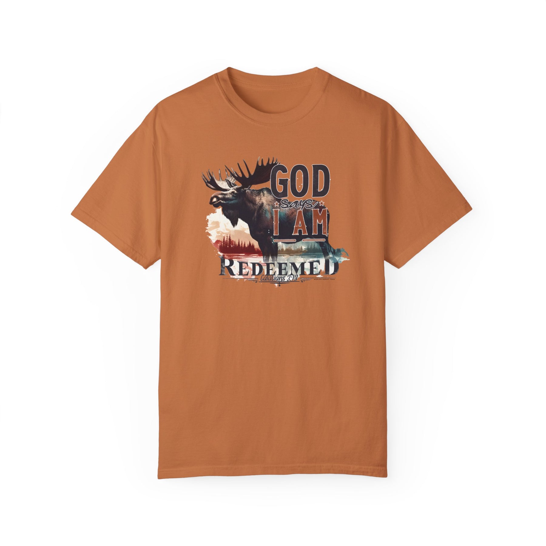 A moose-themed Redeemed Tee, 100% ring-spun cotton, garment-dyed for coziness. Relaxed fit, durable double-needle stitching, tubular shape. Sizes: S-3XL.