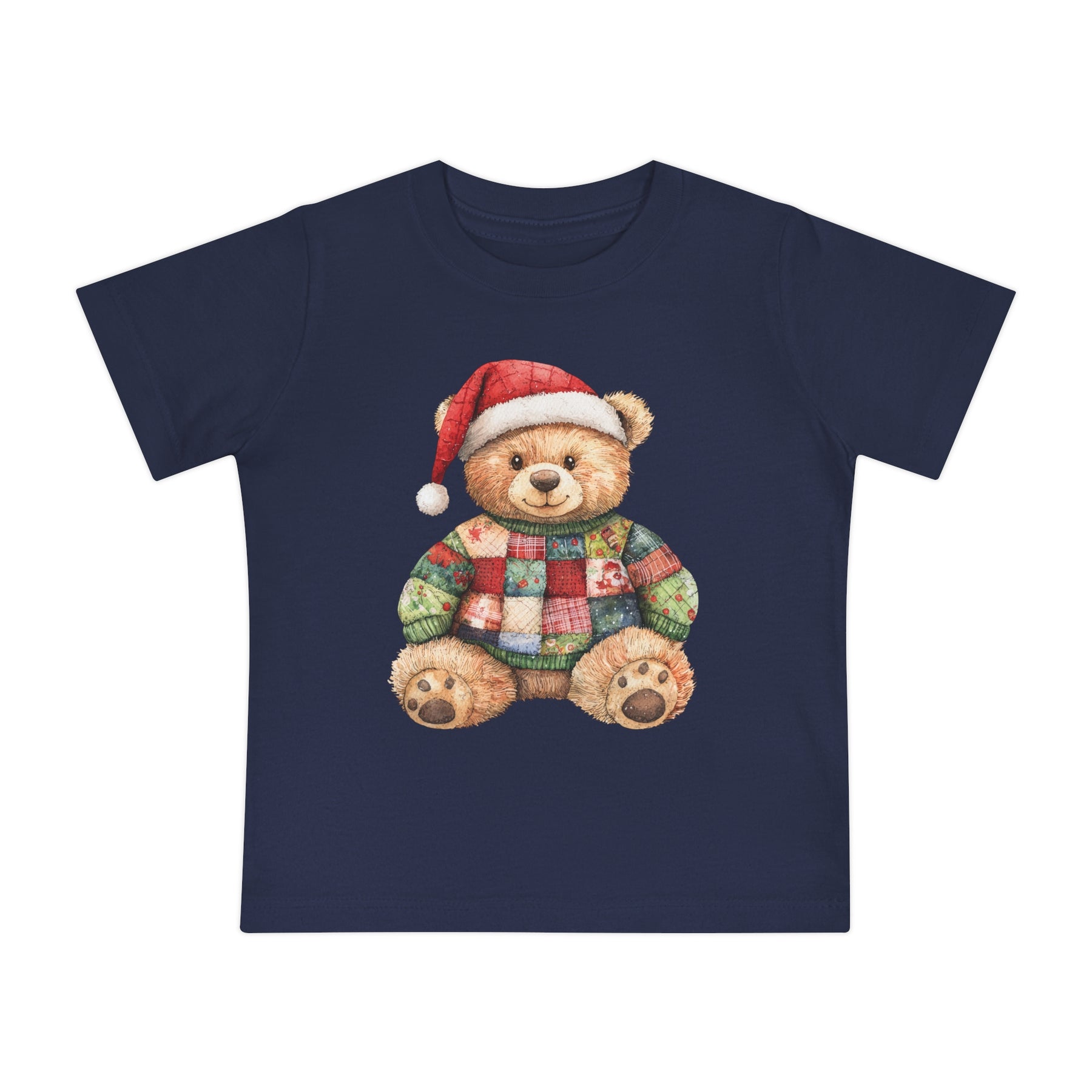 Christmas Bear Baby Tee featuring a teddy bear with a Santa hat and patchwork sweater, ideal for baby's first stylish steps. Made of soft, durable cotton.