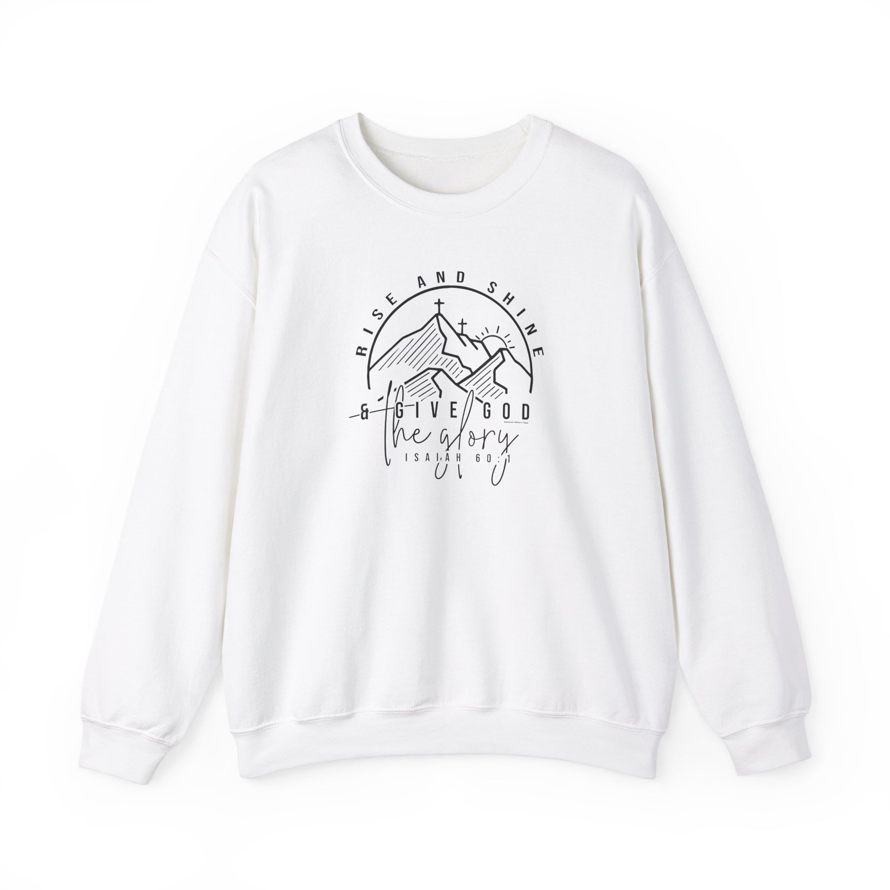 A white Rise and Shine Crew sweatshirt with a graphic design featuring a logo of a cross and mountains. Unisex heavy blend, 50% cotton, 50% polyester, ribbed knit collar, no itchy side seams, loose fit.