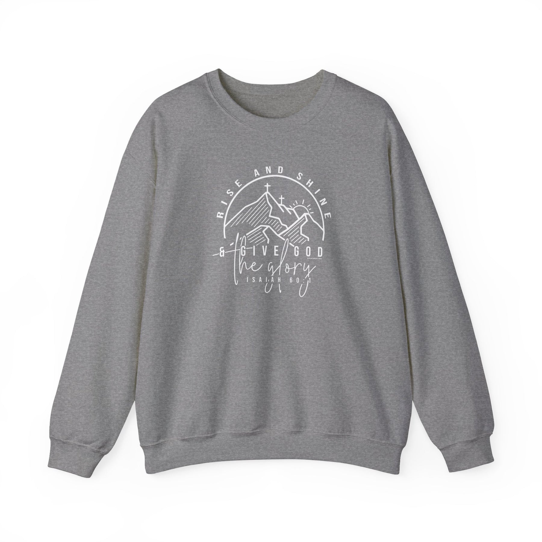 Unisex Rise and Shine Crew sweatshirt, grey with white text graphic design. Ribbed knit collar, no itchy side seams, loose fit, 50% cotton, 50% polyester, medium-heavy fabric. Sizes S-5XL.