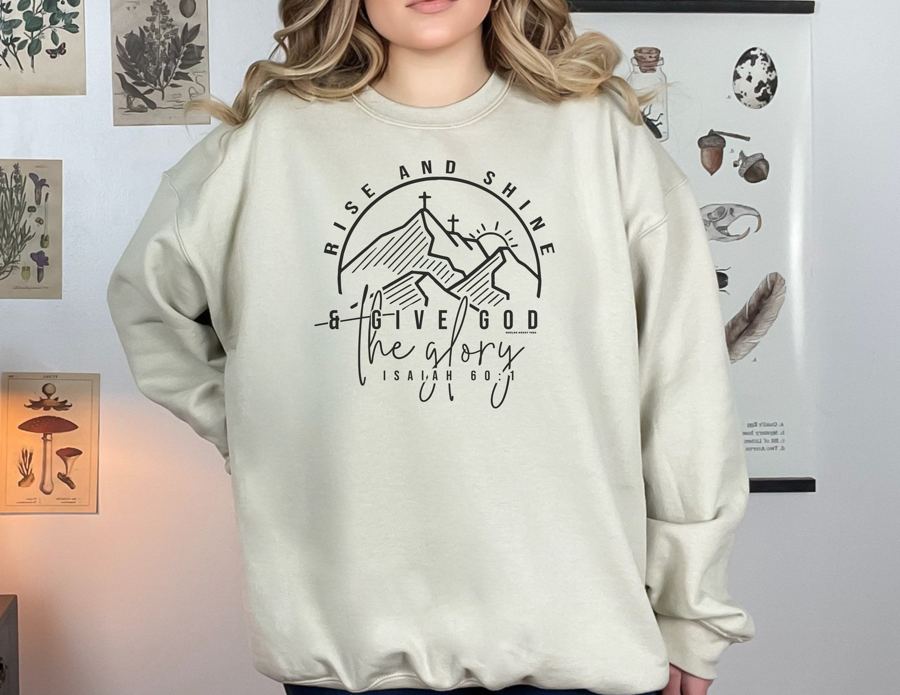 A black crewneck sweatshirt with white text, featuring a cross and mountains logo. Unisex Rise and Shine Crew made of 50% cotton, 50% polyester blend, ribbed knit collar, and no itchy side seams. Sizes from S to 5XL.