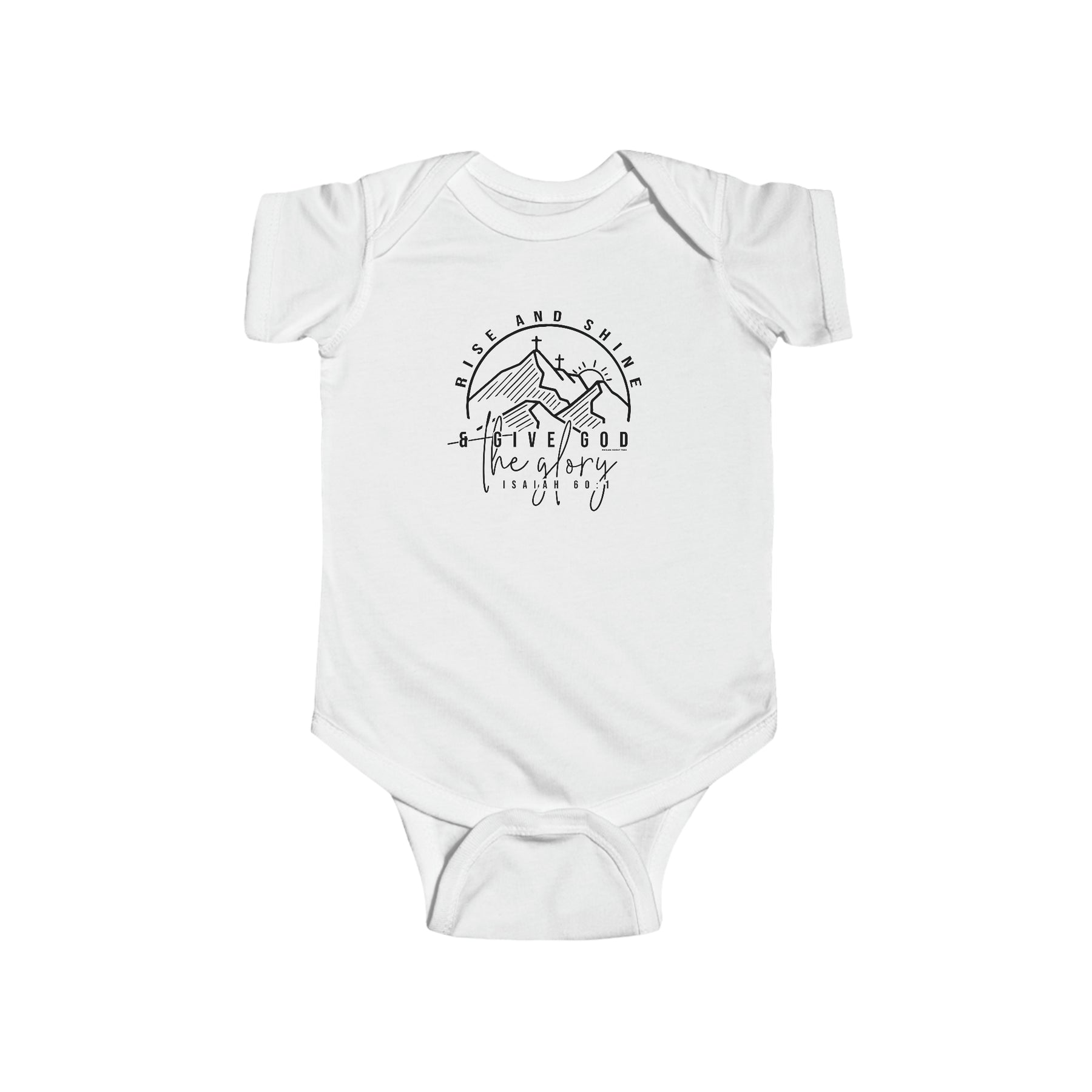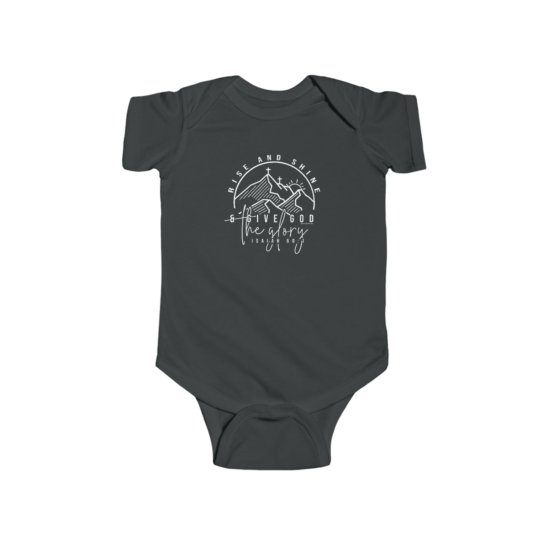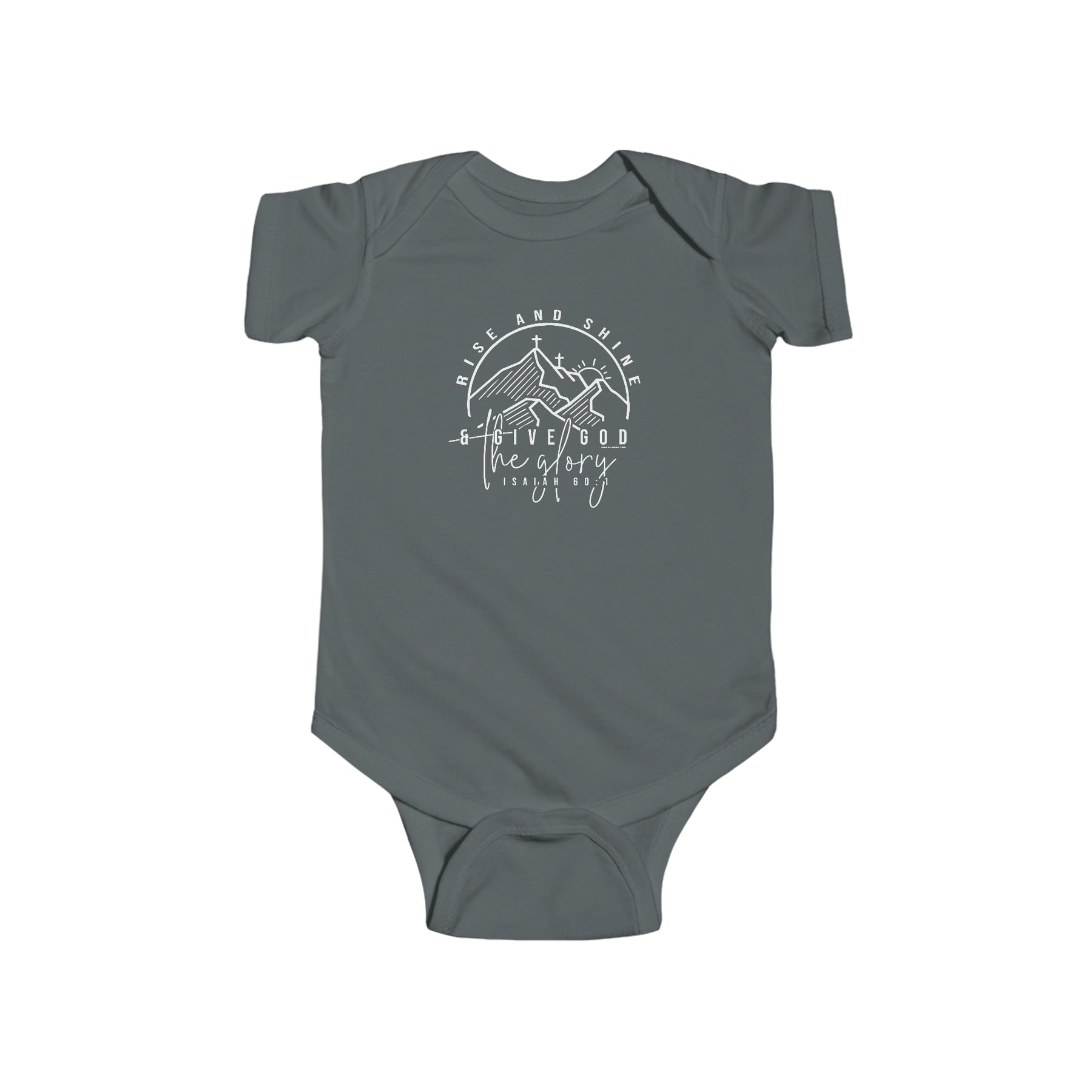 A grey baby bodysuit with white text, featuring a logo with a cross and mountains. Rise and Shine Onesie: 100% cotton, light fabric, ribbed knitting for durability, plastic snaps for easy changing. From Worlds Worst Tees.