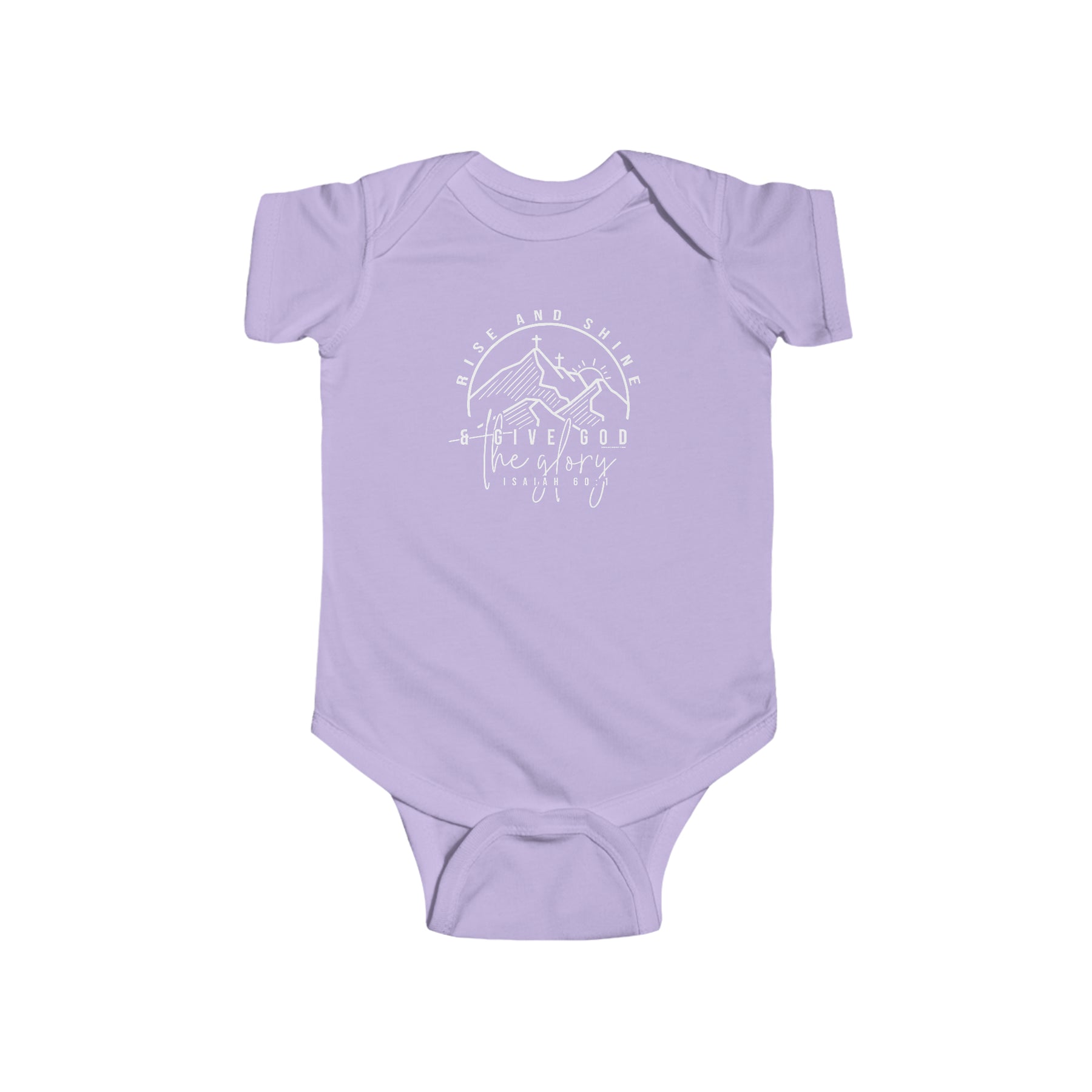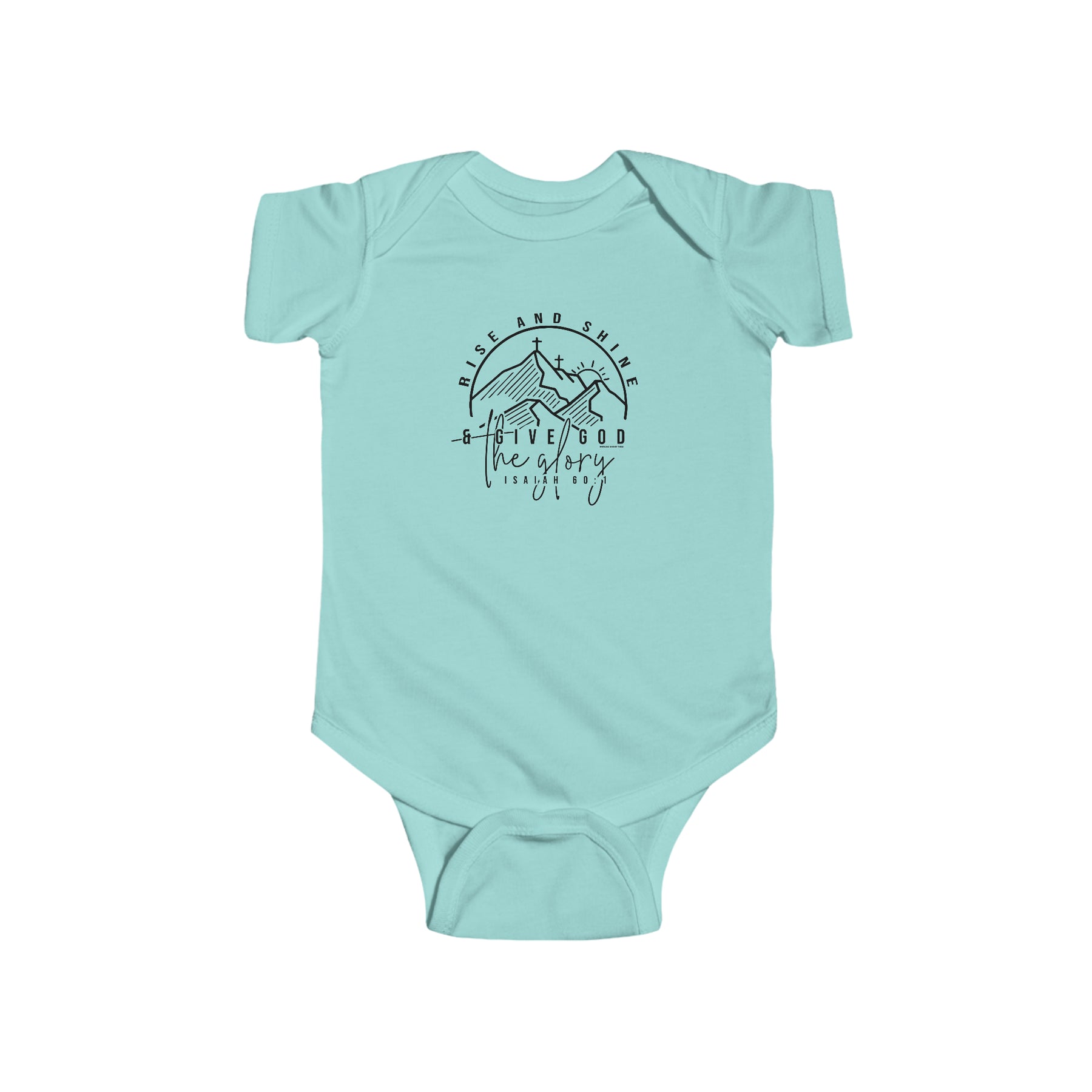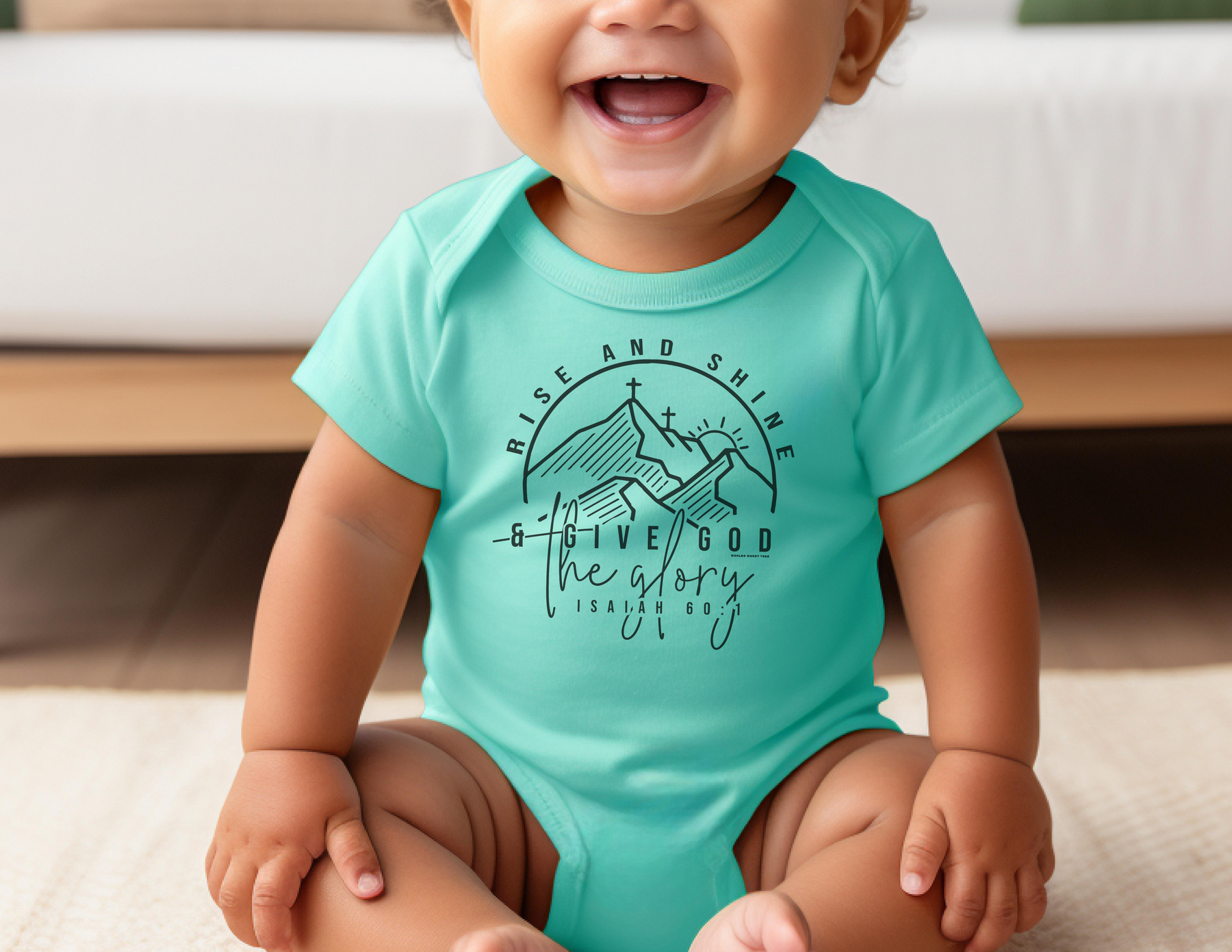 A grey baby bodysuit with white text, featuring a logo with a cross and mountains. Rise and Shine Onesie: 100% cotton, light fabric, ribbed knitting for durability, plastic snaps for easy changing. From Worlds Worst Tees.